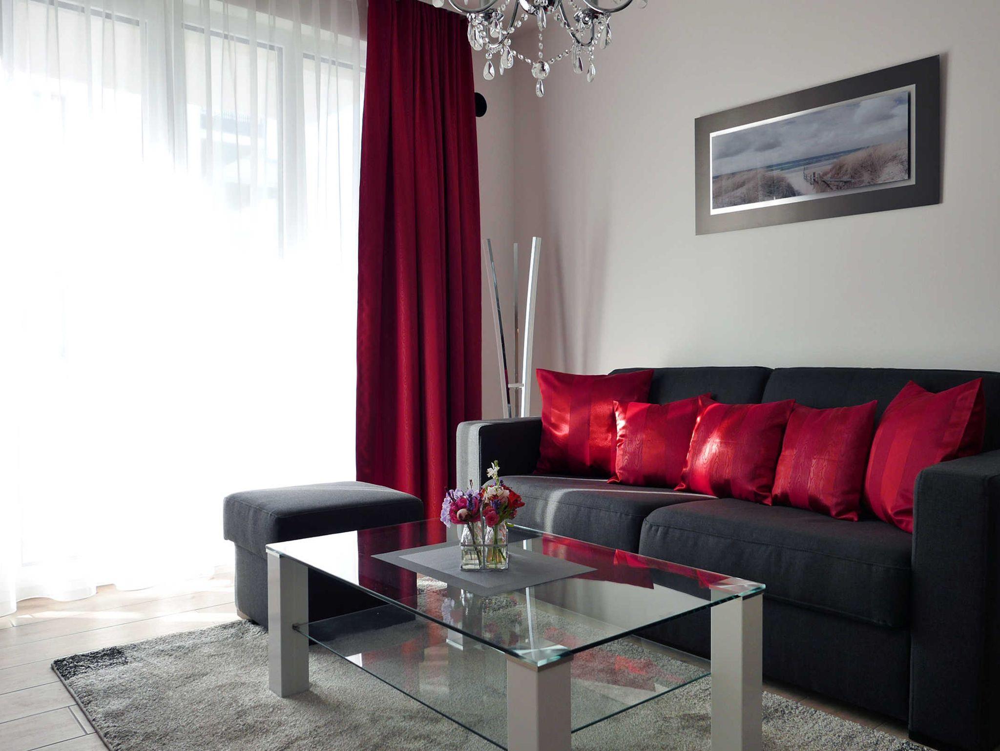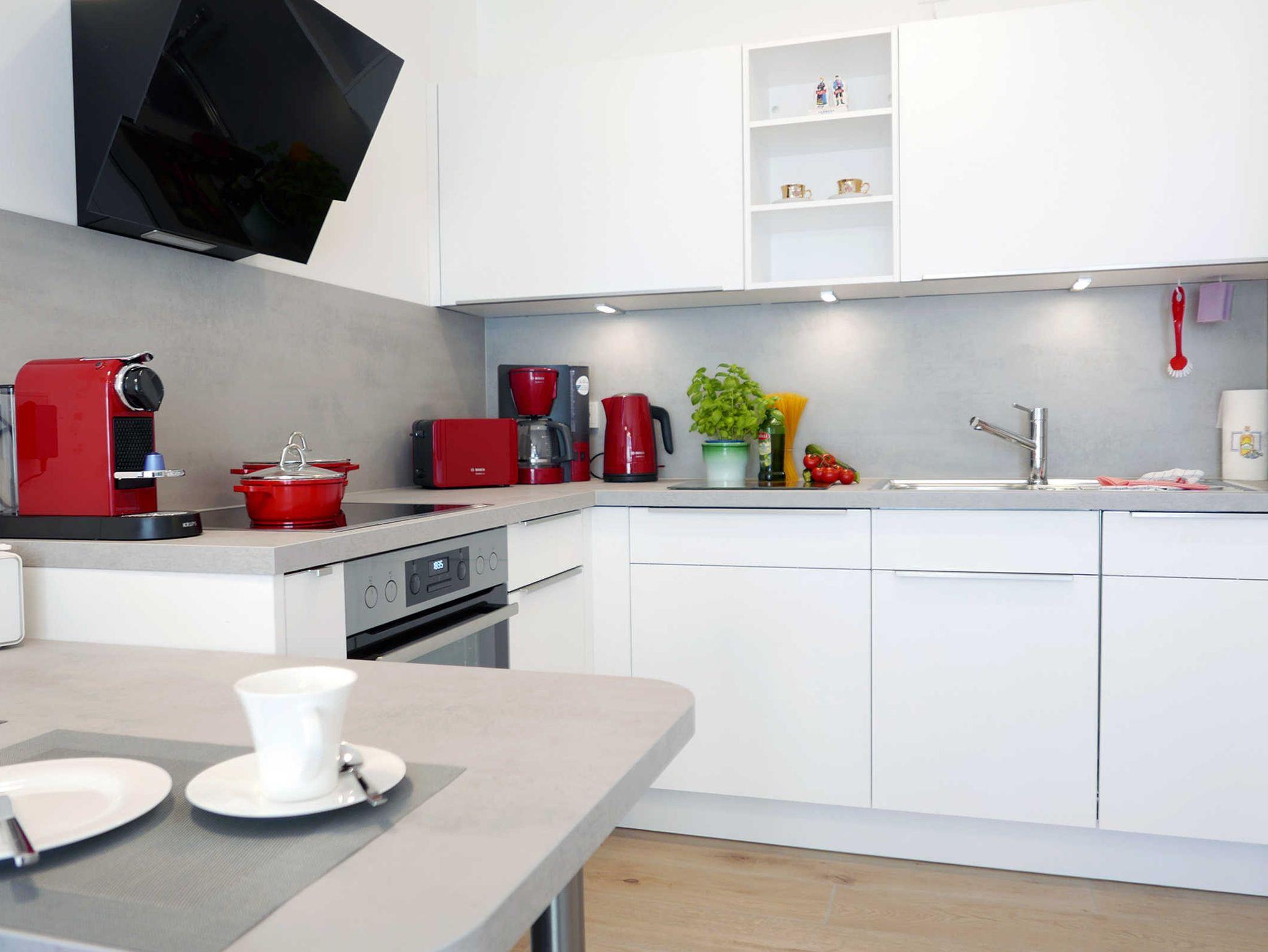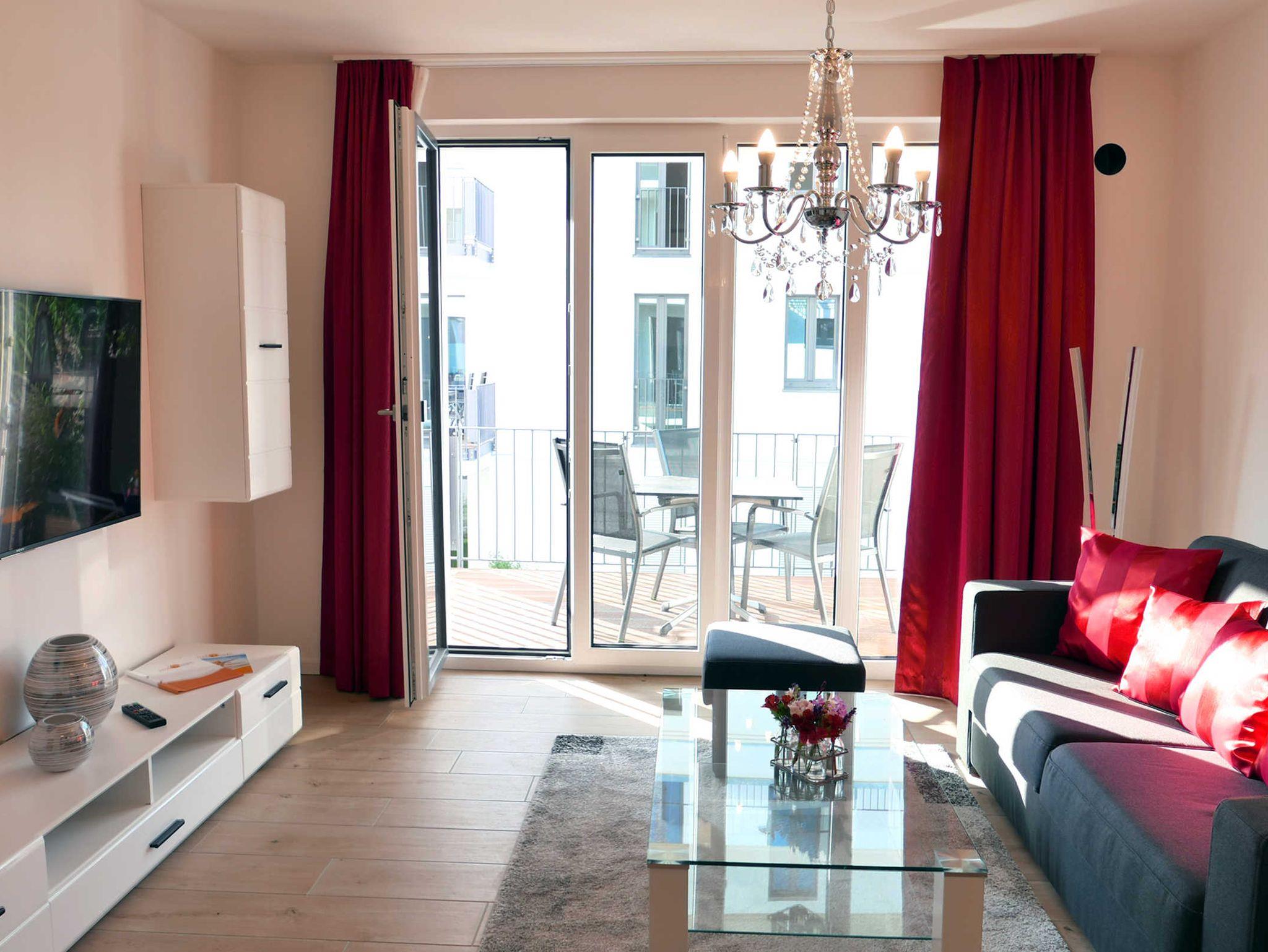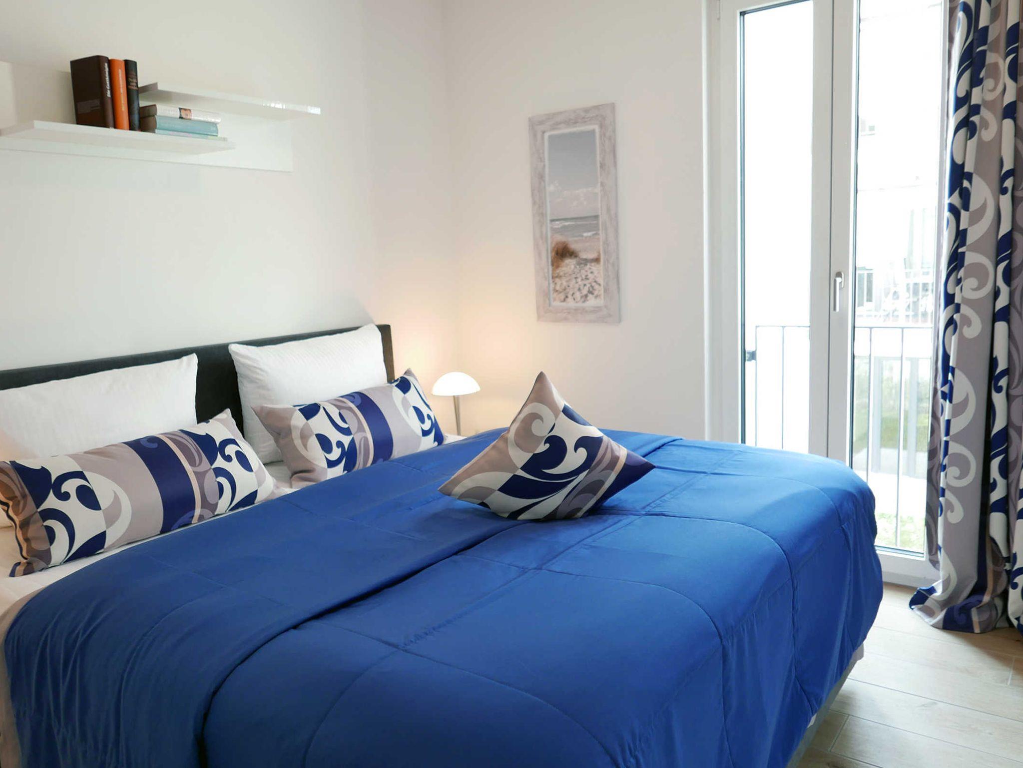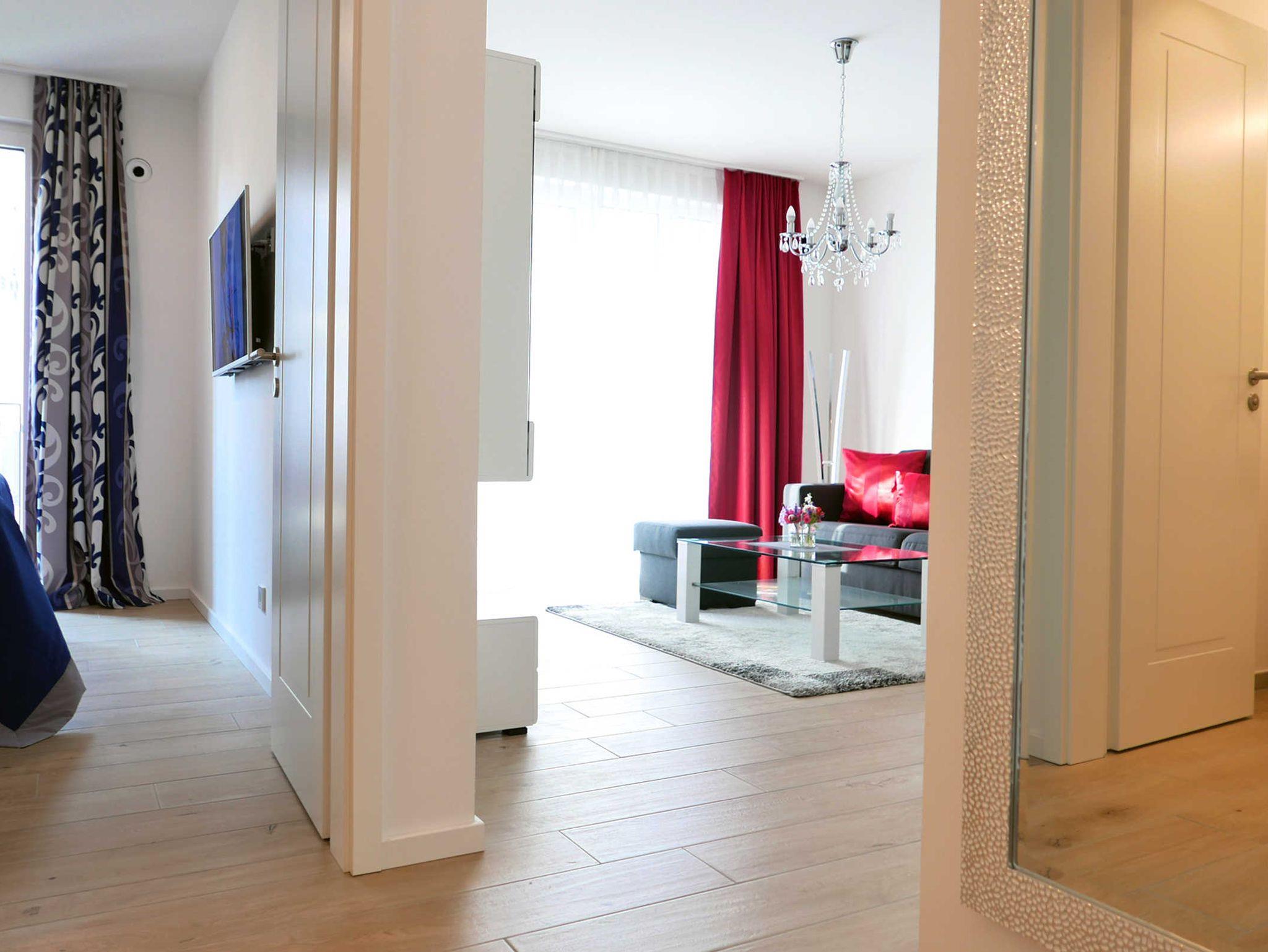 Die moderne helle Ferienwohnung für 3 Personen bietet allen Komfort für einen entspannten Urlaub. Im Wohnbereich befindet sich das gemütliche Schlafsofa mit einer Liegefläche von 150 x 200 cm. Von hier betreten Sie den Balkon mit seitlichen Meerblick. Der Küchenbereich ist mit hochwertigen Geräten gut ausgestattet und es gibt einen gemütlichen Esstisch. Im maritim gestalteten Schlafzimmer mit einem Doppelbett von 180 x 200 cm befindet sich ein weiterer Fernseher. WLAN ist selbstverständlich vorhanden.