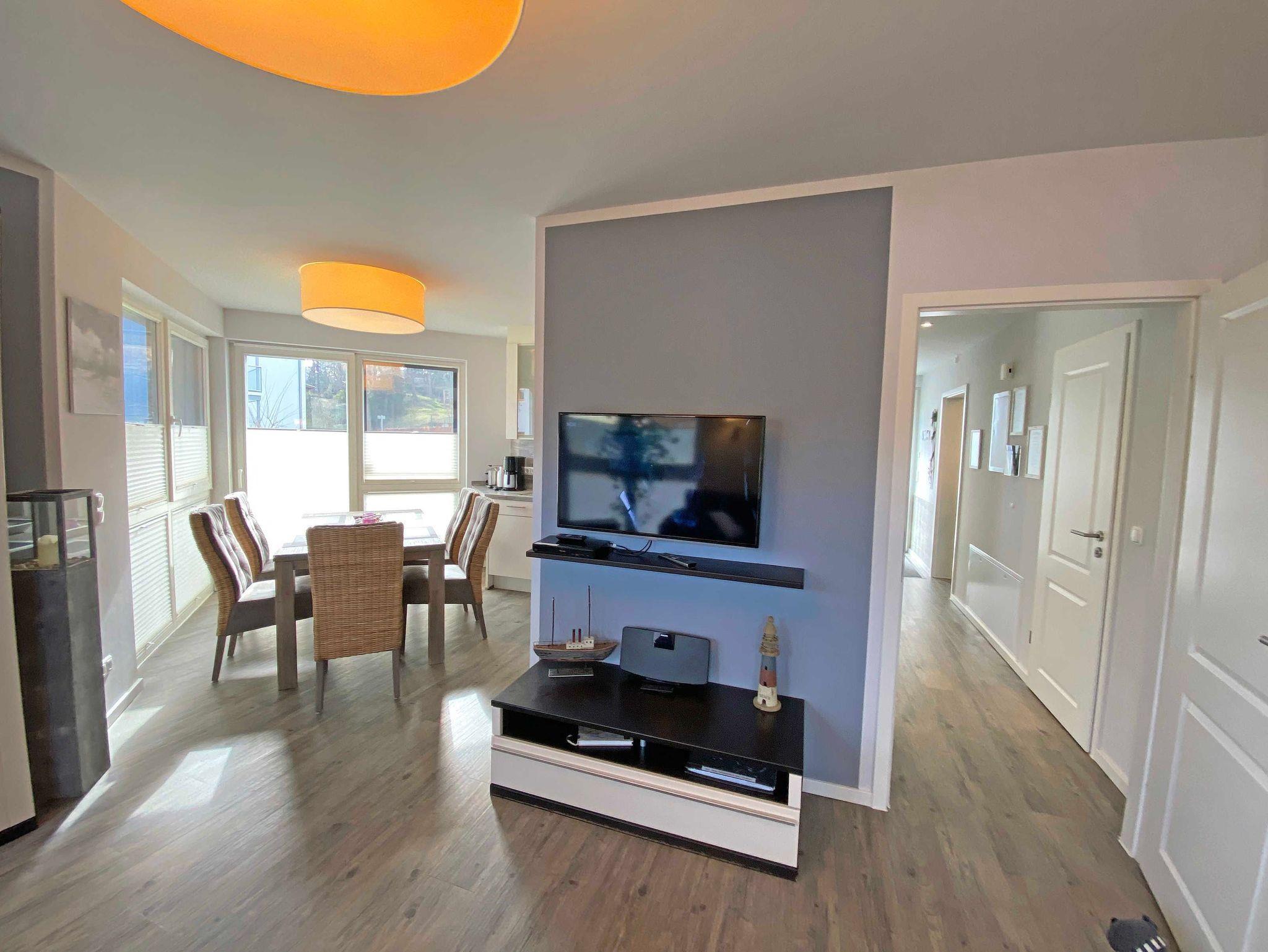 Die stilvoll und komfortabel eingerichtete Nichtraucherferienwohnung ?Strandgang? befindet sich im Erdgeschoss des Hauses. Es erwartet Sie eine 3 - Raumwohnung mit einer Wohnfläche von ca. 70 qm. Die Wohnung ist mit viel Liebe zum Detail ausgestattet und für maximal 4 Erwachsene + 1 Kleinkind bis 3 Jahre im Kinderreisebett. Der offene lichtdurchflutete Wohnbereich mit Kamin ist mit modernen maritimen Möbeln ausgestattet. Eine große, bequeme Ledercouch, Couchtisch mit Hocker, Sideboard und Vitrine sorgen für Gemütlichkeit vor dem Kamin. Für die Unterhaltung steht Ihnen ein Smart-TV mit Blu-Ray-Player zur Verfügung ebenso wie eine kleine Auswahl an Urlaubslektüre und CD`s. Auch auf einen kostenlosen Internetanschluss (WLAN) müssen Sie nicht verzichten. Auf der nach Süd-Osten zum Meer hin ausgerichteten und teilweise überdachten Terrasse, die Sie direkt vom Wohnbereich aus betreten können, stehen Ihnen eine Sitzgarnitur mit Sonnenschirm für ein gemütliches Frühstück in der Morgensonne oder ein Glas Wein am Abend zur Verfügung. Dabei genießen Sie einen wundervollen Blick auf die Strandpromenade und Gartenanlage. Die hochwertig eingerichtete Einbauküche besitzt ein Cerankochfeld, Backofen, Kühlschrank mit Gefrierkombination, Mikrowelle, Toaster, Wasserkocher, Kaffeemaschine, SENSEO Pad Kaffeemaschine mit Thermoskanne, Eierkocher und verschiedenen Küchenutensilien. Der Essbereich schließt sich an und besteht aus einem großen Esstisch und gepolsterten Stühlen. Für einen erholsamen Schlaf steht Ihnen ein Boxspringbett (1,80m x 2,00m) zur Verfügung, mit durchgehendem Topper in Komforthöhe. Nachttischablagen mit Wandleuchten, ein großzügiger Kleiderschrank, Kommode und ein Herrendiener ergänzen die Ausstattung im Schlafzimmer. Ein weiteres Schlafzimmer ist mit 2 Boxspringbetten (0,90m x 2,00m), Kleiderschrank, Schreibtisch mit Stuhl und einem zusätzlichen TV ausgestattet. In allen Räumen gibt es einen Sichtschutz mit Faltjalousien, Verdunkelung in den Schlafzimmern, sowie Insektenschutzgitter. Das große Bad mit Fenster, Waschtisch, Wandspiegel, ebenerdiger Regendusche, Wellnesswanne, WC, Haartrockner, Handtuchtrockner und Kosmetikspiegel ist Ihr Wellnessbereich! Mit der Sauna, Bio-Ofen und LED-Farblicht ist es ein Erlebnis im Sommer wie auch im Winter. Von der Sauna unter die Regendusche oder auch direkt in die Ostsee, danach in die Wellness-Wanne und dann zum Ausklang eine gute Tasse Tee oder ein Glas Rotwein vor dem Kamin. Das ist Urlaub! Ein zweites Bad im Innenbereich bietet Ihnen eine große Dusche, Waschtisch, Haartrockner und WC. Für die kleine Wäsche gibt es eine Waschmaschine / Trockner im Bad. Der Flurbereich ist mit einem Ganzkörperspiegel, Garderobe und Schuhablage ausgestattet. Alle Wohn- und Schlafräume haben einen angenehmen Vinyl Fußboden. Die Bäder sind gefliest. Eine Fußbodenheizung sorgt an kühleren Tagen für wohlige Wärme. Für unsere kleinen Gäste stehen ein Kinderreisebett sowie ein Hochstuhl inklusive zur Verfügung. Ihre eigenen oder gemieteten Fahrräder können Sie im Fahrradraum der Tiefgarage abstellen. In der Tiefgarage steht Ihnen ein PKW-Abstellplatz (Nr.04, Einfahrtshöhe 1,95m) zur Verfügung. Auf der Grünanlage des Villen Ensembles sind Grillplätze zur Gemeinschaftsnutzung vorhanden. 1 kleines Haustier ist mit seinem eigenen Schlafplatz gegen eine Gebühr ein gern gesehener Gast. Die Erstausstattung eines Wäschepaketes (komplette Bettwäsche, 1 Duschhandtuch, 2 kleine Handtücher) können Sie bis 14 Tage vor Anreise gegen einen Aufpreis dazu buchen oder durch eigene ergänzen. Ab 2 gebuchten Paketen erhalten Sie einmalig 1 Geschirrtuch und einen Duschvorleger dazu.