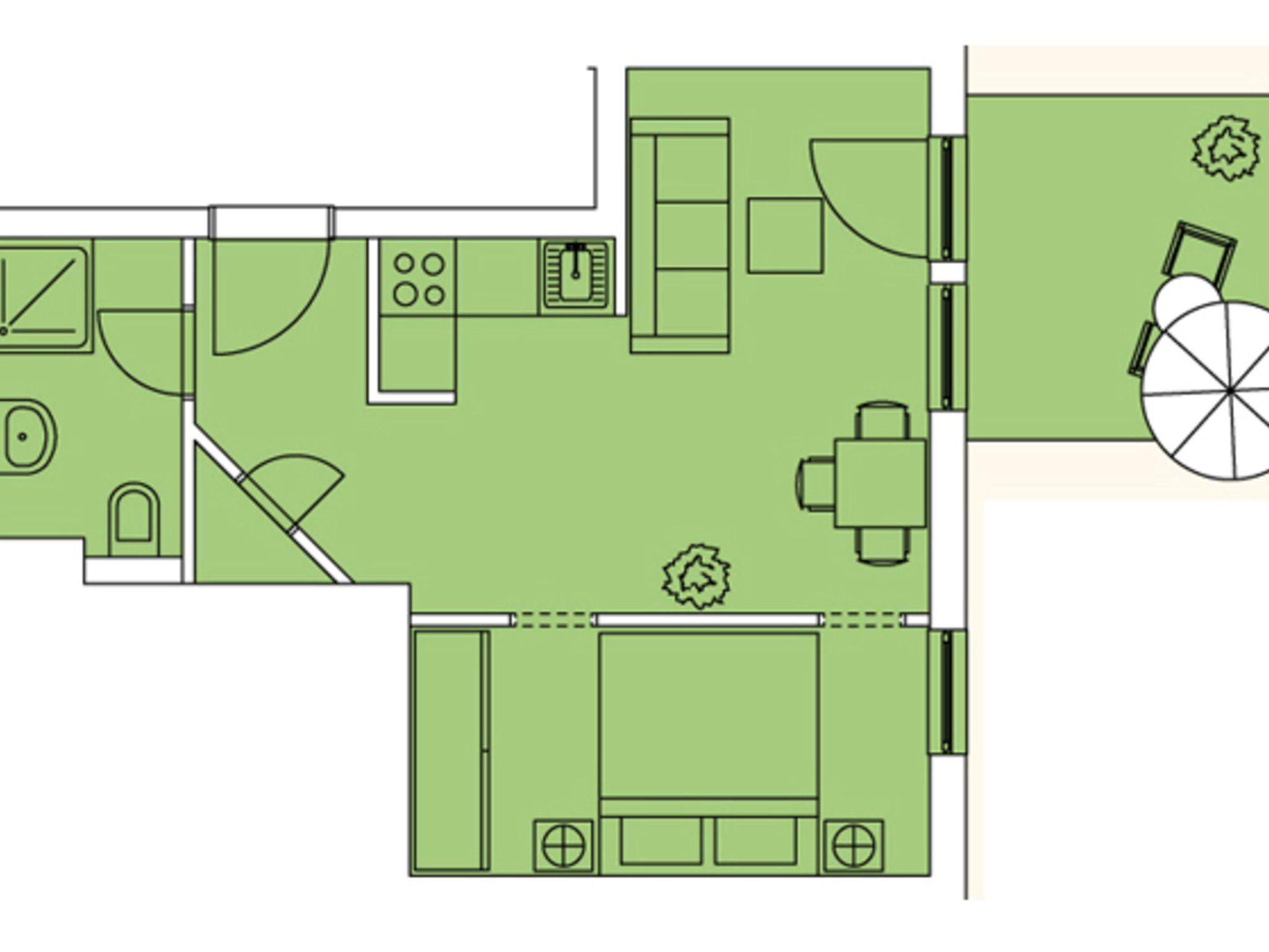 Die modern eingerichtete Ferienwohnung Strandläufer mit Schlafzimmer und Wohnzimmer hat eine schöne private Terrasse mit Blick zum Wald und seitlich zum Meer.