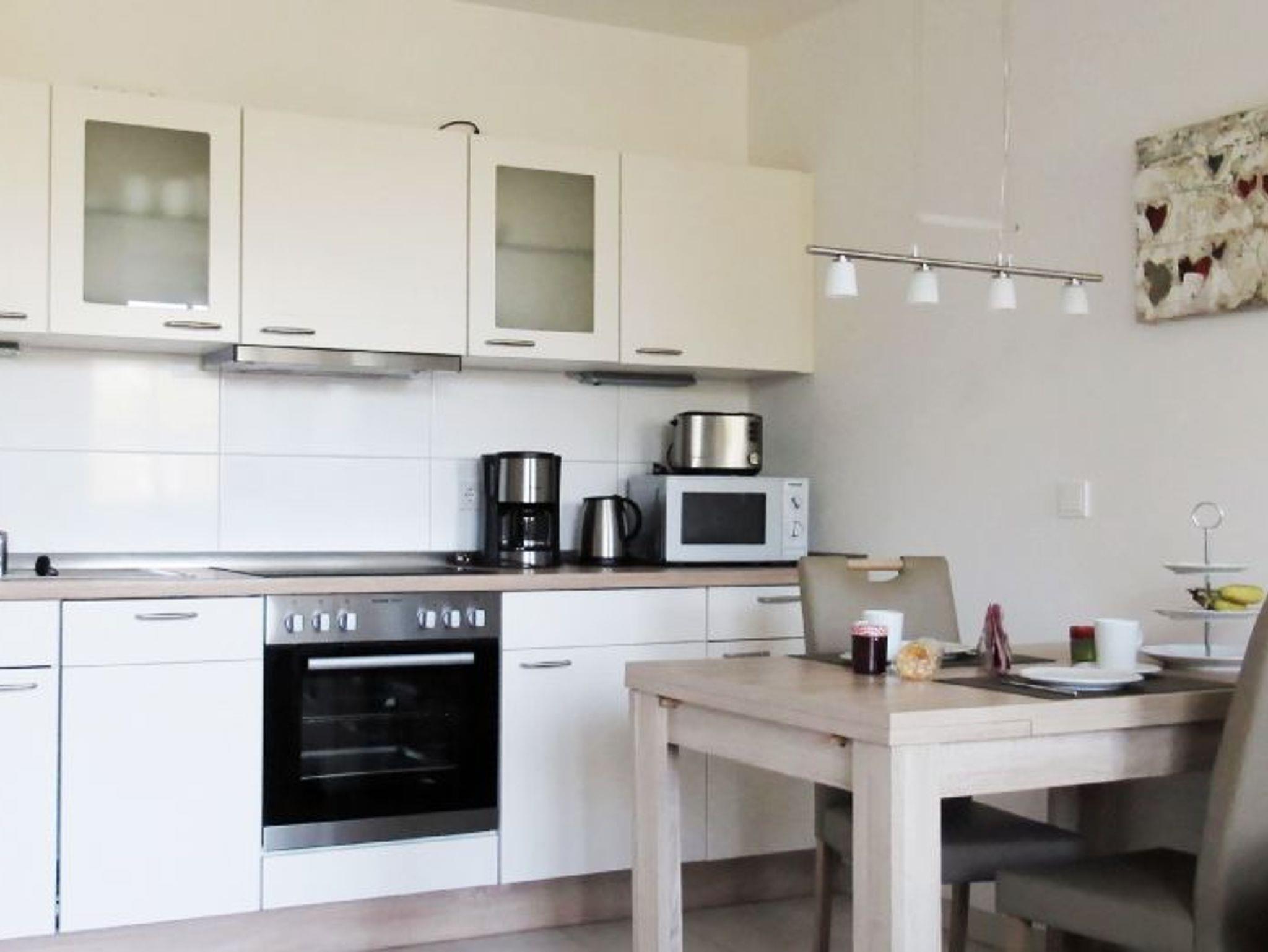 Die Küchenzeile ist modern mit 4-Platten-Ceranherd/Backofen, Kühlschrank/Gefrierfach, Geschirrspülmaschine, Kaffeemaschine, Toaster und Mikrowelle eingerichtet.