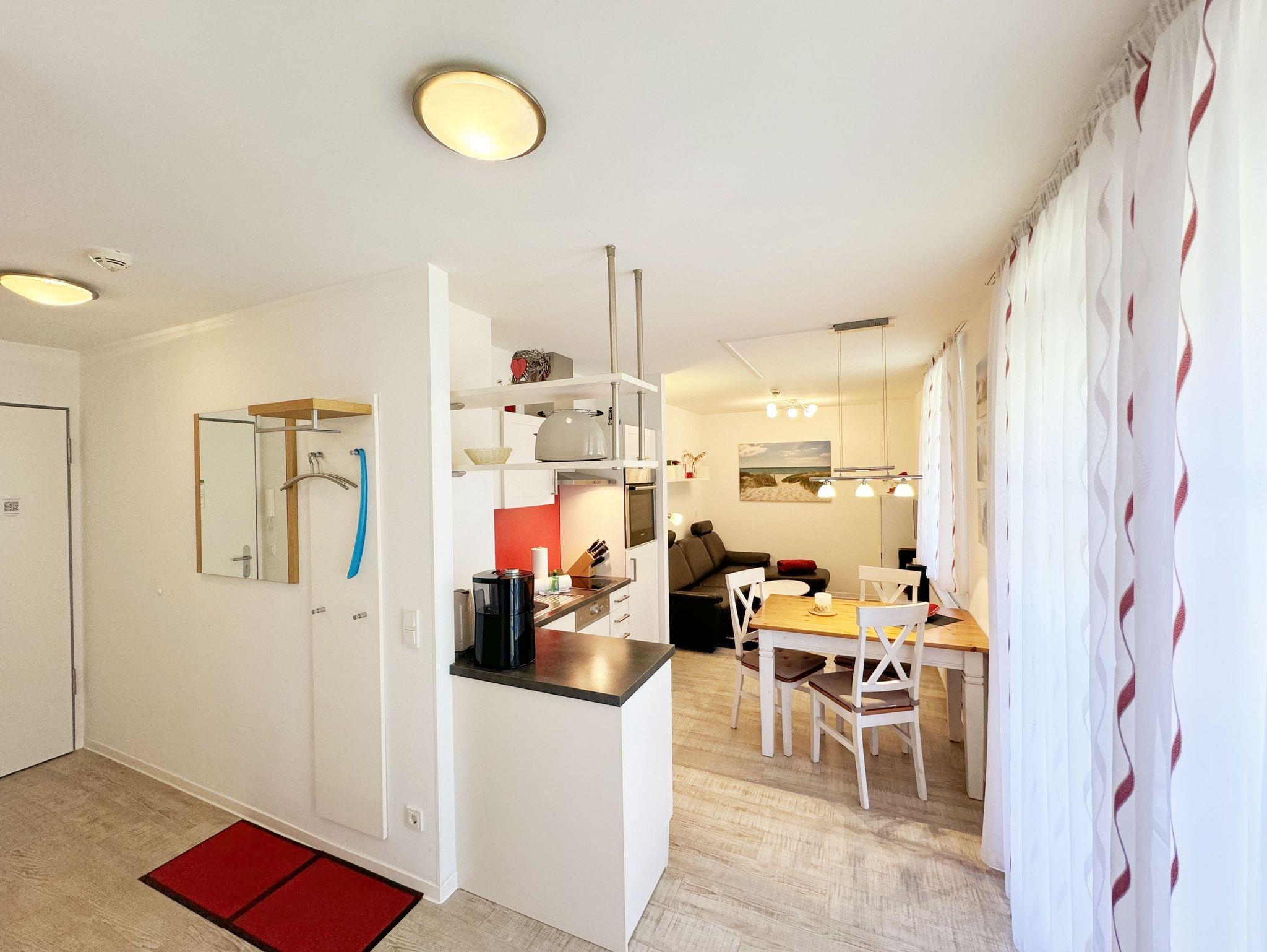 Ihre Nichtraucher-Ferienwohnung ist mit viel Liebe zum Detail ausgestattet und eingerichtet worden. Sie wohnen in einer ca. 42 qm 2-Zimmer Wohnung, die für max. 2 Personen ausgelegt ist. Die Wohnung A.2.23 befindet sich in der 2. Etage und ist per Fahrstuhl von der Tiefgarage bequem zu erreichen. In der Wohnung finden Sie einen kombinierten Wohn/Koch- und Essbereich. Die integrierte Küchenzeile lässt mit Backofen, 2 Zonen-Ceranfeld, Spülmaschine, Kühlschrank mit Gefrierfach, Kaffeemaschine, Wasserkocher, Toaster und anderen praktischen Kochutensilien keine Wünsche offen. Im Wohnbereich befindet sich eine Essecke, eine gemütliche Couch, LCD-TV, DVD-Player und eine Musikanlage mit USB und IPhone/IPod Dock Station sind vorhanden. Auch auf einen Internetanschluss (WLAN) müssen Sie im Urlaub nicht verzichten. Dieser ist für Sie inklusive! Der große Balkon ist vom Wohn/Essbereich begehbar und möbliert. Das Schlafzimmer ist mit einem Doppelbett (1,80m x 2,00m), verstellbare Lattenroste, Nachttischkonsolen, einem Kleiderschrank und einem weiteren Flachbild-TV ausgestattet. Das Bad verfügt über eine ebenerdige Dusche, Waschbecken, WC, Handtuchheizkörper sowie einen Fön. Ein kleiner Abstellraum gehört zur Wohnung dazu. Hier finden untereinander Reinigungsutensilien sowie einen Wäscheständer. 1 kleiner Hund (keine Katzen) ist gegen eine Gebühr ein gern gesehener Gast. Ein eigener PKW-Stellplatz (Nr. 105, Einfahrtshöhe 2,00m) befindet sich in der Tiefgarage des Hauses. Im Keller des Hauses haben Sie die Möglichkeit eine Waschmaschine/Trockner gegen Gebühr zu nutzen. Mit dem Fahrstuhl des Hauses A gelangen sie in das Untergeschoss der Meeresblickanlage, wo Sie ein großzügiger und heller Wellnessbereich erwartet. Hier können sie in einem Pool kleine Bahnen schwimmen, in 2 Saunen Ihren Kreislauf in Schwung bringen, in einem dazugehörigen Ruheraum Ihren Körper wieder beruhigen, in einer Schneckendusche sowie weiteren Duschen das kühle Nass genießen und auf einer Außenterrasse mit Außendusche die frische Luft einatmen. Die Erstausstattung eines Wäschepaketes (komplette Bettwäsche, 1 Duschhandtuch, 2 kleine Handtücher) können Sie bis 14 Tage vor Anreise gegen einen Aufpreis dazu buchen oder durch eigene ergänzen. Ab 2 gebuchten Paketen erhalten Sie einmalig 1 Geschirrhandtuch und 1 Duschvorleger hinzu.