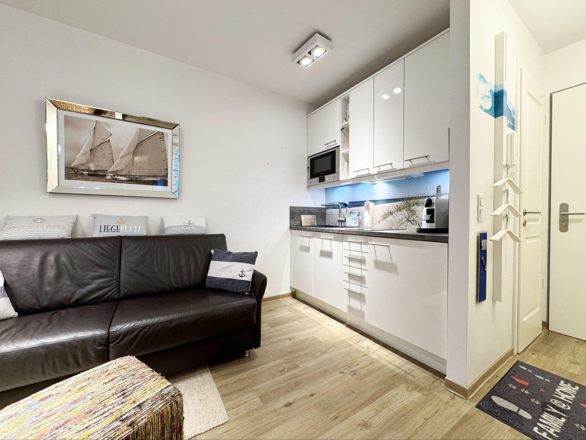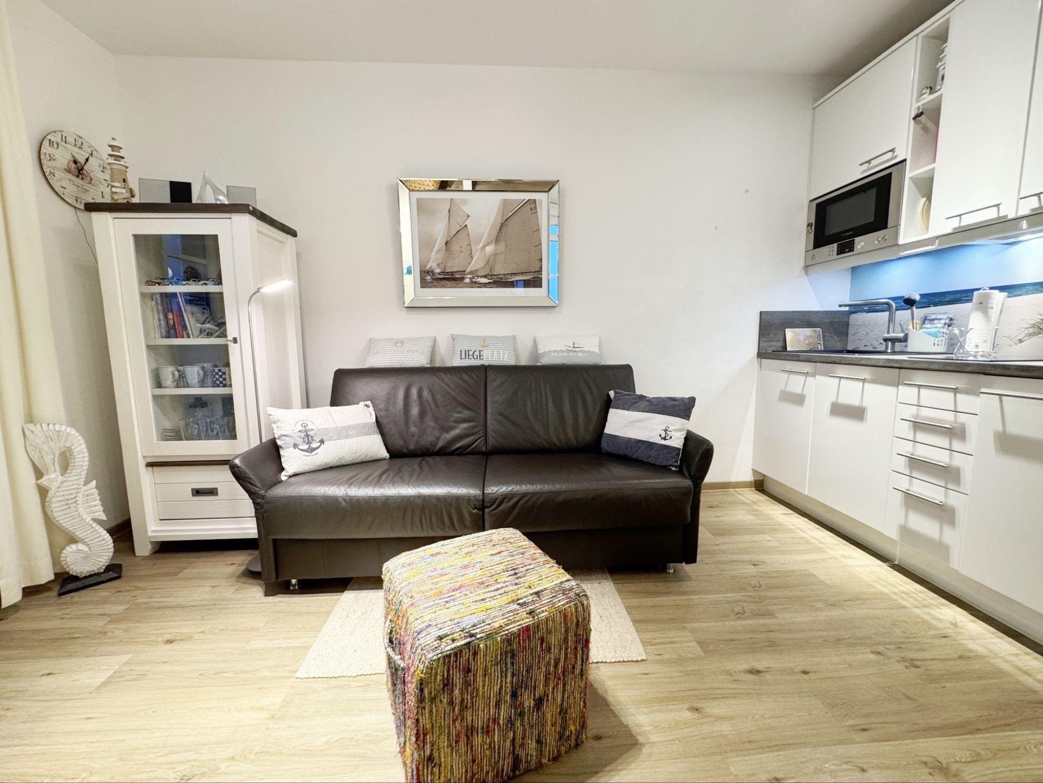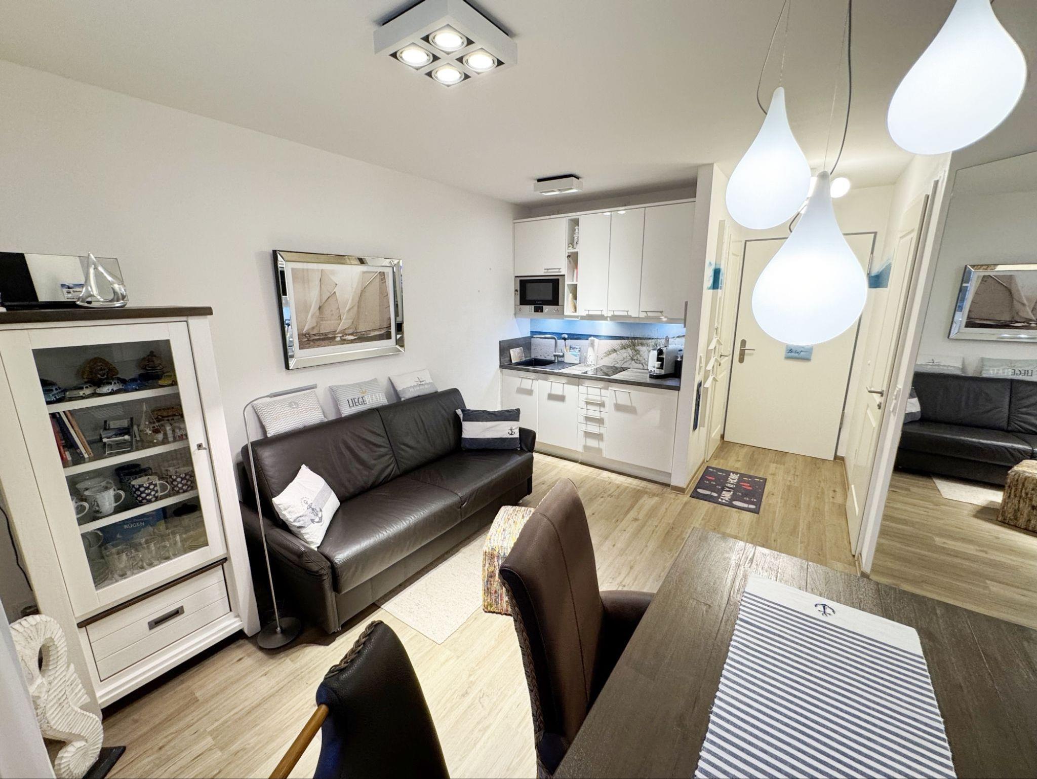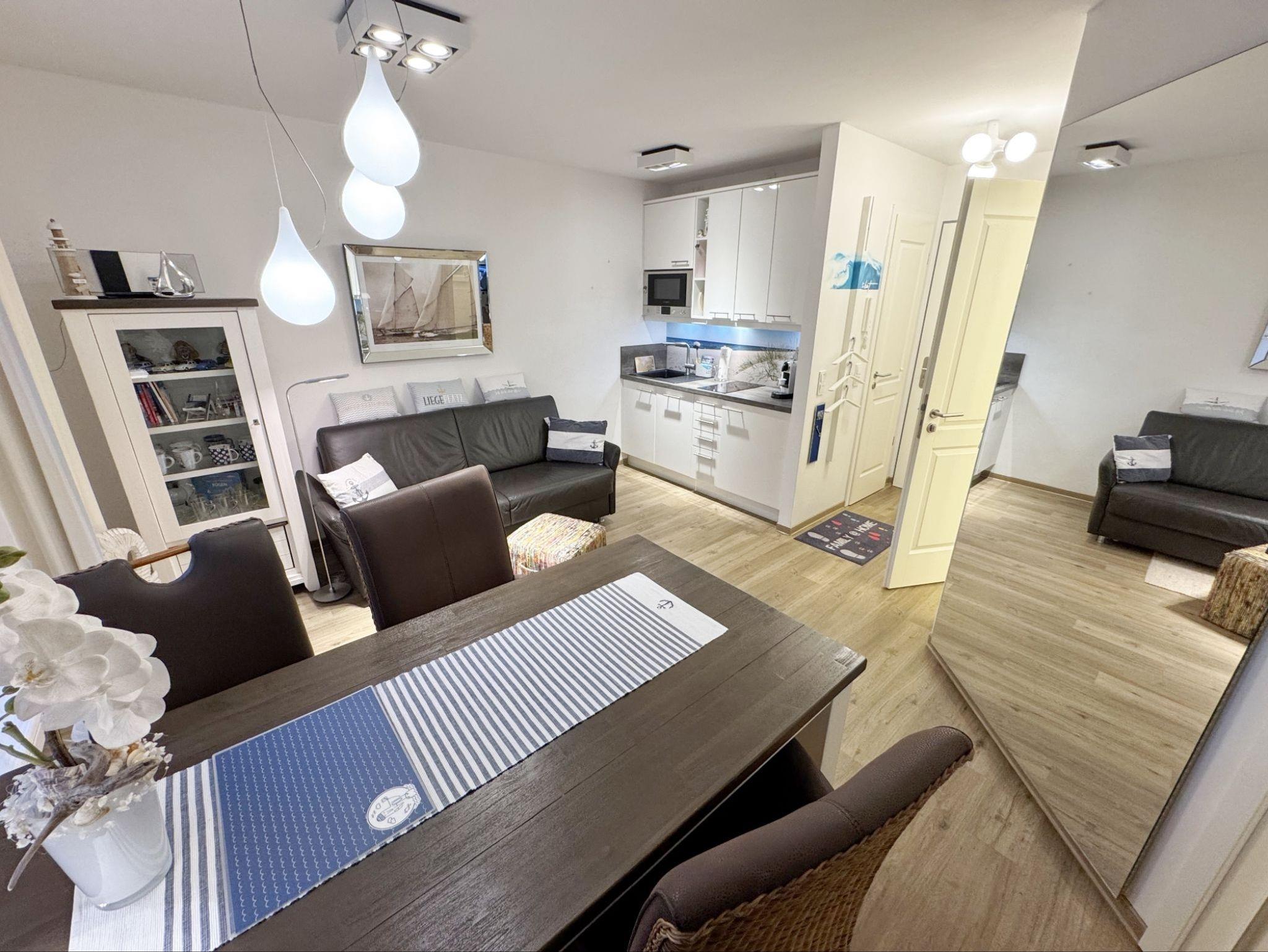 Willkommen in der geschmackvollen Ferienwohnung „Dinghy“ im Haus Meeresblick, einer Nichtraucher Ferienwohnung in Strandnähe, die ideal für einen komfortablen Aufenthalt bis zu max. 2 Personen geeignet ist. Die Erdgeschosswohnung bietet Ihnen eine Wohnfläche von ca. 39 qm und zeichnet sich durch eine durchdachte Raumaufteilung und moderne Ausstattung aus. Der Wohnbereich ist optimal ausgestattet. Hier finden Sie einen großzügigen Esstisch, zwei Vitrinen im Landhausstil, sowie eine Couch, ein Beistelltisch, eine Leselampe und einen Flachbild-TV mit integriertem Internetradio. Für den perfekten Sound sorgt das Panasonic iPhone 5, iPad, iPod Micro System, das Bluetooth, CD, USB und FM-Radio unterstützt. Der technische Bereich wird durch einen WLAN-Anschluss abgerundet. Ein Highlight der Wohnung ist die möblierte Terrasse (West), welche Sie vom Wohnbereich durch eine Insektenschutztür erreichen welche Ihnen zusätzlichen Außenraum bietet. Die angrenzende Pantry-Küchenzeile ist mit modernen Geräten ausgestattet, darunter eine Spülmaschine, ein Kühlschrank mit Gefrierfach des gleichen Herstellers. Weitere Küchengeräte wie ein Handmixer, ein Toaster, eine Mikrowelle mit Grill, eine Kaffeemaschine, eine De Longhi Nespresso-Maschine und ein Wasserkocher stehen zur Verfügung. Die beleuchtete Küchenzeile - mit integriertem Dunstabzug und 2 Zonen Cerankochfeld - sorgt für eine angenehme Atmosphäre beim Kochen. Das Schlafzimmer bietet einen komfortablen Rückzugsort mit einem LED-TV und einem stufenlos beheizbaren Wasserbett (2,00m x 2,10m), das aus zwei Kammern besteht sowie Nachttischablagen mit Beleuchtung. Ein großer Kleiderschrank mit drei Schubladen bietet ausreichend Stauraum, während ein Tresor im Schrank für zusätzlichen Schutz Ihrer Wertsachen sorgt. Ein Bücherregal, ein Insektenschutzgitter und eine Verdunklungsmöglichkeit komplettieren den Raum. Das innenliegende Badezimmer ist mit einem ebenerdigen Duschbad ausgestattet, das eine Sitzgelegenheit bietet. Ein großer Waschtisch, ein Kosmetikspiegel, sowie ein Föhn, ein WC und ein Handtuchhalter komplettieren die Ausstattung. Im kleinen Abstellraum befinden sich Reinigungsutensilien, eine Garderobe sowie ein Wäscheständer. Haustiere sind nicht erlaubt. Im Keller des Hauses haben Sie die Möglichkeit eine Waschmaschine/Trockner gegen Gebühr zu nutzen. Mit dem Fahrstuhl des Hauses A gelangen sie in das Untergeschoss der Meeresblickanlage, wo Sie ein großzügiger und heller Wellnessbereich erwartet. Hier können sie in einem Pool kleine Bahnen schwimmen, in 2 Saunen Ihren Kreislauf in Schwung bringen, in einem dazugehörigen Ruheraum Ihren Körper wieder beruhigen, in einer Schneckendusche sowie weiteren Duschen das kühle Nass genießen und auf einer Außenterrasse mit Außendusche die frische Luft einatmen. Ein PKW-Stellplatz (Nr. 63, Einfahrtshöhe 2,00m) ist für Sie in der Tiefgarage reserviert. Die Erstausstattung eines Wäschepaketes (komplette Bettwäsche, 1 Duschhandtuch, 2 kleine Handtücher) können Sie bis 14 Tage vor Anreise gegen einen Aufpreis dazu buchen oder durch eigene ergänzen. Ab 2 gebuchten Paketen erhalten Sie einmalig 1 Geschirrhandtuch und 1 Duschvorleger hinzu.