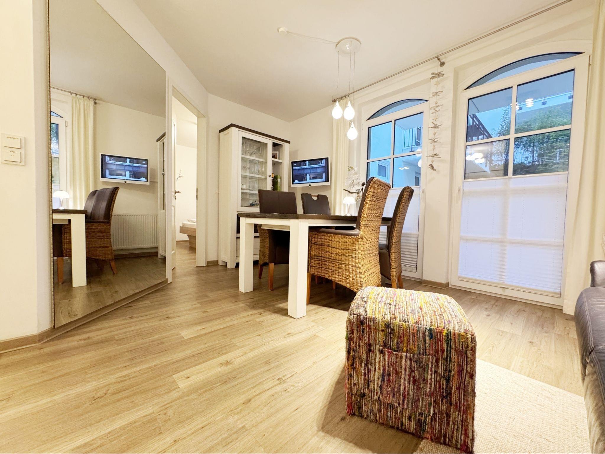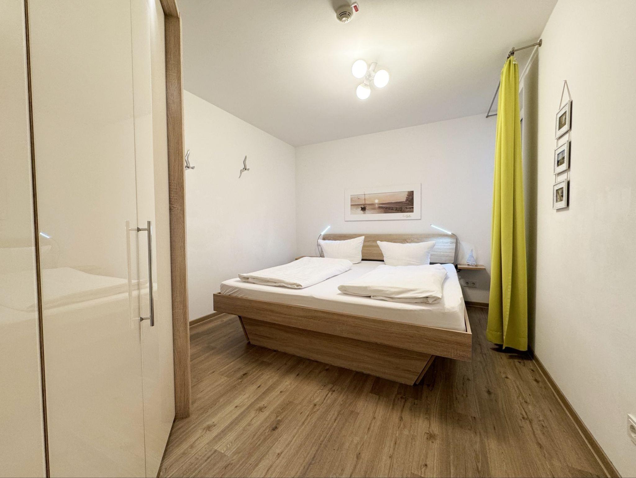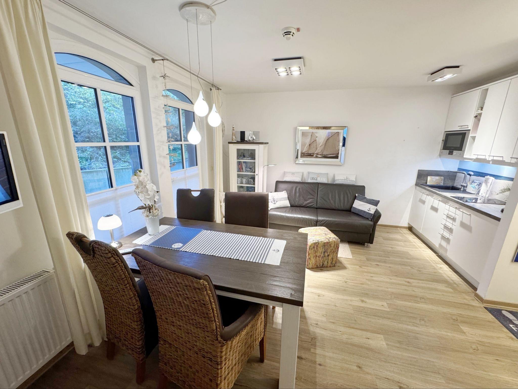 Willkommen in der geschmackvollen Ferienwohnung „Dinghy“ im Haus Meeresblick, einer Nichtraucher Ferienwohnung in Strandnähe, die ideal für einen komfortablen Aufenthalt bis zu max. 2 Personen geeignet ist. Die Erdgeschosswohnung bietet Ihnen eine Wohnfläche von ca. 39 qm und zeichnet sich durch eine durchdachte Raumaufteilung und moderne Ausstattung aus. Der Wohnbereich ist optimal ausgestattet. Hier finden Sie einen großzügigen Esstisch, zwei Vitrinen im Landhausstil, sowie eine Couch, ein Beistelltisch, eine Leselampe und einen Flachbild-TV mit integriertem Internetradio. Für den perfekten Sound sorgt das Panasonic iPhone 5, iPad, iPod Micro System, das Bluetooth, CD, USB und FM-Radio unterstützt. Der technische Bereich wird durch einen WLAN-Anschluss abgerundet. Ein Highlight der Wohnung ist die möblierte Terrasse (West), welche Sie vom Wohnbereich durch eine Insektenschutztür erreichen welche Ihnen zusätzlichen Außenraum bietet. Die angrenzende Pantry-Küchenzeile ist mit modernen Geräten ausgestattet, darunter eine Spülmaschine, ein Kühlschrank mit Gefrierfach des gleichen Herstellers. Weitere Küchengeräte wie ein Handmixer, ein Toaster, eine Mikrowelle mit Grill, eine Kaffeemaschine, eine De Longhi Nespresso-Maschine und ein Wasserkocher stehen zur Verfügung. Die beleuchtete Küchenzeile - mit integriertem Dunstabzug und 2 Zonen Cerankochfeld - sorgt für eine angenehme Atmosphäre beim Kochen. Das Schlafzimmer bietet einen komfortablen Rückzugsort mit einem LED-TV und einem stufenlos beheizbaren Wasserbett (2,00m x 2,10m), das aus zwei Kammern besteht sowie Nachttischablagen mit Beleuchtung. Ein großer Kleiderschrank mit drei Schubladen bietet ausreichend Stauraum, während ein Tresor im Schrank für zusätzlichen Schutz Ihrer Wertsachen sorgt. Ein Bücherregal, ein Insektenschutzgitter und eine Verdunklungsmöglichkeit komplettieren den Raum. Das innenliegende Badezimmer ist mit einem ebenerdigen Duschbad ausgestattet, das eine Sitzgelegenheit bietet. Ein großer Waschtisch, ein Kosmetikspiegel, sowie ein Föhn, ein WC und ein Handtuchhalter komplettieren die Ausstattung. Im kleinen Abstellraum befinden sich Reinigungsutensilien, eine Garderobe sowie ein Wäscheständer. Haustiere sind nicht erlaubt. Im Keller des Hauses haben Sie die Möglichkeit eine Waschmaschine/Trockner gegen Gebühr zu nutzen. Mit dem Fahrstuhl des Hauses A gelangen sie in das Untergeschoss der Meeresblickanlage, wo Sie ein großzügiger und heller Wellnessbereich erwartet. Hier können sie in einem Pool kleine Bahnen schwimmen, in 2 Saunen Ihren Kreislauf in Schwung bringen, in einem dazugehörigen Ruheraum Ihren Körper wieder beruhigen, in einer Schneckendusche sowie weiteren Duschen das kühle Nass genießen und auf einer Außenterrasse mit Außendusche die frische Luft einatmen. Ein PKW-Stellplatz (Nr. 63, Einfahrtshöhe 2,00m) ist für Sie in der Tiefgarage reserviert. Die Erstausstattung eines Wäschepaketes (komplette Bettwäsche, 1 Duschhandtuch, 2 kleine Handtücher) können Sie bis 14 Tage vor Anreise gegen einen Aufpreis dazu buchen oder durch eigene ergänzen. Ab 2 gebuchten Paketen erhalten Sie einmalig 1 Geschirrhandtuch und 1 Duschvorleger hinzu.