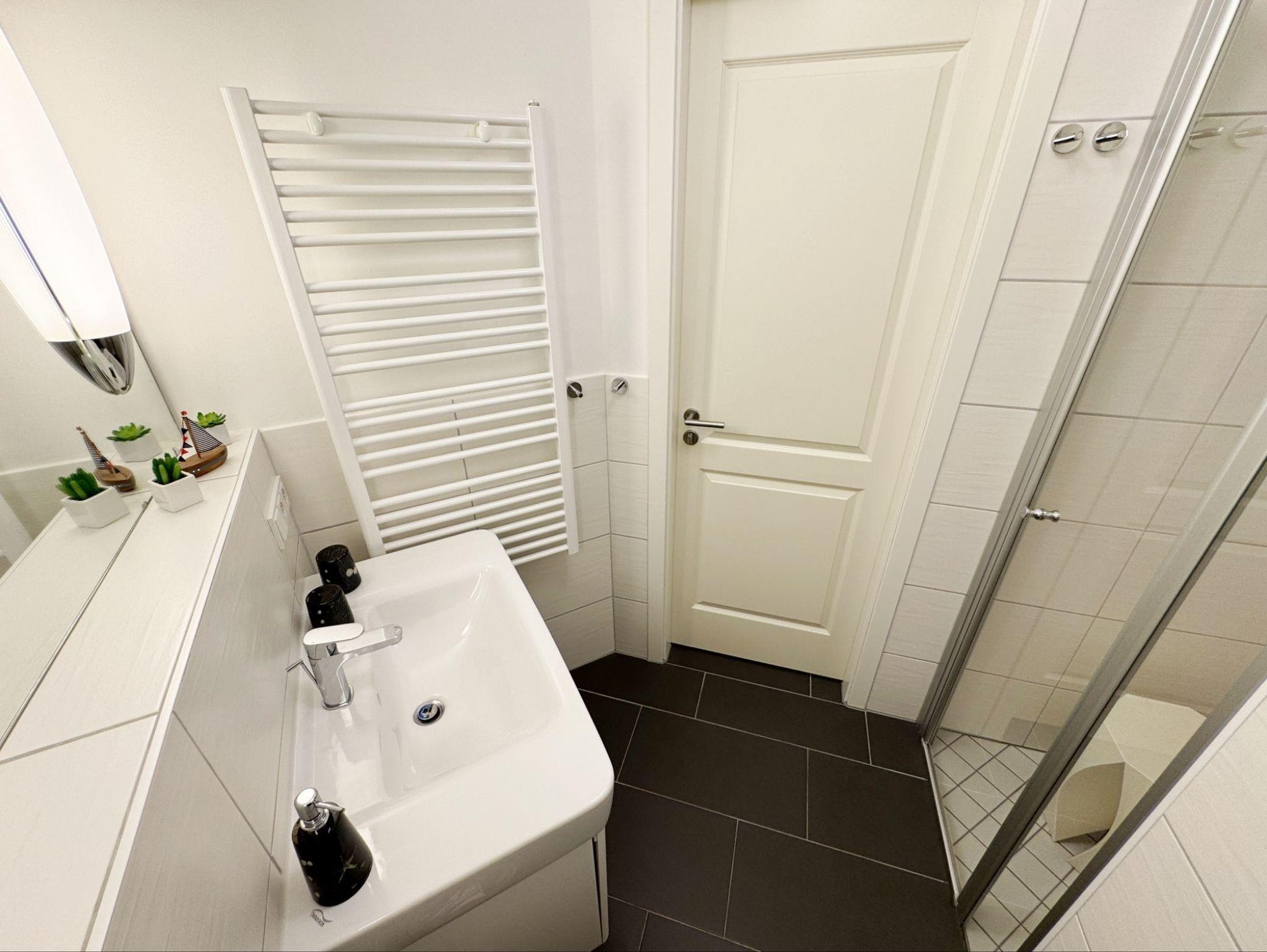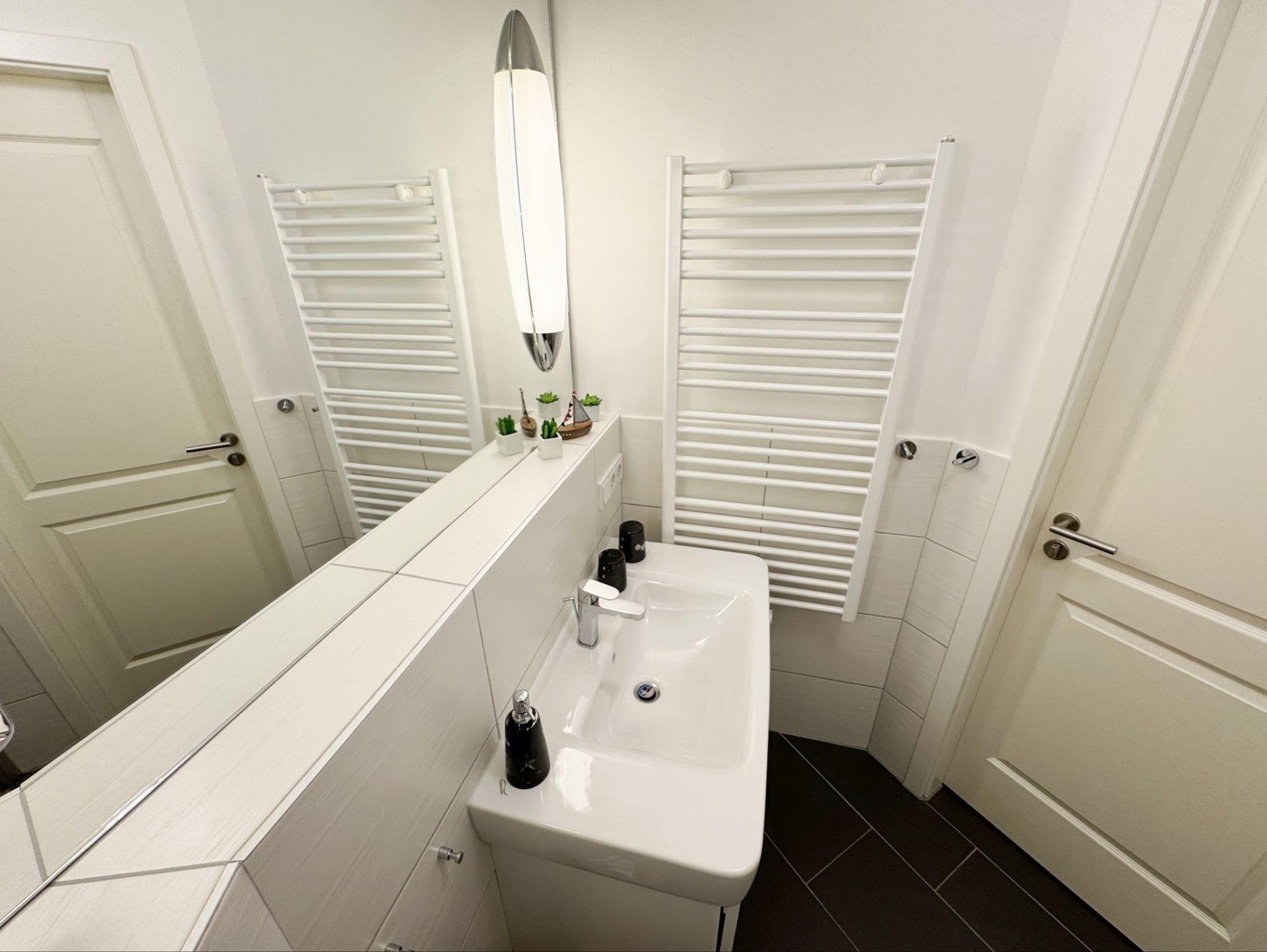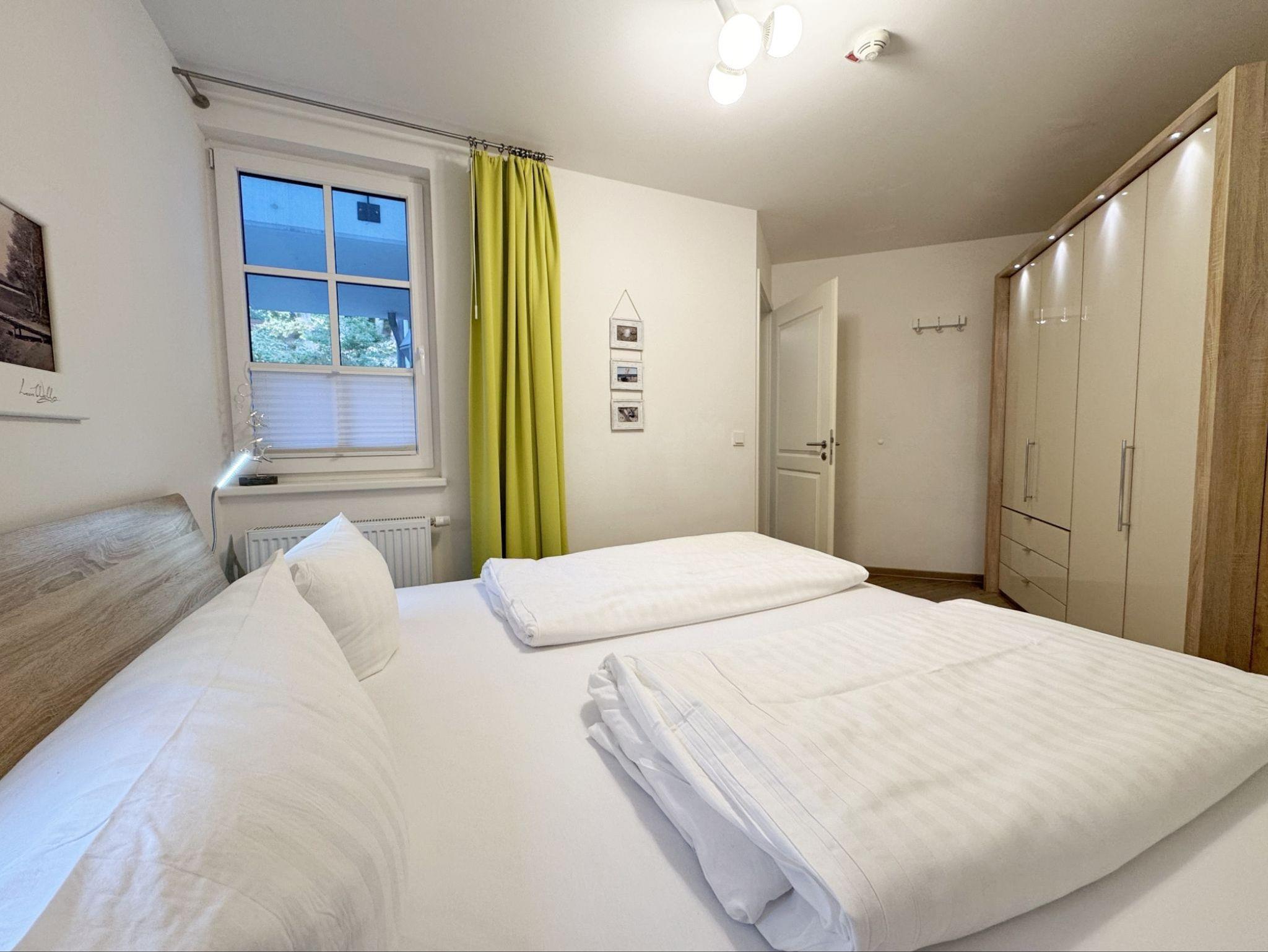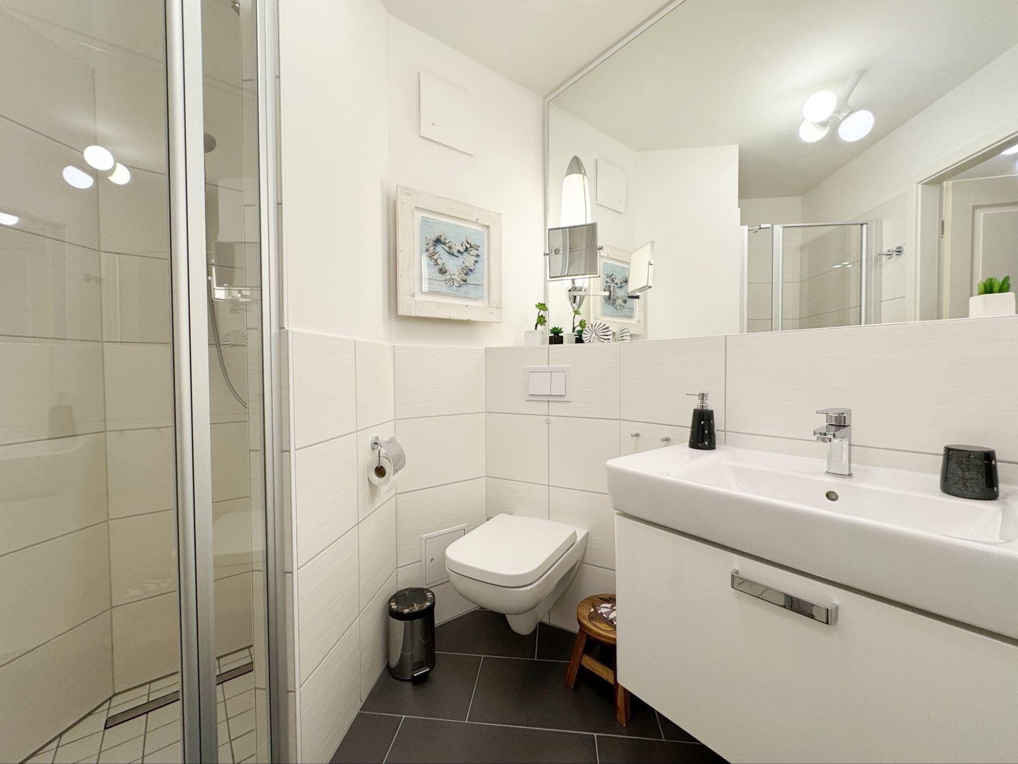 Willkommen in der geschmackvollen Ferienwohnung „Dinghy“ im Haus Meeresblick, einer Nichtraucher Ferienwohnung in Strandnähe, die ideal für einen komfortablen Aufenthalt bis zu max. 2 Personen geeignet ist. Die Erdgeschosswohnung bietet Ihnen eine Wohnfläche von ca. 39 qm und zeichnet sich durch eine durchdachte Raumaufteilung und moderne Ausstattung aus. Der Wohnbereich ist optimal ausgestattet. Hier finden Sie einen großzügigen Esstisch, zwei Vitrinen im Landhausstil, sowie eine Couch, ein Beistelltisch, eine Leselampe und einen Flachbild-TV mit integriertem Internetradio. Für den perfekten Sound sorgt das Panasonic iPhone 5, iPad, iPod Micro System, das Bluetooth, CD, USB und FM-Radio unterstützt. Der technische Bereich wird durch einen WLAN-Anschluss abgerundet. Ein Highlight der Wohnung ist die möblierte Terrasse (West), welche Sie vom Wohnbereich durch eine Insektenschutztür erreichen welche Ihnen zusätzlichen Außenraum bietet. Die angrenzende Pantry-Küchenzeile ist mit modernen Geräten ausgestattet, darunter eine Spülmaschine, ein Kühlschrank mit Gefrierfach des gleichen Herstellers. Weitere Küchengeräte wie ein Handmixer, ein Toaster, eine Mikrowelle mit Grill, eine Kaffeemaschine, eine De Longhi Nespresso-Maschine und ein Wasserkocher stehen zur Verfügung. Die beleuchtete Küchenzeile - mit integriertem Dunstabzug und 2 Zonen Cerankochfeld - sorgt für eine angenehme Atmosphäre beim Kochen. Das Schlafzimmer bietet einen komfortablen Rückzugsort mit einem LED-TV und einem stufenlos beheizbaren Wasserbett (2,00m x 2,10m), das aus zwei Kammern besteht sowie Nachttischablagen mit Beleuchtung. Ein großer Kleiderschrank mit drei Schubladen bietet ausreichend Stauraum, während ein Tresor im Schrank für zusätzlichen Schutz Ihrer Wertsachen sorgt. Ein Bücherregal, ein Insektenschutzgitter und eine Verdunklungsmöglichkeit komplettieren den Raum. Das innenliegende Badezimmer ist mit einem ebenerdigen Duschbad ausgestattet, das eine Sitzgelegenheit bietet. Ein großer Waschtisch, ein Kosmetikspiegel, sowie ein Föhn, ein WC und ein Handtuchhalter komplettieren die Ausstattung. Im kleinen Abstellraum befinden sich Reinigungsutensilien, eine Garderobe sowie ein Wäscheständer. Haustiere sind nicht erlaubt. Im Keller des Hauses haben Sie die Möglichkeit eine Waschmaschine/Trockner gegen Gebühr zu nutzen. Mit dem Fahrstuhl des Hauses A gelangen sie in das Untergeschoss der Meeresblickanlage, wo Sie ein großzügiger und heller Wellnessbereich erwartet. Hier können sie in einem Pool kleine Bahnen schwimmen, in 2 Saunen Ihren Kreislauf in Schwung bringen, in einem dazugehörigen Ruheraum Ihren Körper wieder beruhigen, in einer Schneckendusche sowie weiteren Duschen das kühle Nass genießen und auf einer Außenterrasse mit Außendusche die frische Luft einatmen. Ein PKW-Stellplatz (Nr. 63, Einfahrtshöhe 2,00m) ist für Sie in der Tiefgarage reserviert. Die Erstausstattung eines Wäschepaketes (komplette Bettwäsche, 1 Duschhandtuch, 2 kleine Handtücher) können Sie bis 14 Tage vor Anreise gegen einen Aufpreis dazu buchen oder durch eigene ergänzen. Ab 2 gebuchten Paketen erhalten Sie einmalig 1 Geschirrhandtuch und 1 Duschvorleger hinzu.