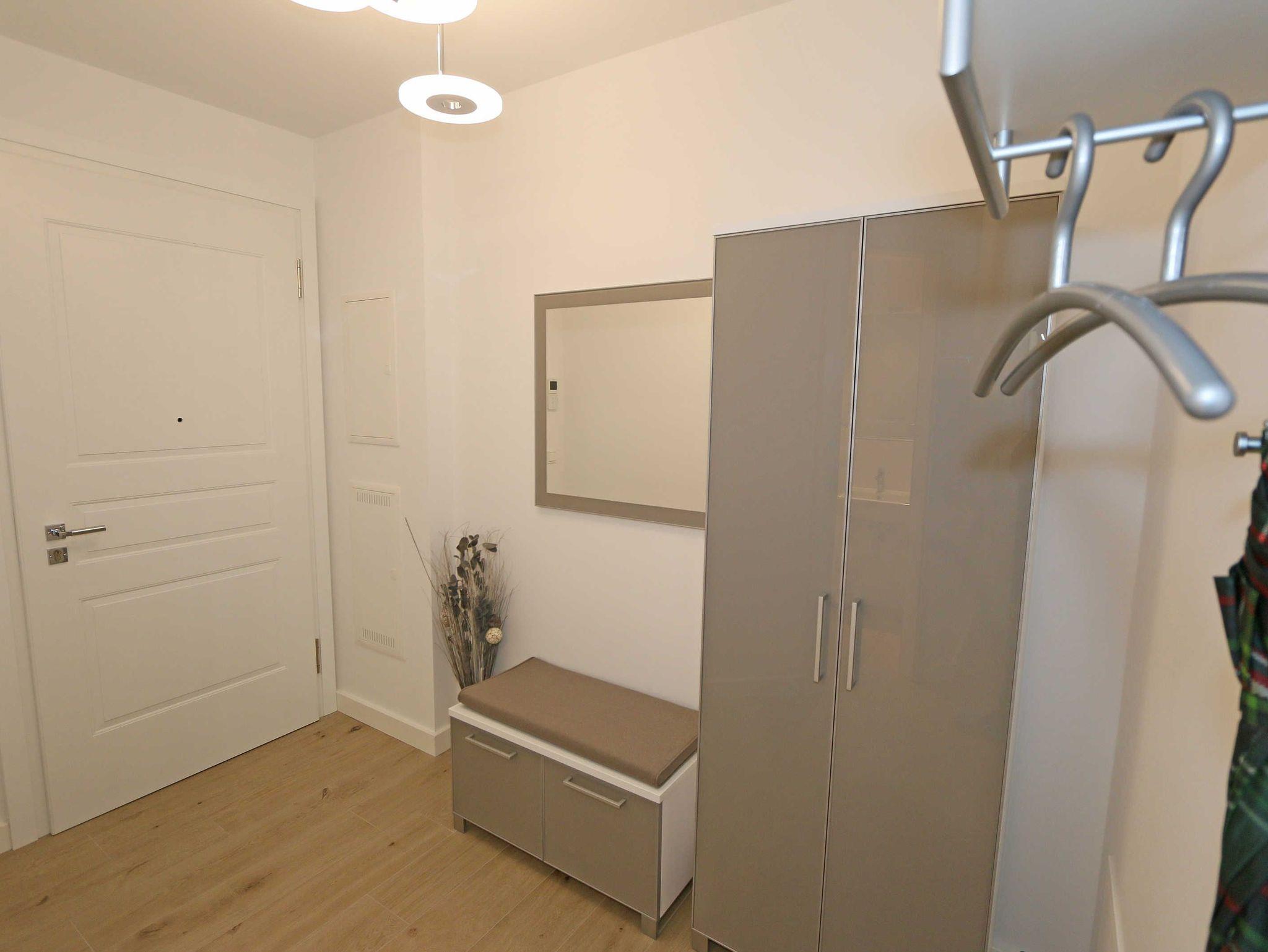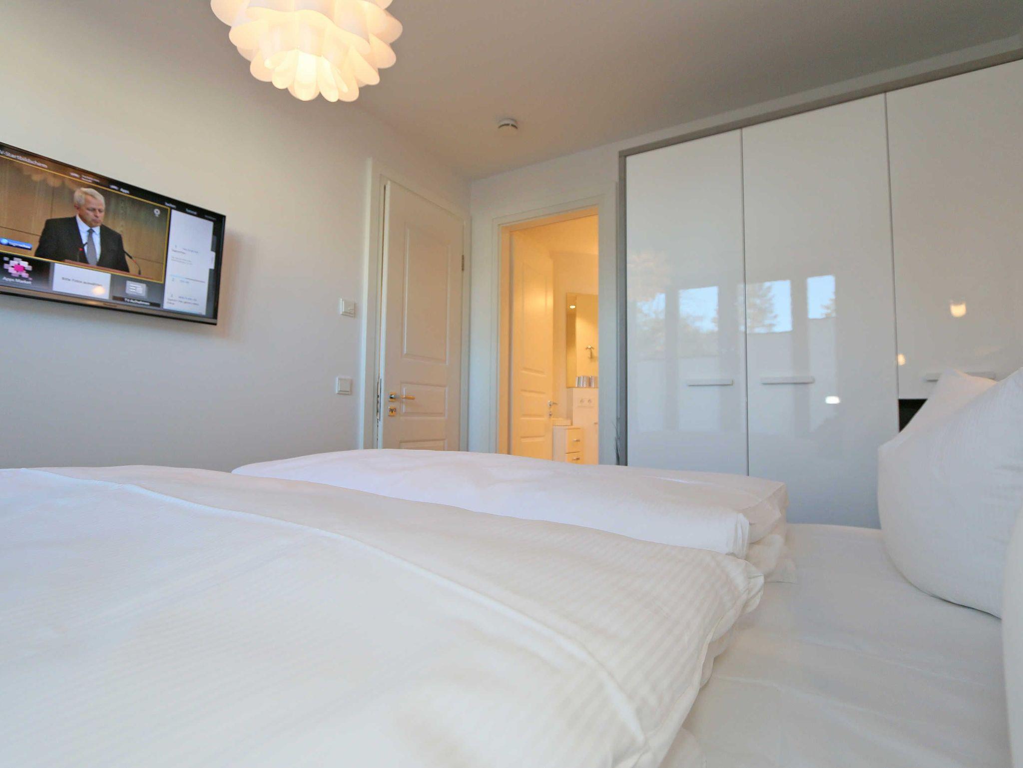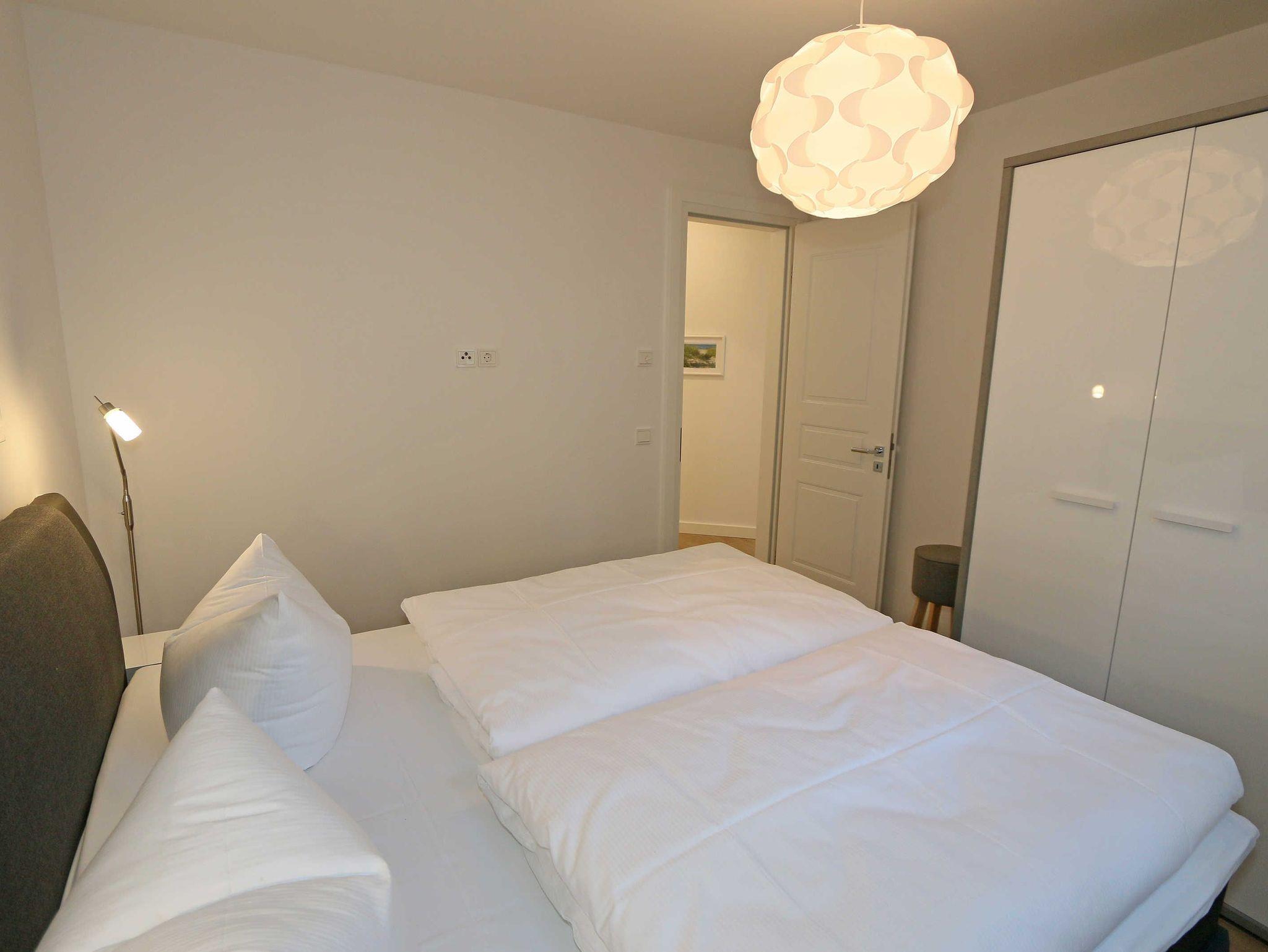Die 67 m² große Nichtraucherwohnung mit exzellenter Raumaufteilung und hochwertiger Ausstattung bietet Ihnen alle Möglichkeiten für einen erholsamen Urlaub für max. 2 bis 4 Erwachsene. Im hellen Wohn/Esszimmer können Sie in der bequemen Sitzgarnitur mit Couch + 2 Sessel, Couchtisch mit Stehlampe entspannen, ein LG Heimkinosystem mit Blu Ray Player, DVD, Smart TV sowie ein Internet-Radio, CD, Bluetooth, USB und MP3 sorgen für Ihre Unterhaltung. Ein Internetanschluss (WLAN) ist für Sie zusätzlich inklusive. Ein Essplatz für 4 Personen befindet sich vor der mit allem Komfort ausgestatteten Küchenzeile. Hier sind ein Geschirrspüler, 4 Zonen-Ceranfeld mit Backofen, ein Kühlschrank mit Gefrierfach, eine Mikrowelle sowie eine Kaffeemaschine, Toaster, Wasserkocher und viele kleine Küchenhelfer selbstverständlich vorhanden. Vom Wohnbereich gelangen Sie auf die bestuhlte mit Strandkorb (in der Saison) und überdachte Terrasse (Süd/Ost) mit Blick auf den Kurpark. Beide Schlafzimmer sind mit bequemen Boxspringbetten (1,80 m x 2,00 m, durchgehender Topper), Nachttischablagen, Smart-TV und ausreichend Schrankflächen für Ihre Urlaubsgarderobe ausgestattet. Das Aufstellen eines Reisebettes ist in den Schlafzimmern nicht möglich. Das größere Schlafzimmer hat ein eigenes Duschbad, mit Waschtisch, elektrischer Handtuchtrockner, Kosmetikspiegel, Fön und WC. Für einen angenehmen Schlaf sorgen die Außenjalousien. Ein weiteres Bad mit ebenerdiger Regendusche, Waschplatz, elektrischem Handtuchtrockner und WC ist vom geräumigen Flurbereich begehbar. Ein Wäschetrockner/ständer, Bügeleisen sowie ein Staubsauger steht für Sie bereit. In beiden Schlafräumen sowie im Essbereich befinden sich Insektenschutzgitter. Von Ihrem Tiefgaragenstellplatz (Nr. 02/ Einfahrtshöhe 2,00m) gelangen Sie bequem mit dem Aufzug zu Ihrer Ferienwohnung. Durch einen Münzautomaten können Sie die gemeinschaftliche Waschmaschine und Trockner nutzen. Auch die Haus und Münzbetriebene Sauna mit Duschbereich sowie Ruheraum tragen für einen entspannten Urlaub bei. Ihre mitgebrachten oder geliehenen Fahrräder können Sie im begrünten Außenbereich in einem Fahrradhäuschen abstellen. Auch 1 Haustier mit seinem eigenen Schlafplatz ist gegen eine Gebühr ein gern gesehener Gast. Die Erstausstattung eines Wäschepaketes (komplette Bettwäsche, 1 Duschhandtuch, 2 kleine Handtücher) können Sie bis 14 Tage vor Anreise gegen einen Aufpreis dazu buchen oder durch eigene ergänzen. Ab 2 gebuchten Paketen erhalten Sie einmalig 1 Geschirrhandtuch und 1 Duschvorleger hinzu.