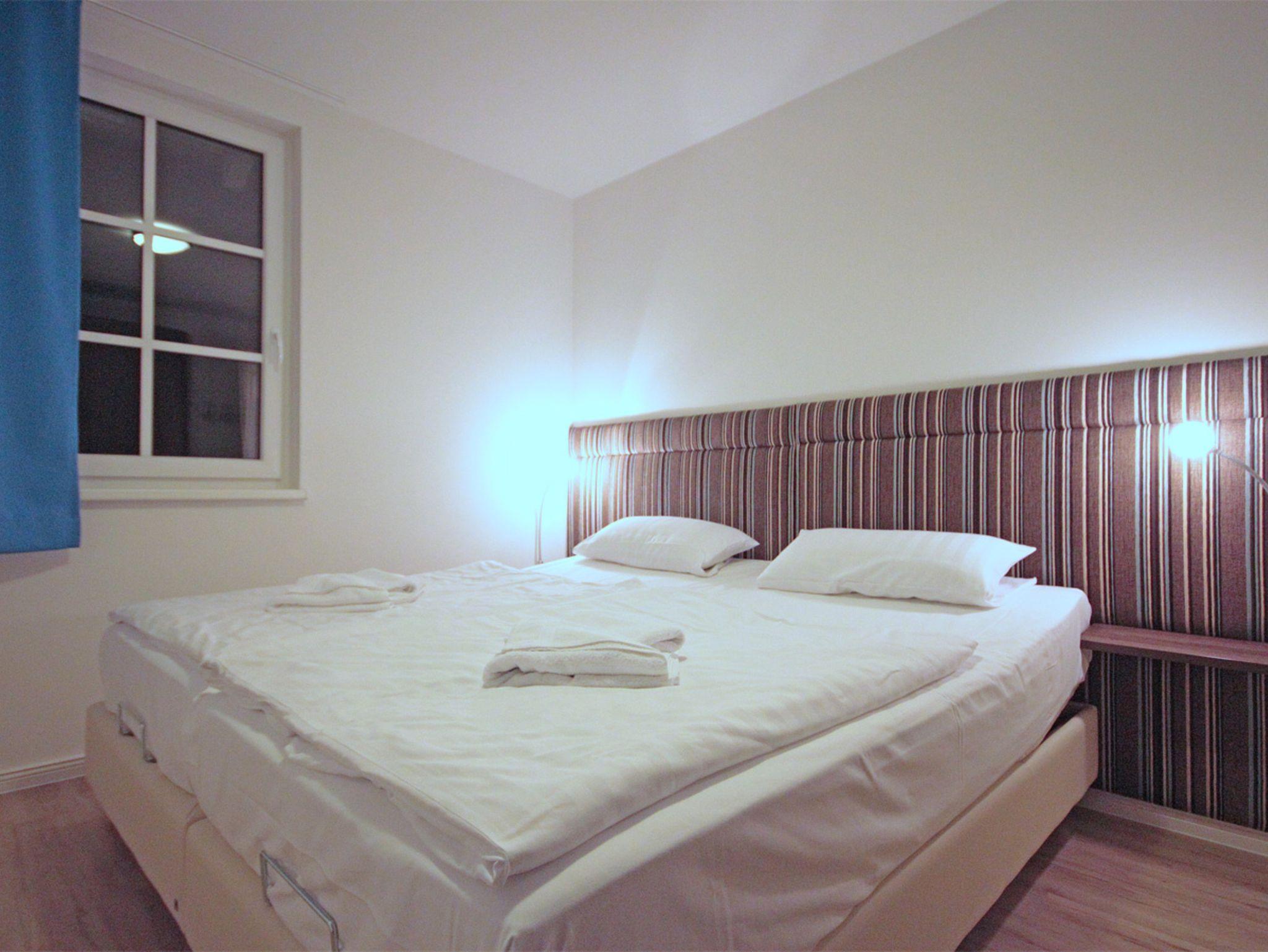 Bis zu 4 Personen übernachten in zwei Schlafzimmern: Eines der beiden Zimmer hat ein Doppelbett (Boxspringbett), das zweite Schlafzimmer hat einen extra Fernseher und zwei Einzelbetten, die zusammengeschoben werden können. In beiden Räumen ist ein Kleiderschrank. Ein Kinderreisebett sowie ein Hochstuhl sind außerdem verfügbar.