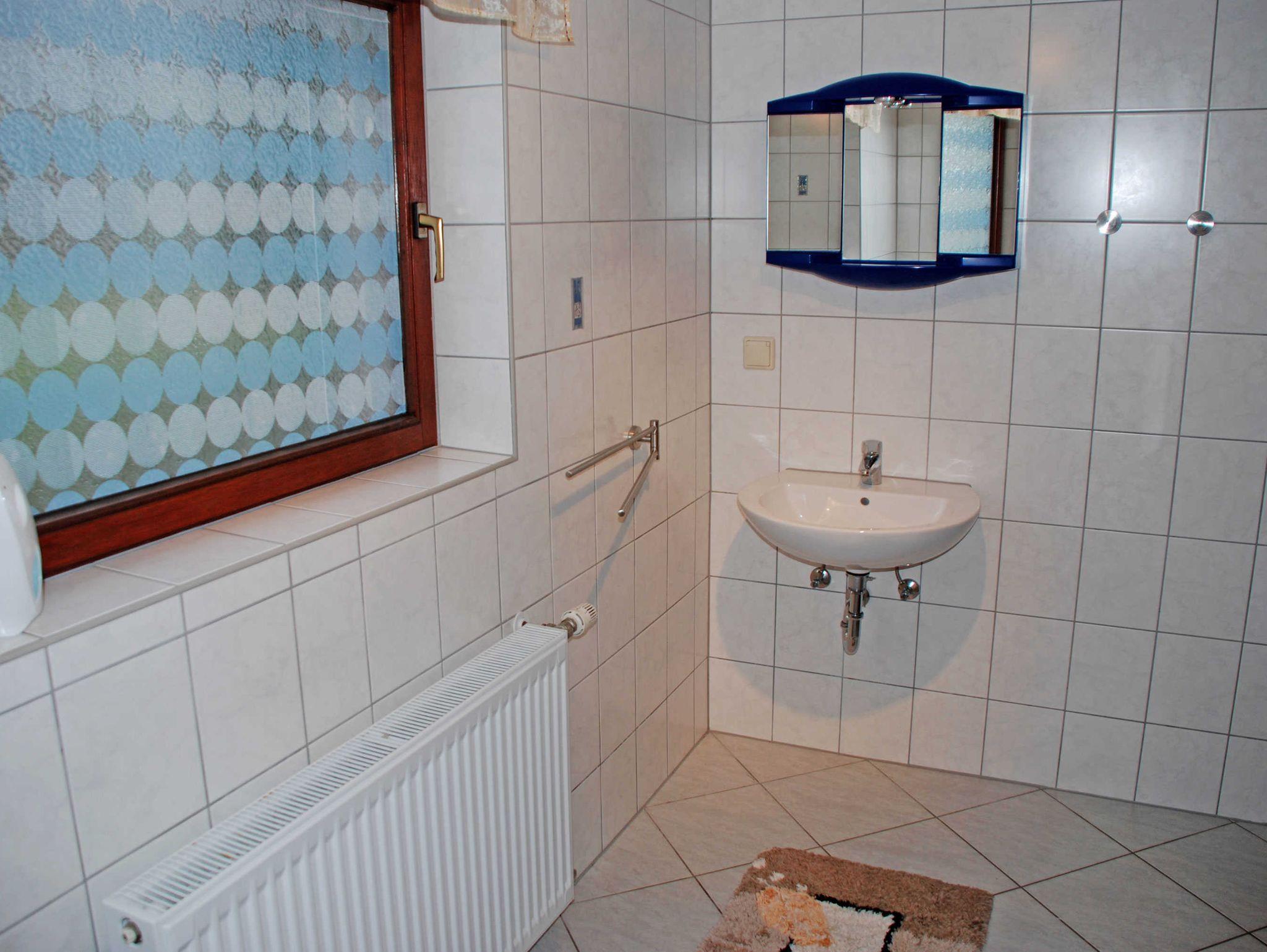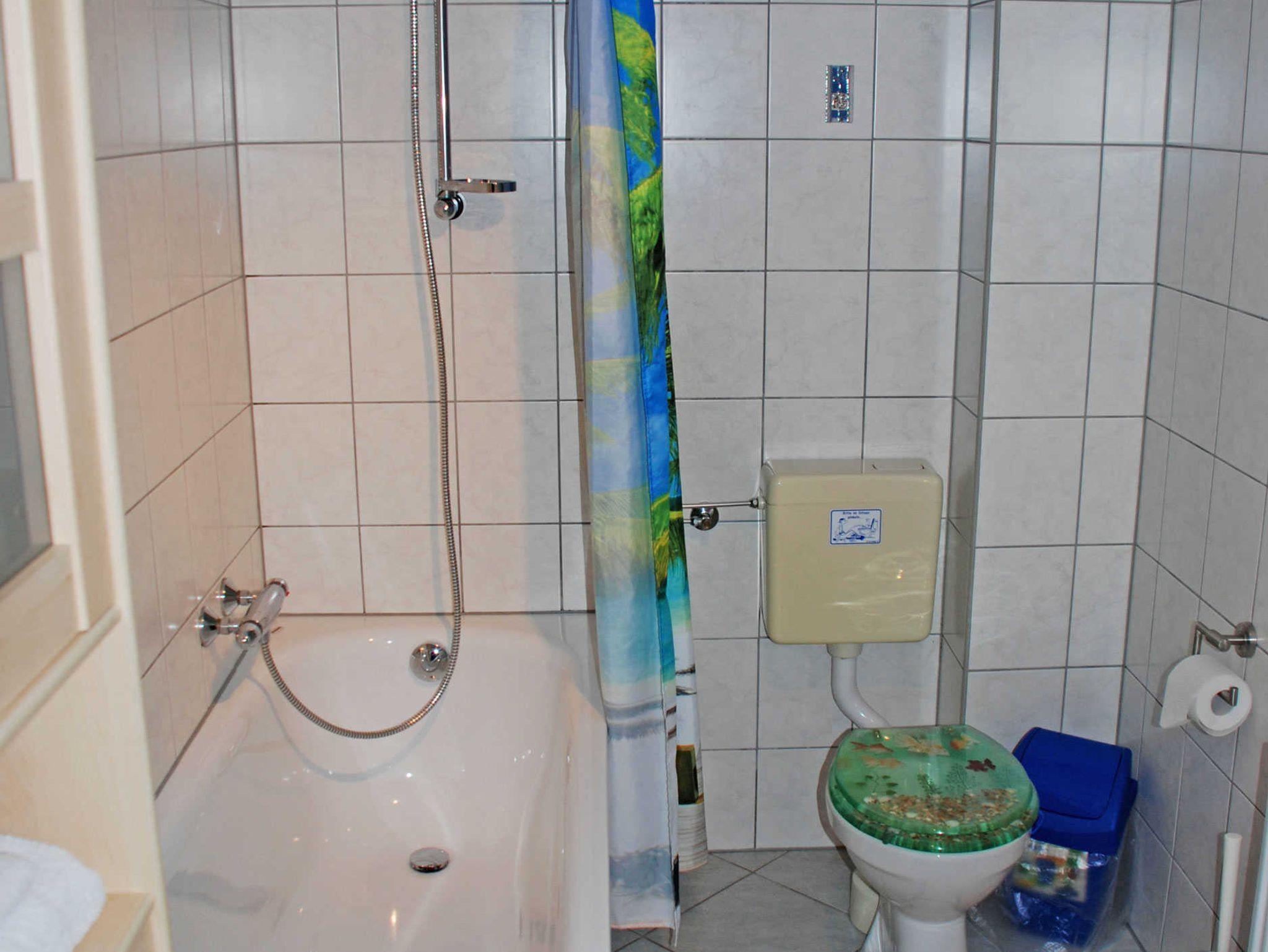Das große Bad ist mit Badewanne/Dusche, WC und Waschbecken ausgestattet und verfügt über Tageslicht.