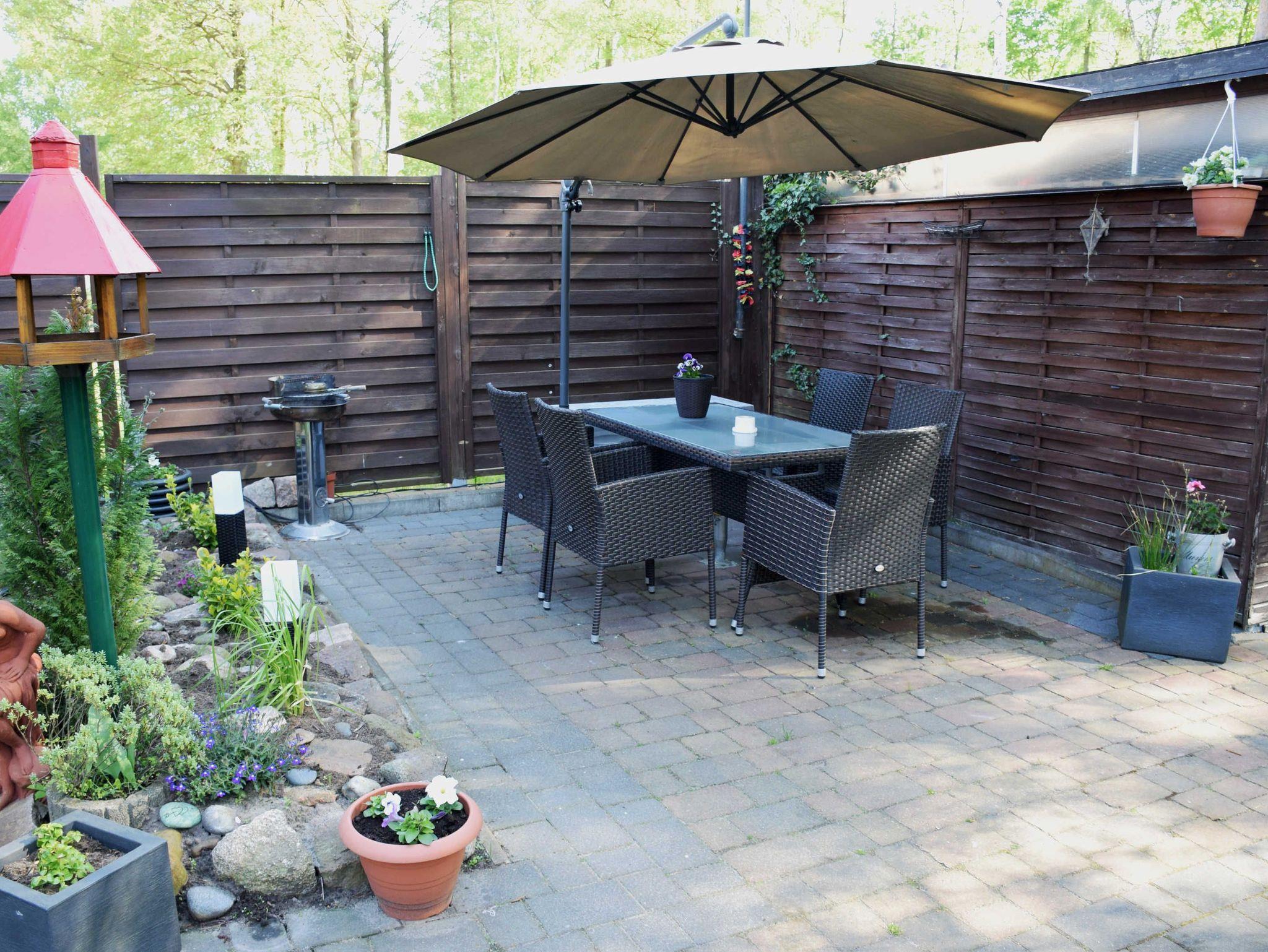 Zu dieser Ferienwohnung gehört auch eine schöne Terrasse mit Gartenmöbeln im Garten hinter dem Haus.