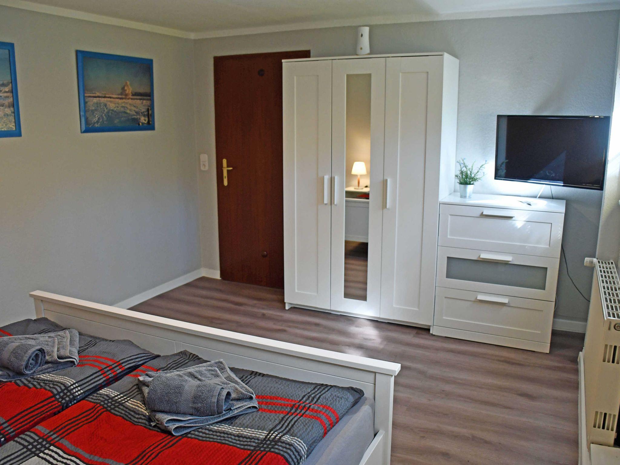 Im großen Wohn-Schlafraum befinden sich ein Kleiderschrank, eine Sitzecke mit Schlafcouch für 2 Gäste und Stühle sowie ein modernes Flachbild-TV-Gerät. Die Wohnung verfügt über WLAN-Internet.