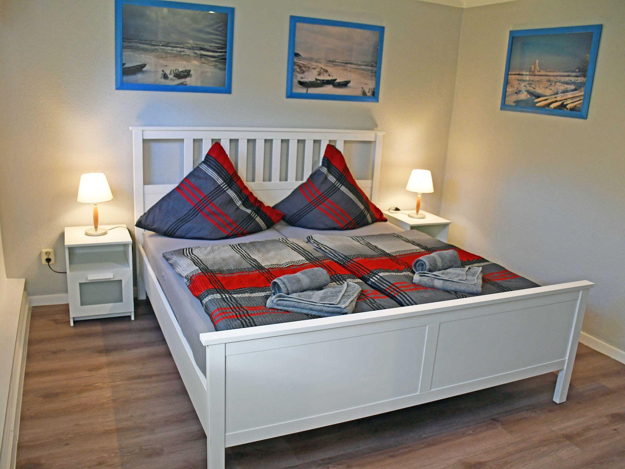 Im Schlafzimmer stehen ein Doppelbett mit Nachttischen und Leselampen und ein Kleiderschrank. Ein kleines Kinderreisebett und ein Hochstuhl können auf Wunsch kostenlos bereitgestellt werden.