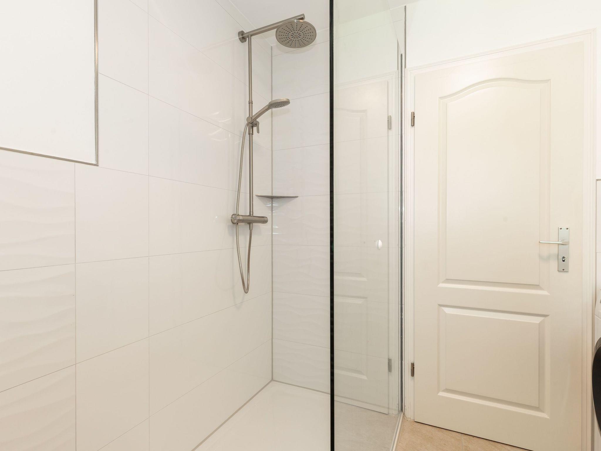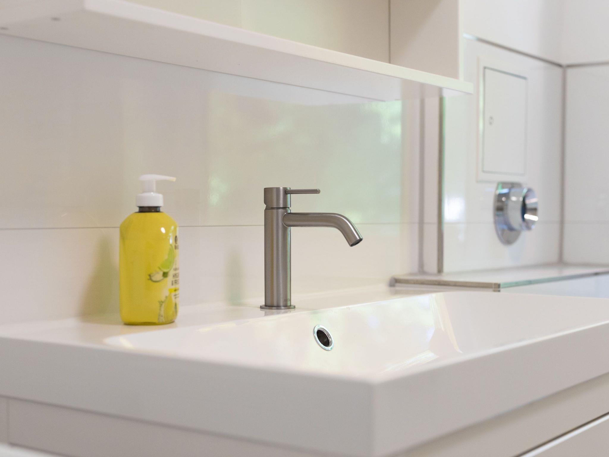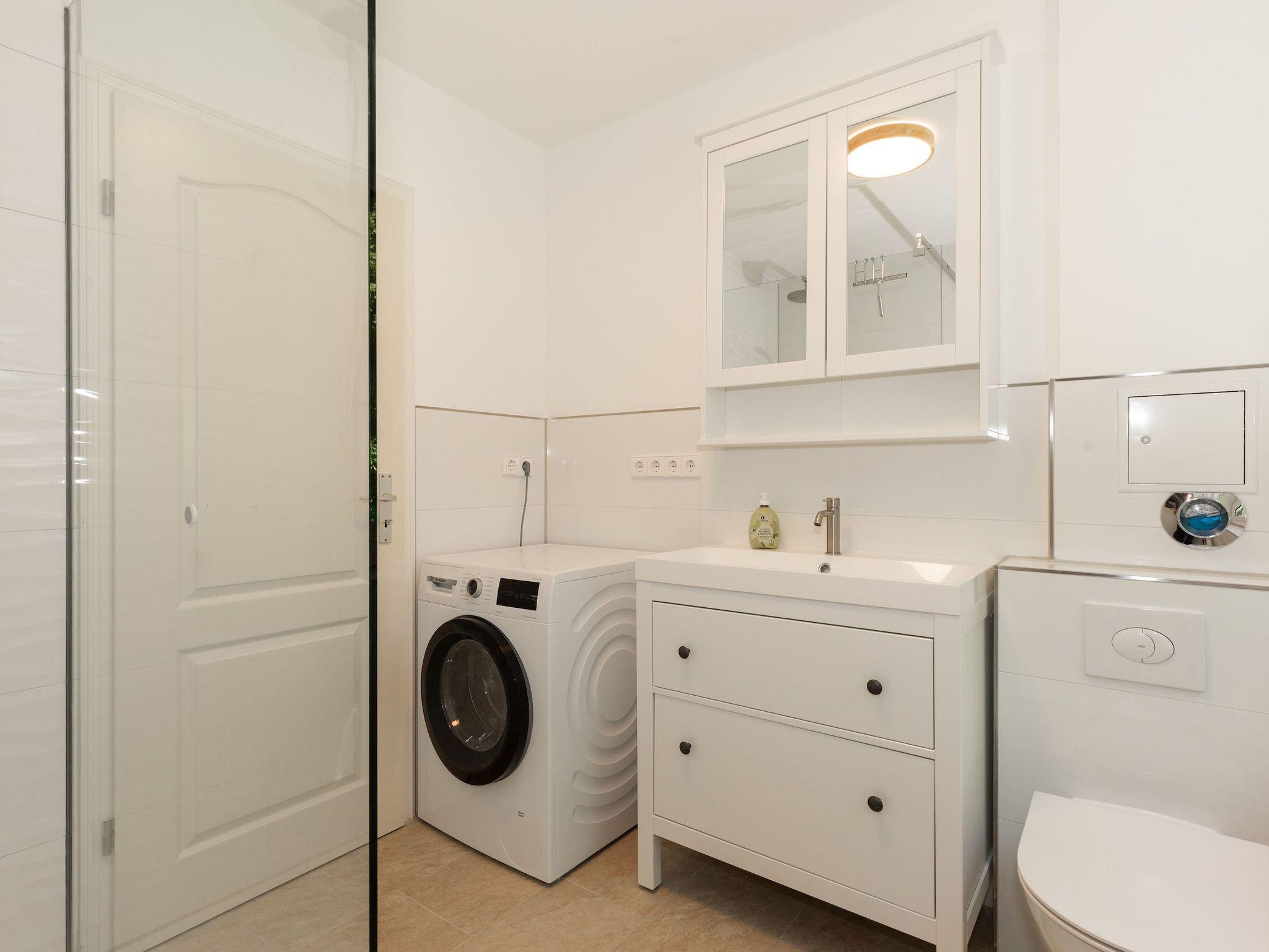 Das moderne Badezimmer verfügt über eine ebenerdige Dusche sowie eine Waschmaschine, ideal auch für längere Aufenthalte. Kostenloses WLAN ist selbstverständlich vorhanden, ebenso wie ein eigener Parkplatz direkt an der Wohnung bequem und stressfrei.