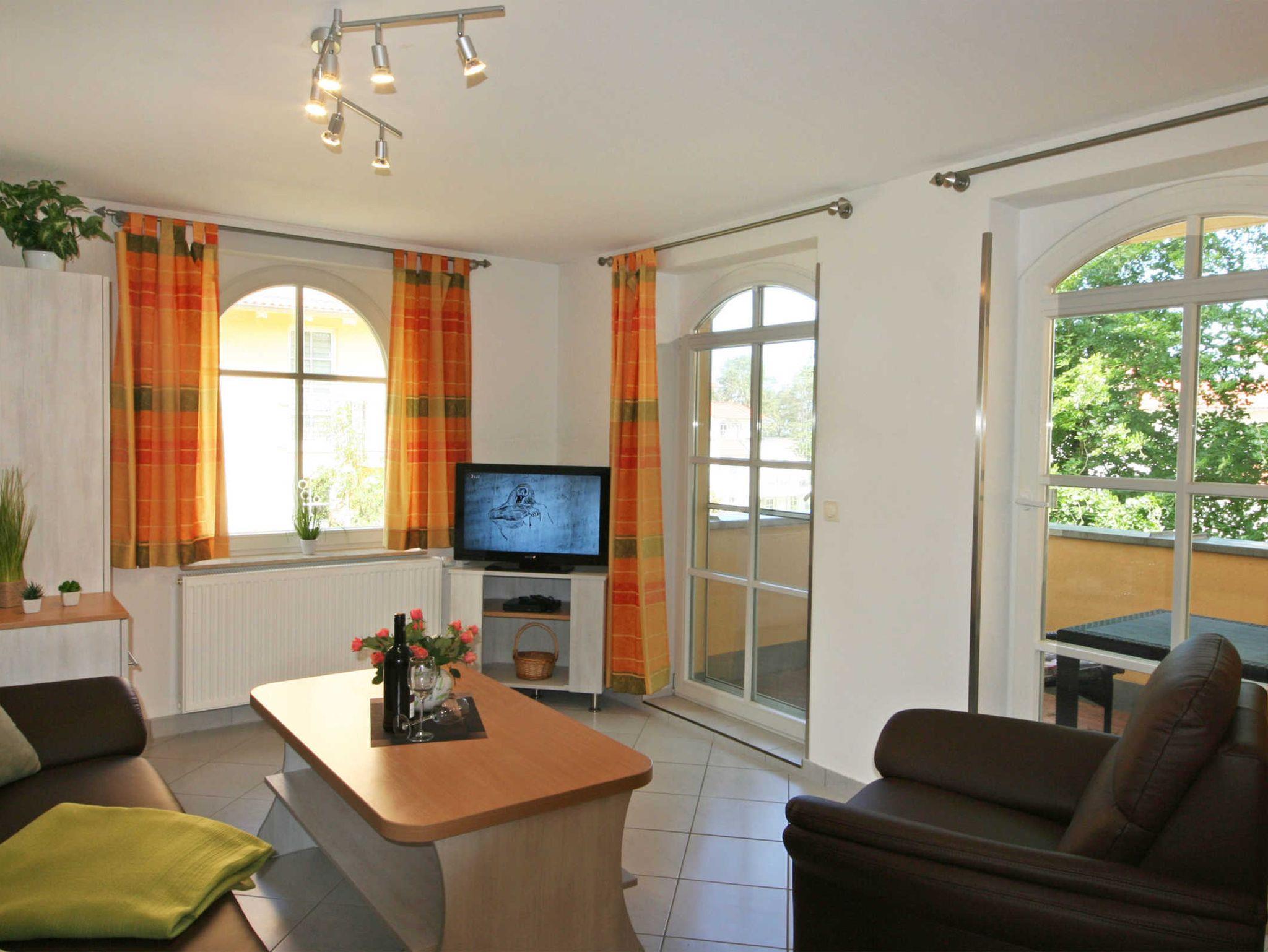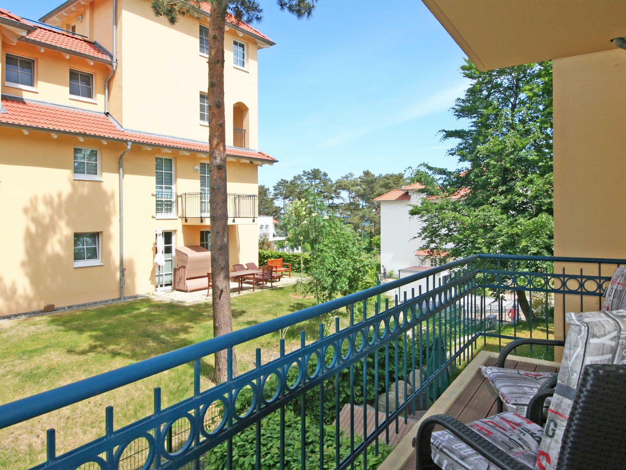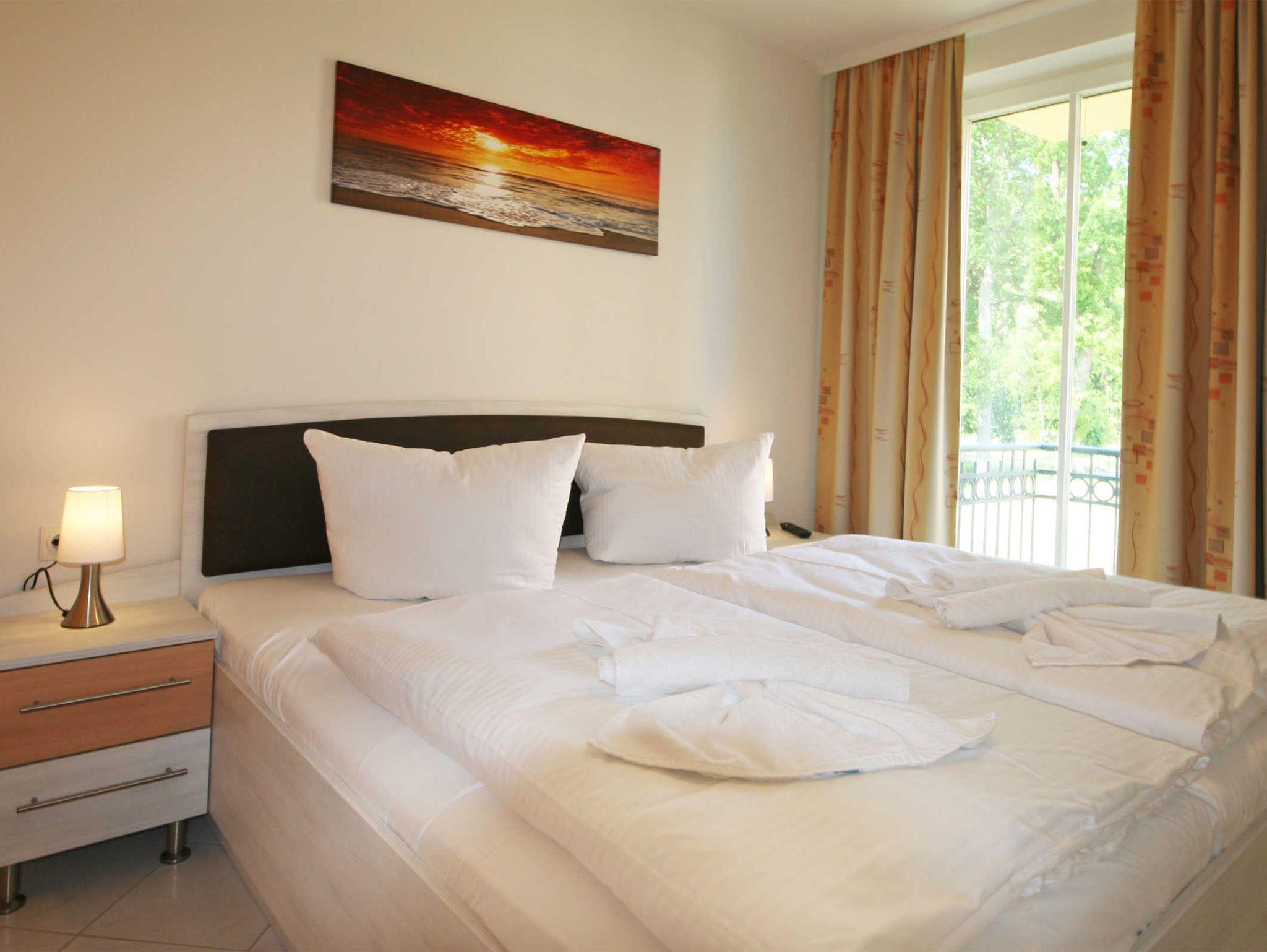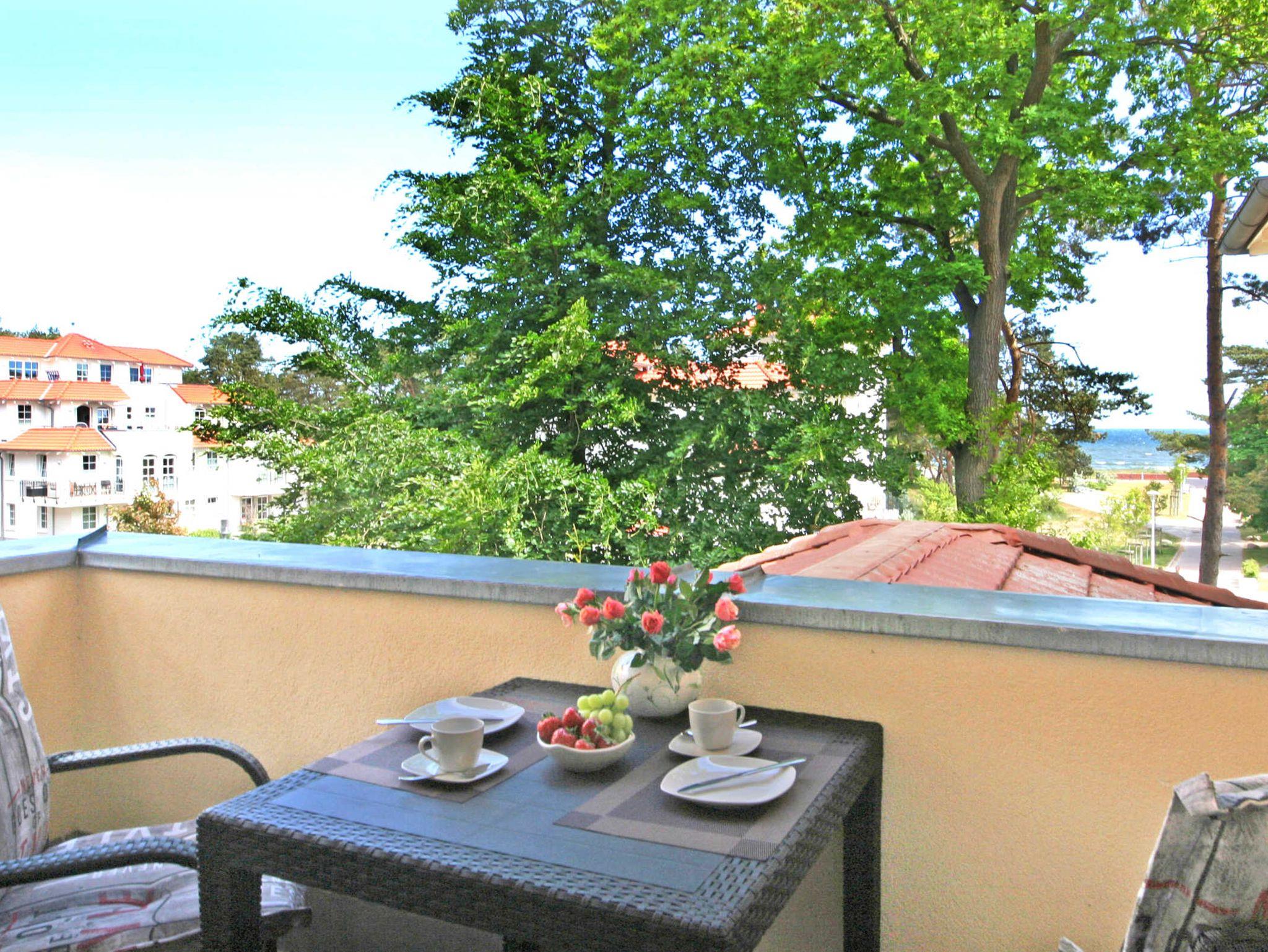 Helle 3-Zimmer-Ferienwohnung in Baabe mit Meerblick, zwei Balkonen und Sauna nahe dem Sandstrand.
