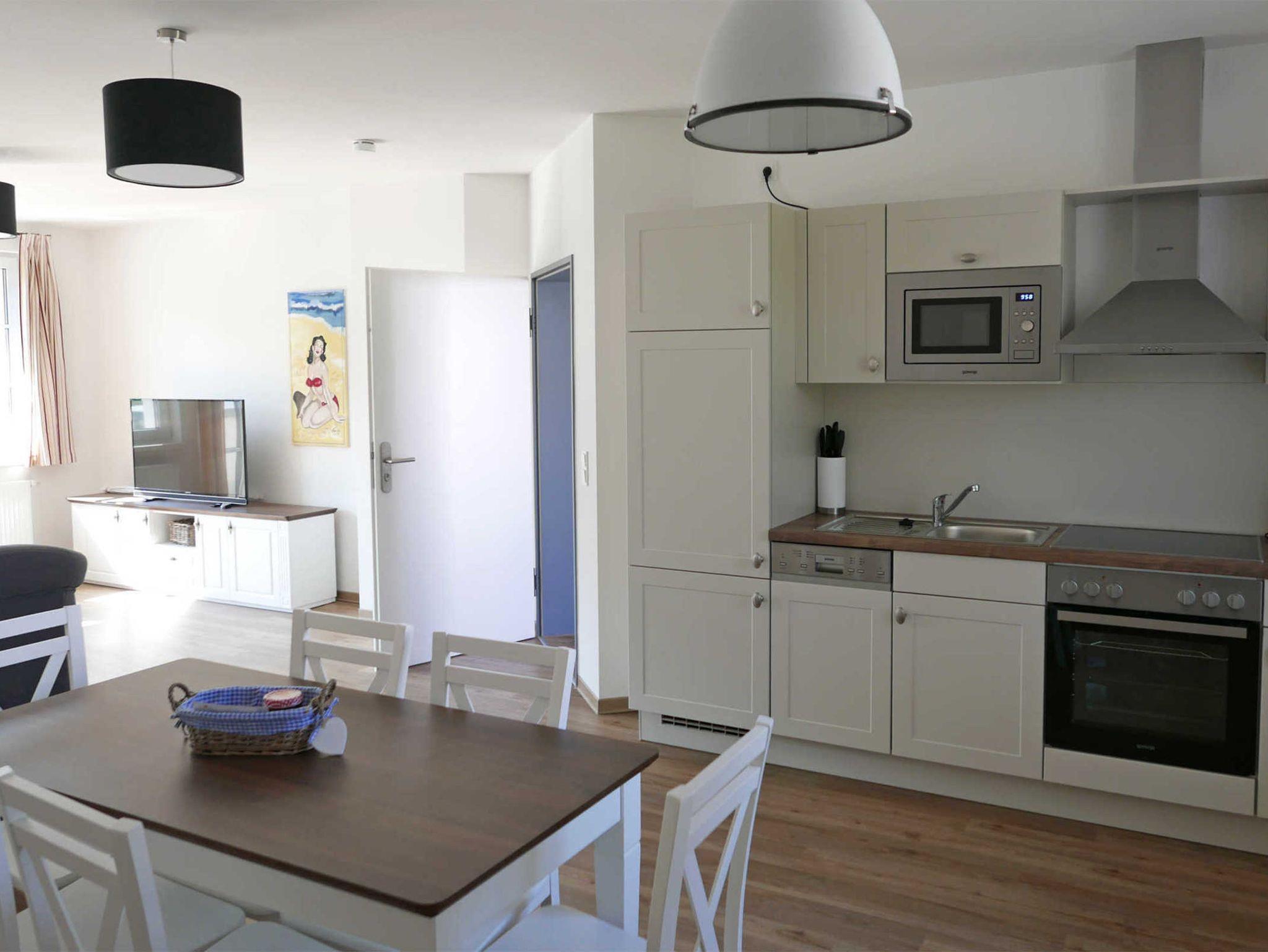 Neben dem Schlafsofa im kombinerten Wohn-/Schlafraum bieten 2 separate Schlafzimmer mit Doppelbett genügend Schlafgelegenheiten für Gäste. WLAN ist ebenfalls vorhanden. Die offene Küchenzeile ist mit Kühlschrank, 4-Plattenherd, Mikrowelle und Geschirrspüler bestens auf Gäste eingestellt.
