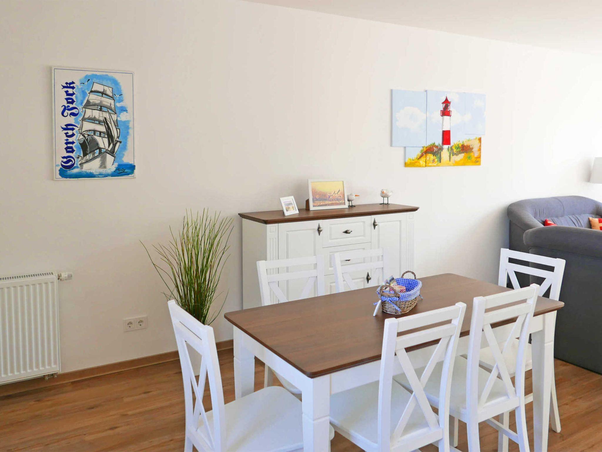 Die Ferienwohnung Sandbank bietet auf 89 Quadratmetern reichlich Platz für bis zu 6 Personen. Das helle Wohnzimmer macht mit geweißten Holzmöbeln so richtig Lust auf Urlaub. Der Balkon bietet einen tollen Meerblick.
