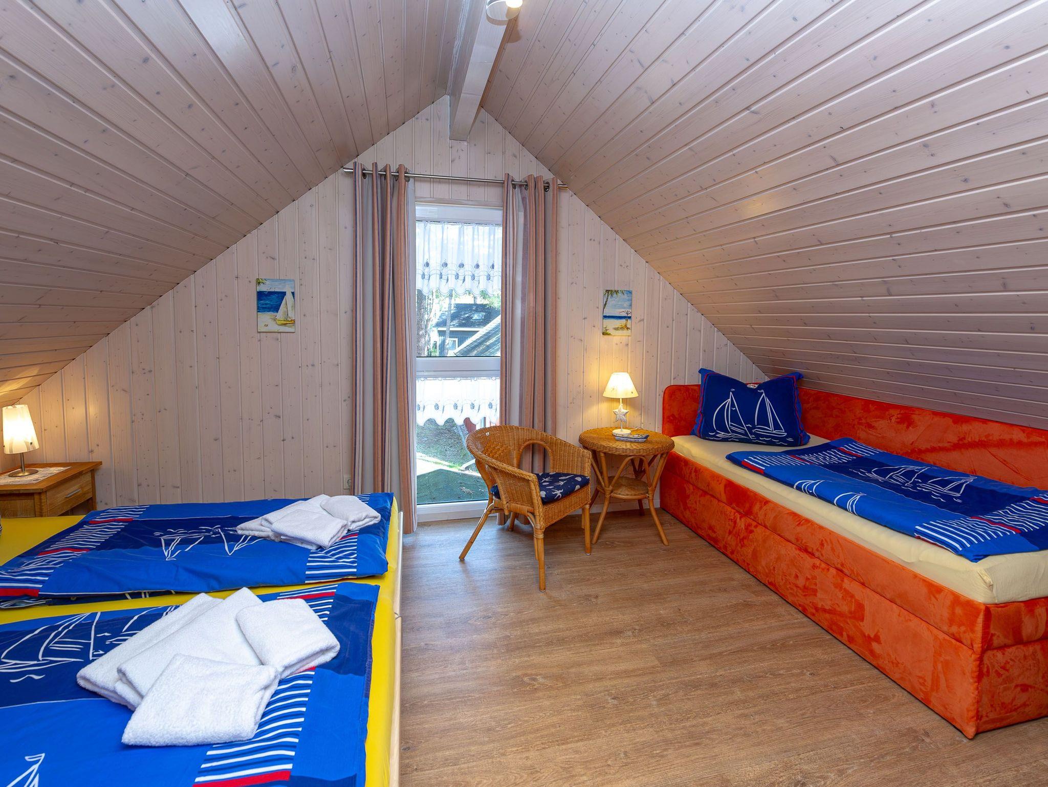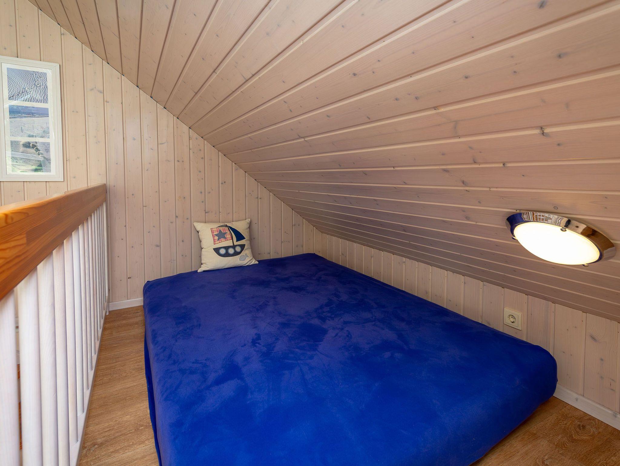 Im Obergeschoss finden Sie unter gemütlichen Dachschrägen ein weiteres Schlafzimmer mit einem Doppelbett und einem Einzelbett vor. In der offenen Galerie bietet eine Relaxecke mit zwei bequemen Schwingstühlen ein zauberhaftes Plätzchen mit Blick nach draußen.