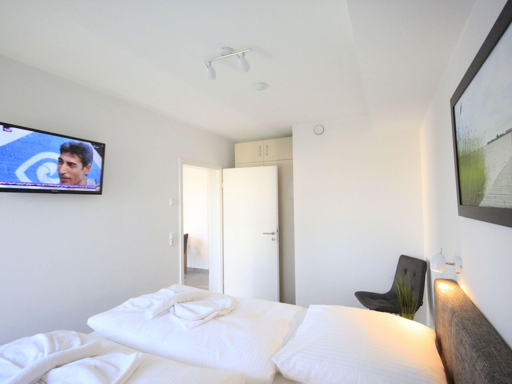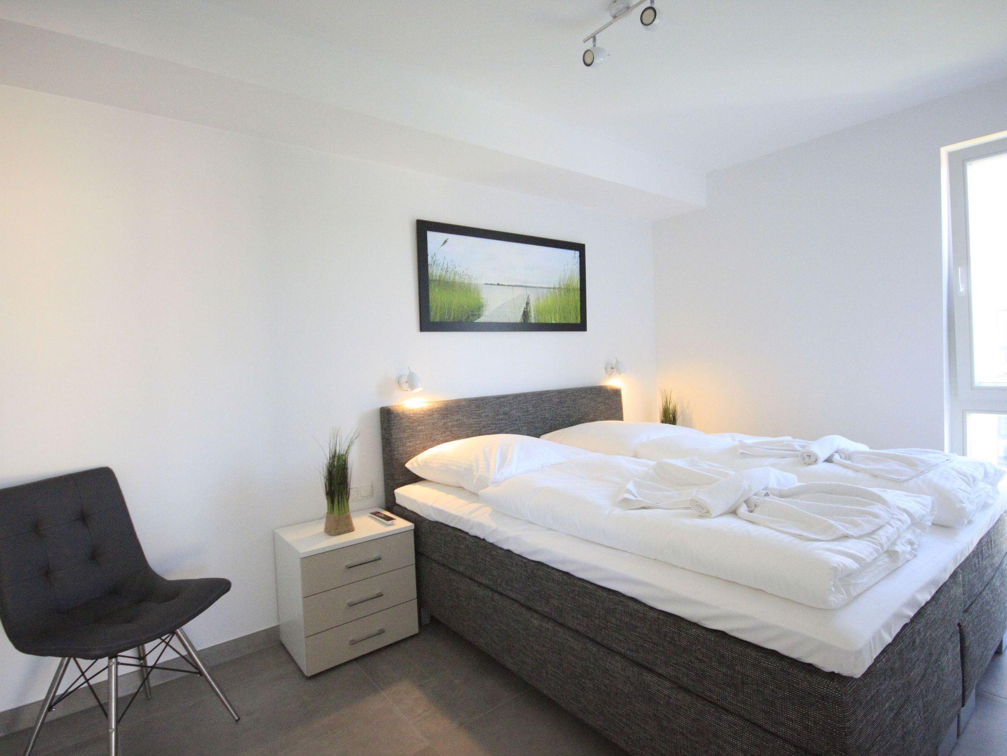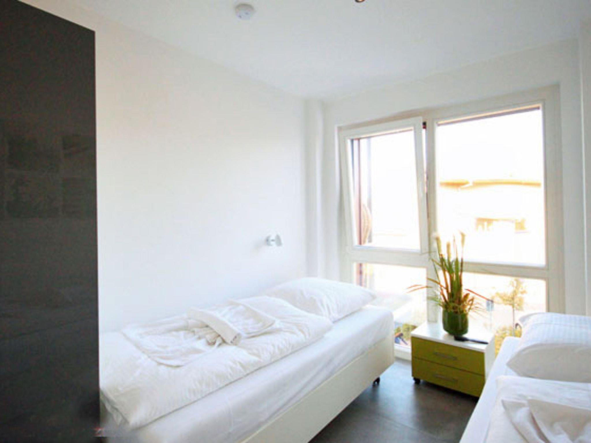 Die 72 qm große Wohnung ist wie folgt aufgeteilt: 1 Schlafzimmer mit Doppelbett (Boxspringbett), Flachbild-TV und DVD Player, 1 Schlafzimmer mit zwei Einzelbetten, die jedoch auch zu einem Doppelbett zusammengeschoben werden können. Auch hier gibt es einen Flachbildfernseher. In beiden Schlafzimmern befindet sich ein großer Kleiderschrank. Das Badezimmer ist das Highlight der Wohnung: Hier befindet sich neben der Whirlpool-Wanne (Jaccuzzi) und der ebenerdigen Dusche auch eine Sauna.