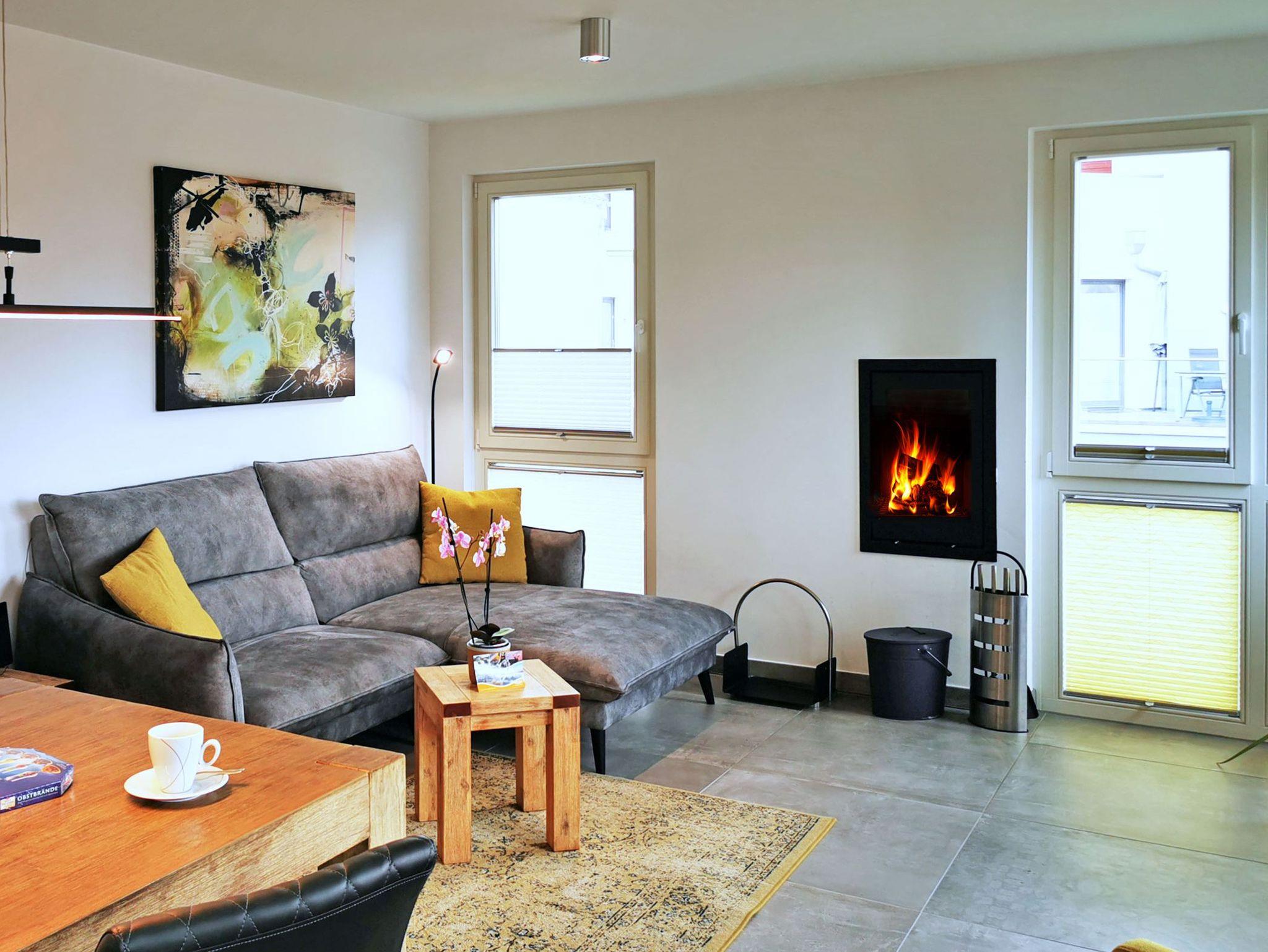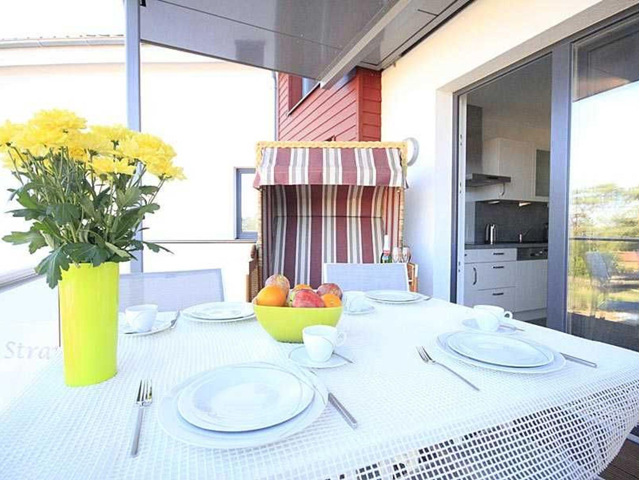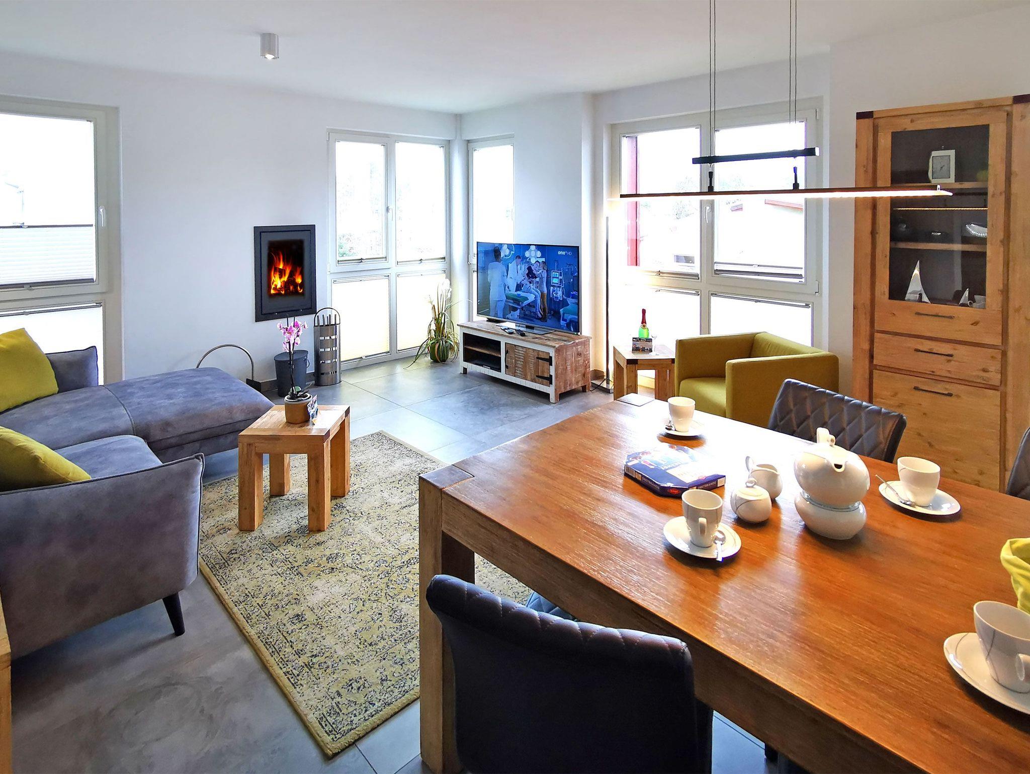 Die gesamte Wohnung ist stufenfrei und sehr hochwertig eingerichtet mit vielen kleinen Details. Besonders schön: Der Strandkorb auf der Balkonterrasse mit Blick zum Meer. Der großzugig geschnittene Wohn- und Essbereich verfügt über eine gemütliche Sofaecke, einen großen Flachbild-TV sowie einen modernen Kamin für kuschelige Abende.