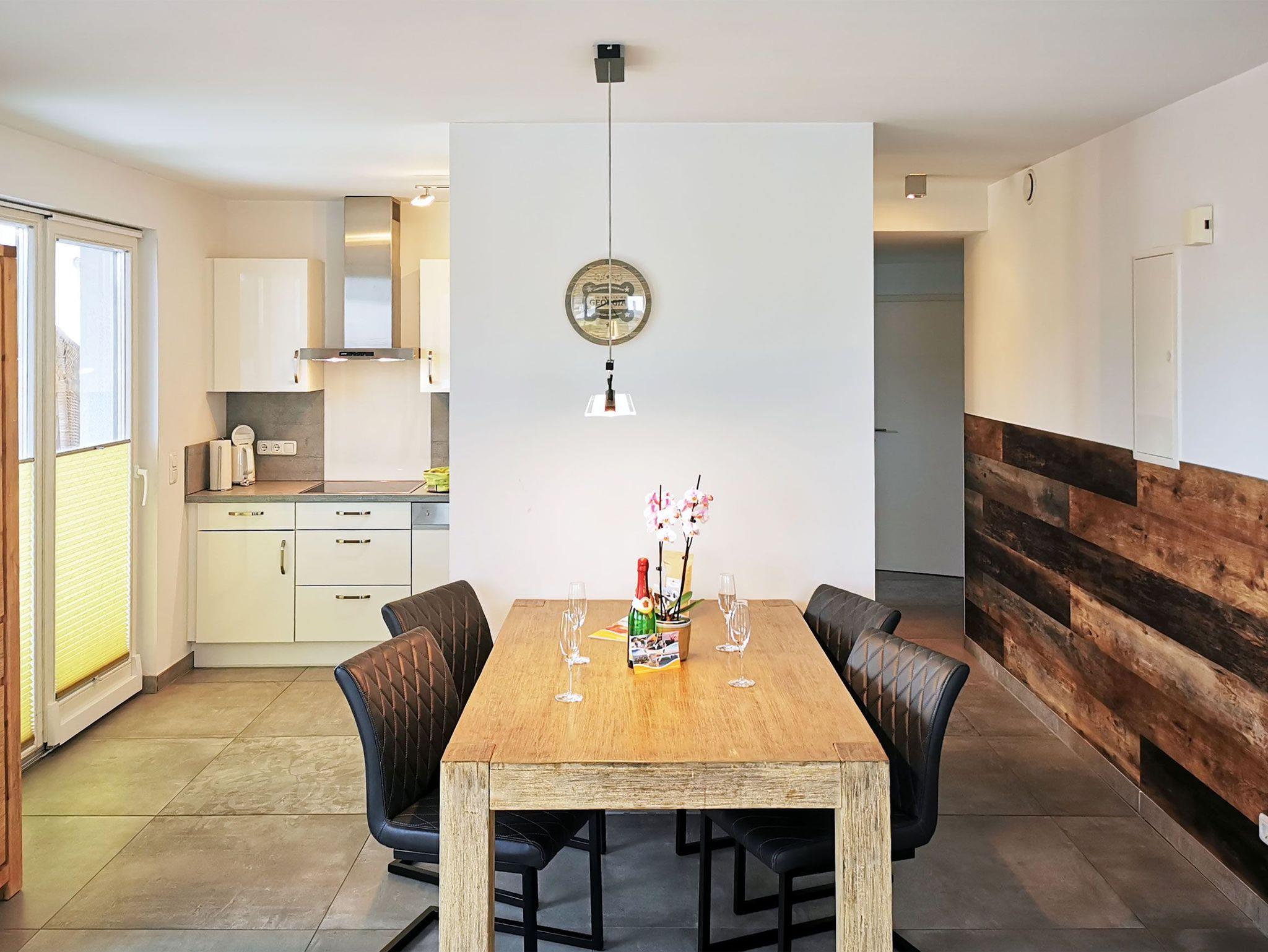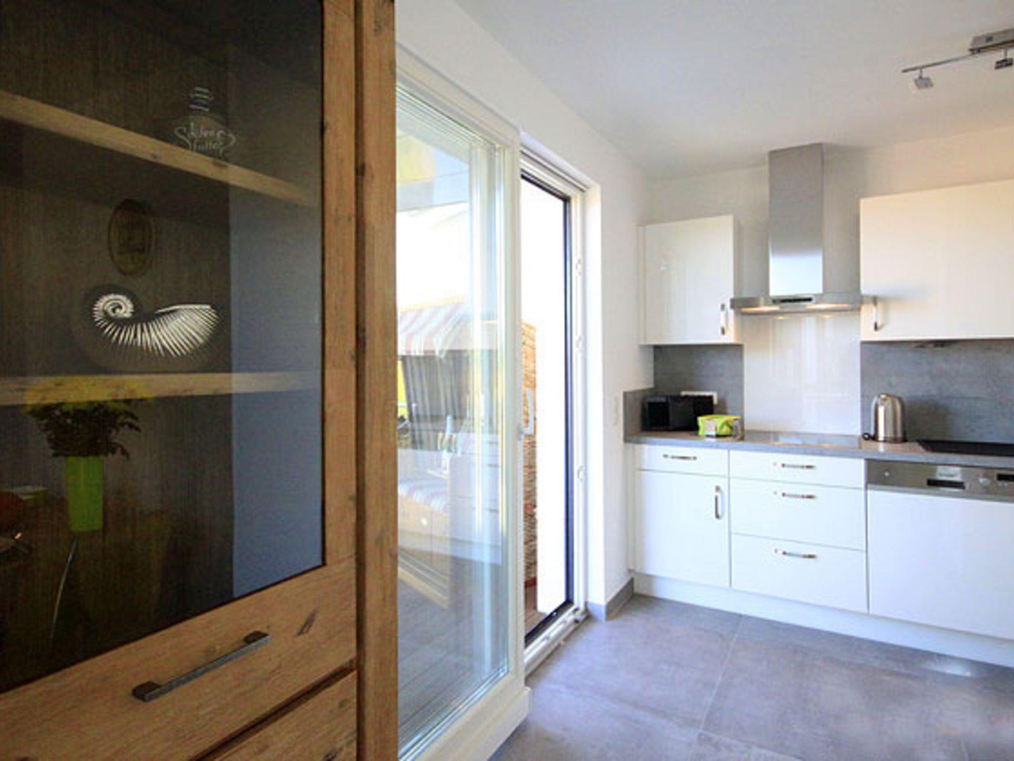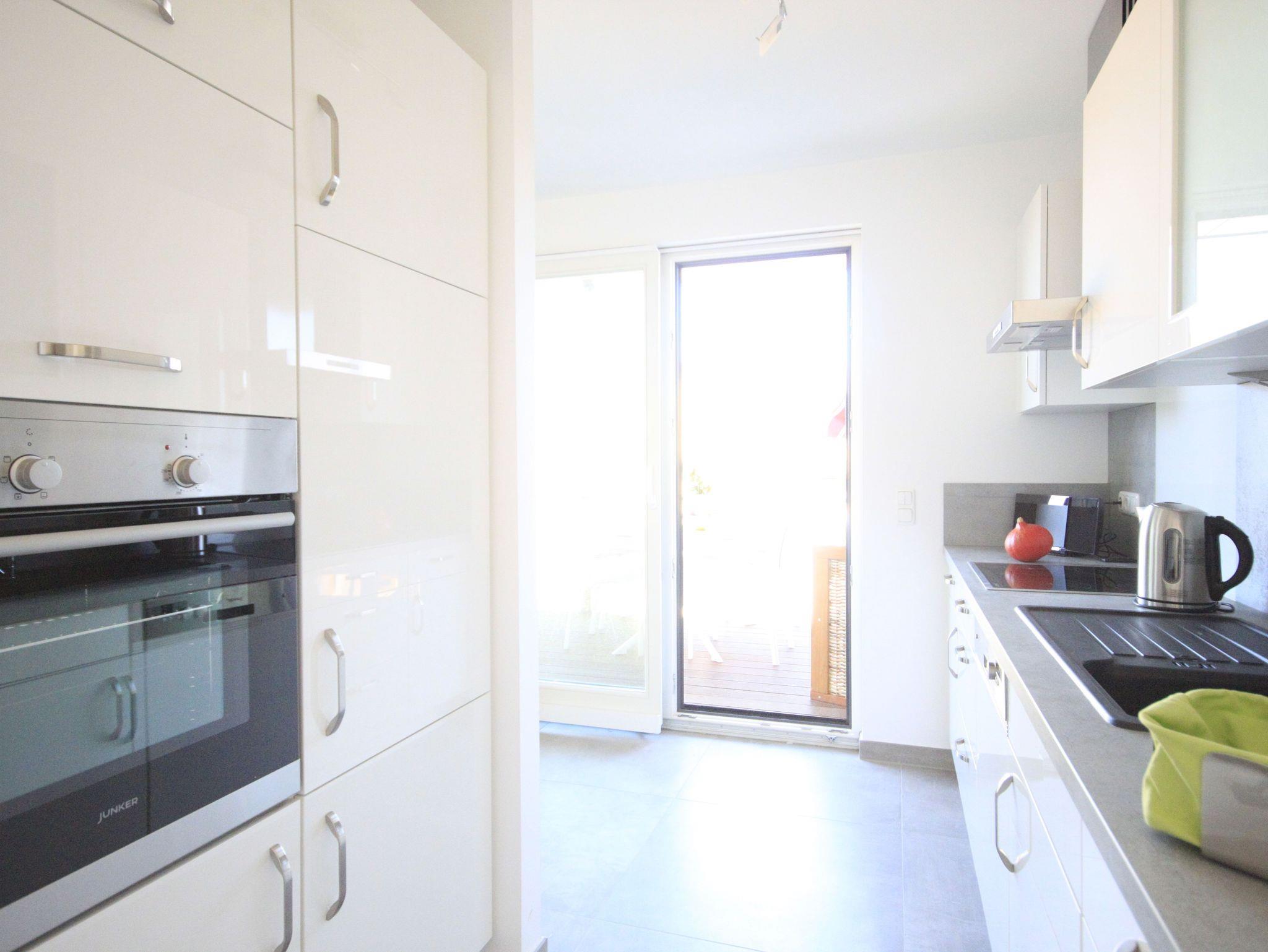 An den komfortablen Essbereich schließt sich die halb offene, voll ausgestattete Küche mit Induktionsherd und Geschirrspüler an. Aus der Küche betritt man den 9qm großen Balkon mit Strandkorb und Essplatz, hier bietet sich ein schöner Blick bis zum Meer.