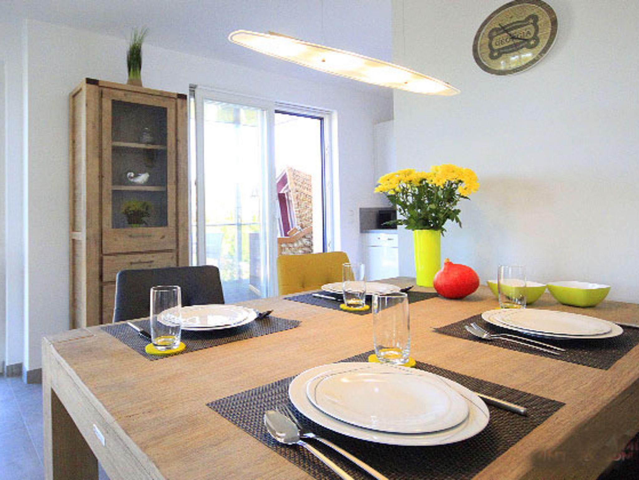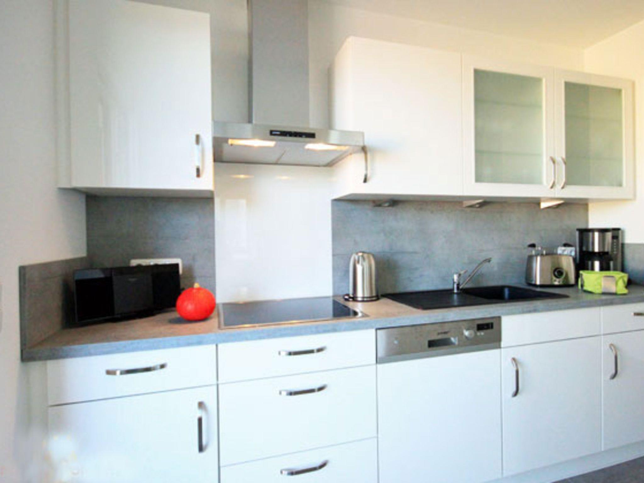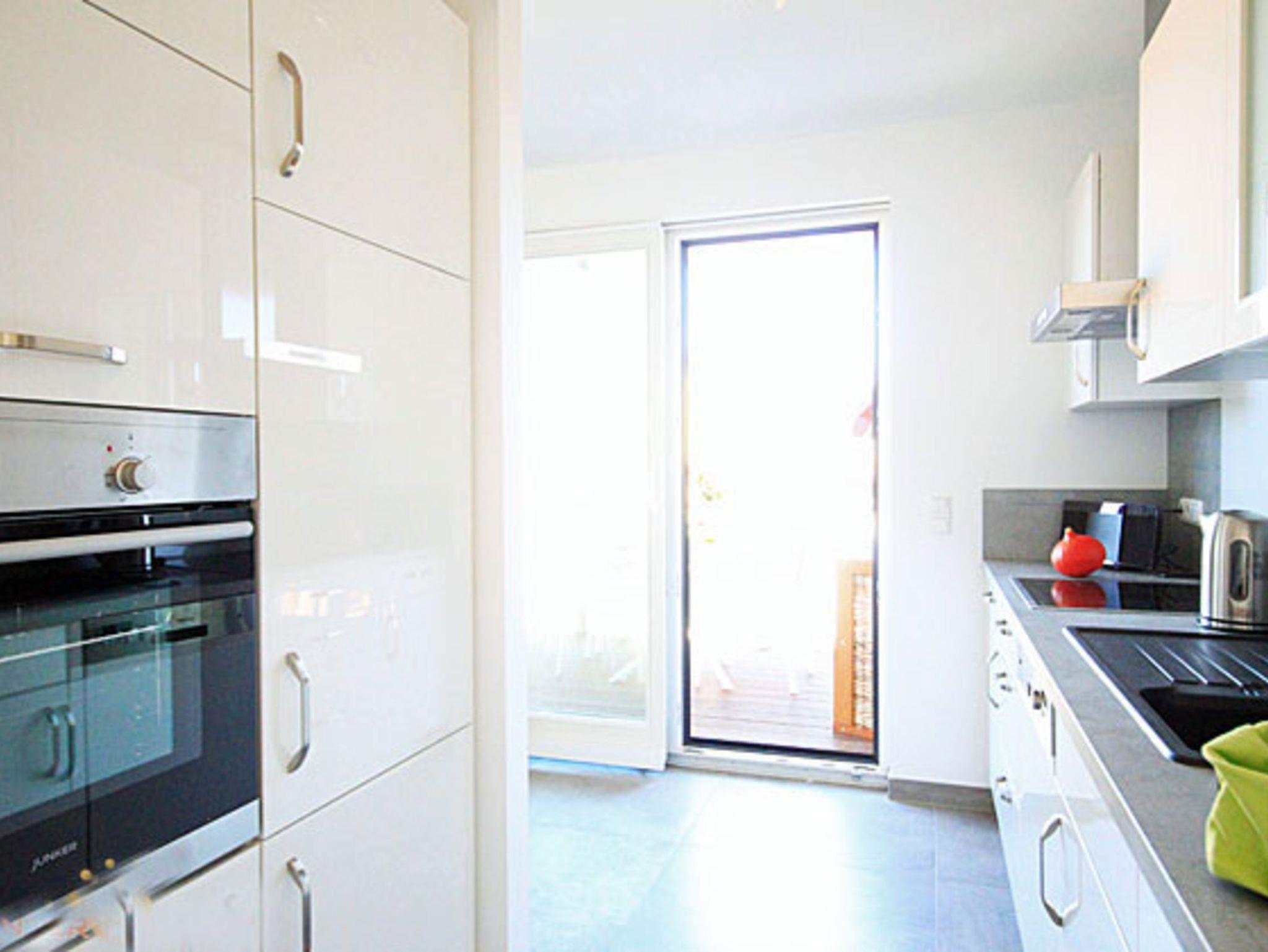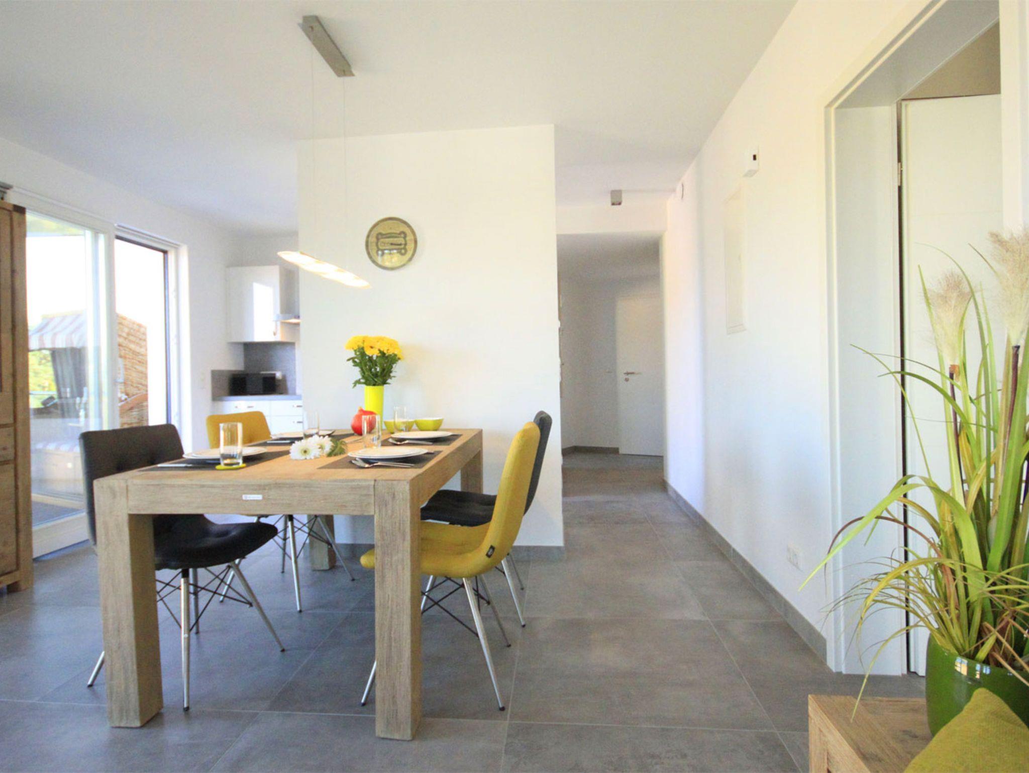 An den komfortablen Essbereich schließt sich die halb offene, voll ausgestattete Küche mit Induktionsherd und Geschirrspüler an. Aus der Küche betritt man den 9qm großen Balkon mit Strandkorb und Essplatz, hier bietet sich ein schöner Blick bis zum Meer.