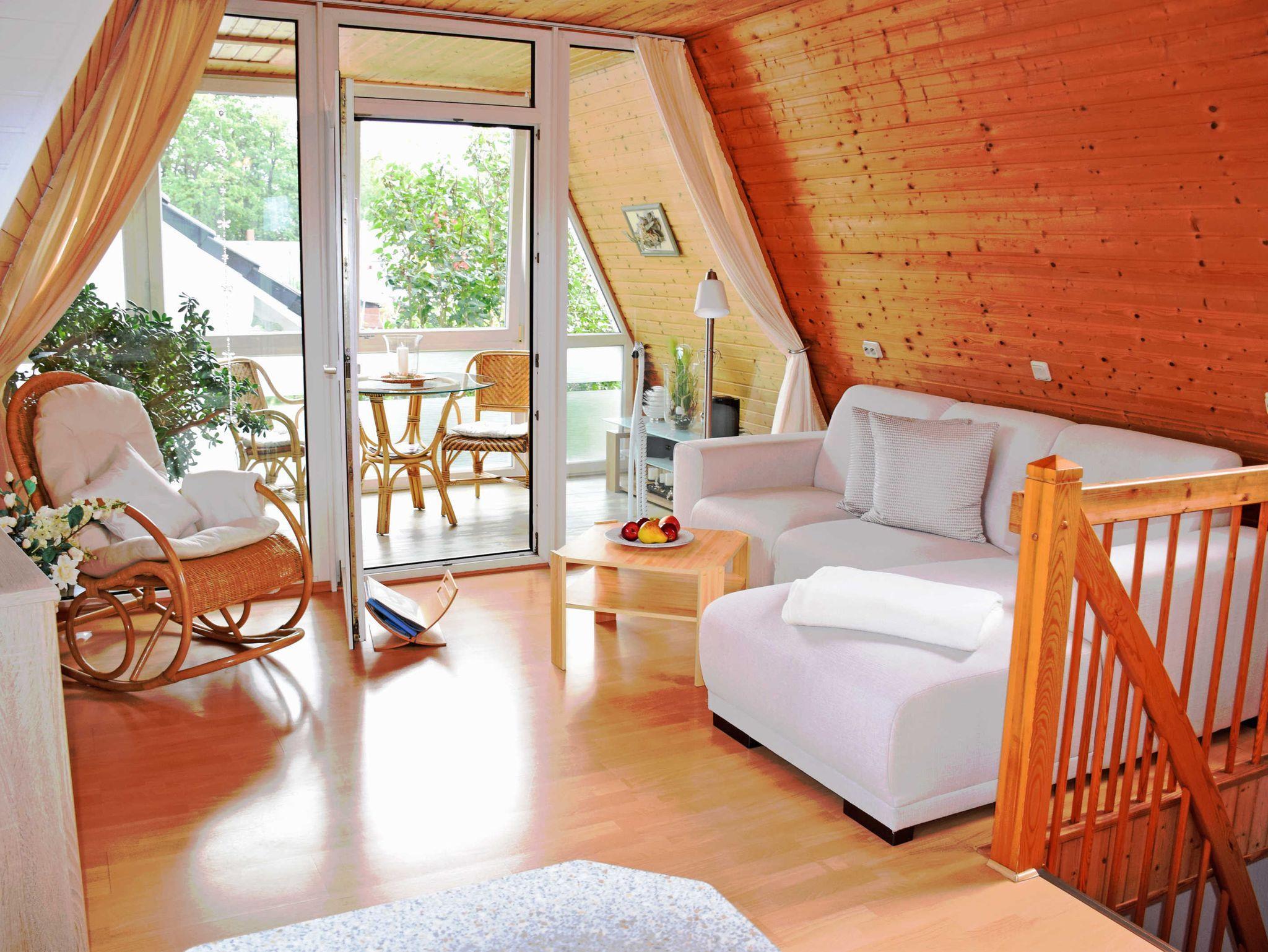 Die Ferienwohnung Gartenseite liegt in einem Doppelhaus und verfügt über einen separaten Eingang. Sie ist ca. 50 qm groß, hat Platz für maximal 2 Personen und wurde modern und hochwertig eingerichtet. Im gemütlichen Wintergarten können Sie am Morgen Ihr Frühstück bei weit geöffneten Fenster und frischer Luft einnehmen. Im Wohnraum, der sich im Obergeschoss befindet und über eine Holztreppe erreicht wird, befinden sich eine bequeme Sitzcouch mit Sessel, Tisch und ein modernes Flachbild-TV-Gerät. Hier steht auch ein Esstisch mit Sitzgelegenheiten. Die moderne Küchenzeile ist mit einem Herd, Abzugshaube, Backofen, Geschirrspüler, Wasserkocher, Kaffeemaschine, Toaster und Kühlschrank komplett ausgestattet.