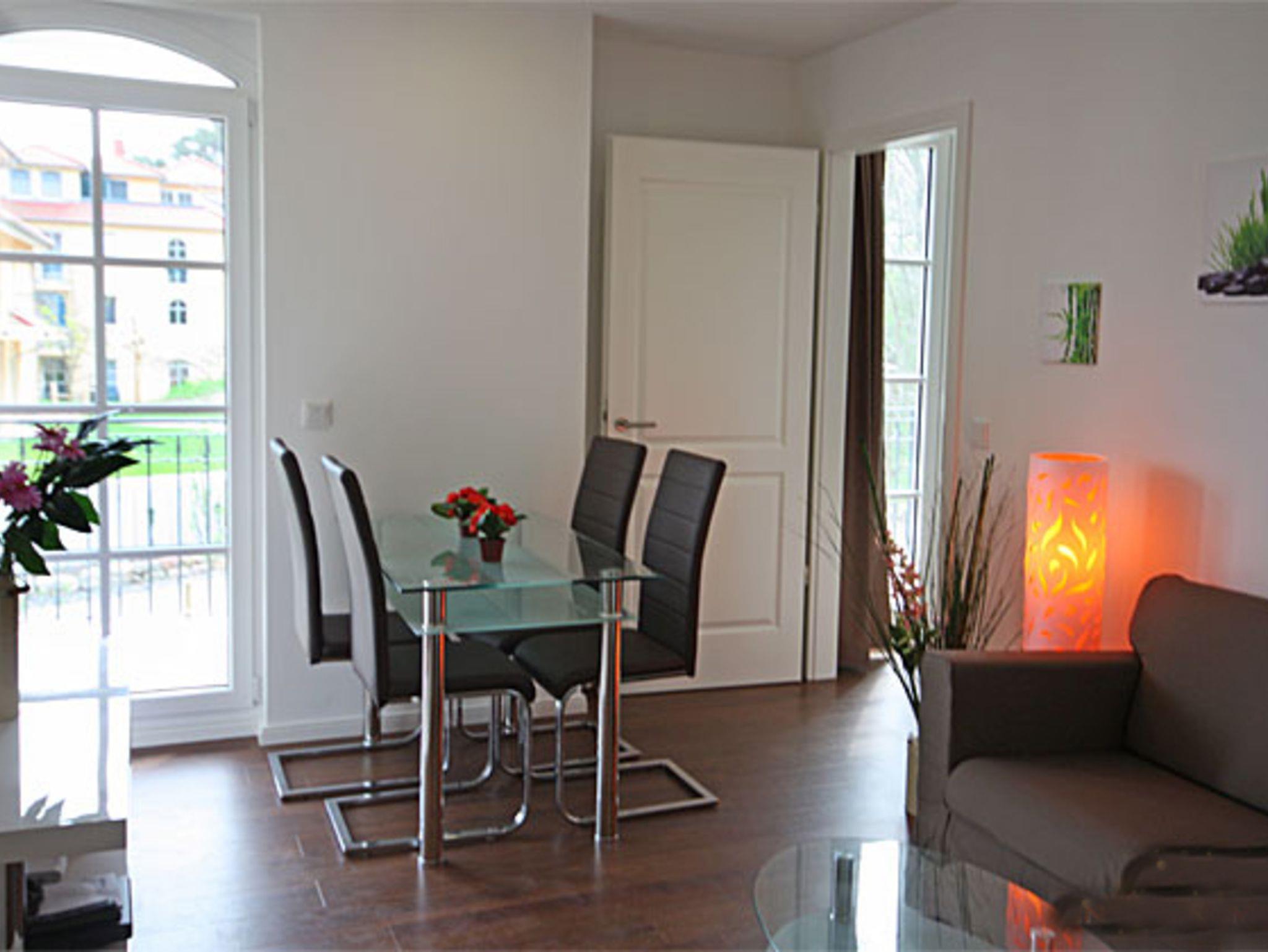 Die 3-Zimmer-Ferienwohnung Bernstein ist hochwertig und komfortabel ausgestattet, hat zwei sonnige Balkone und ist für 2 bis 4 Personen buchbar. Das Appartement liegt im 2. Obergeschoss der Residenz Haus Meeresblick direkt in den Dünen am Strand von Baabe mit Blick auf den Kurpark.