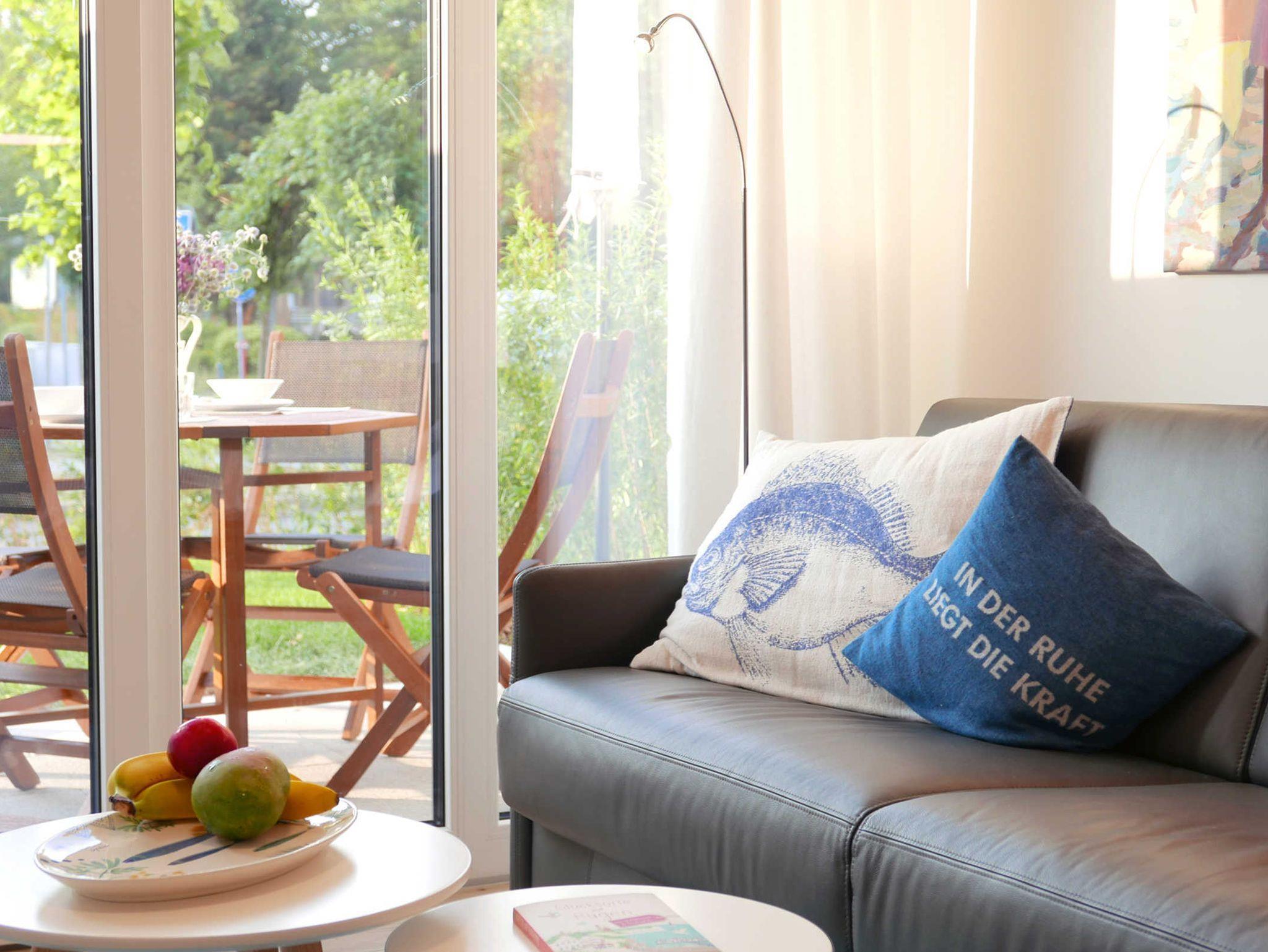 Moderne 2-Zimmer-Ferienwohnung in Baabe mit Terrasse, kleinem Garten, Strandkorb und seitlich eingeschränktem Meerblick.