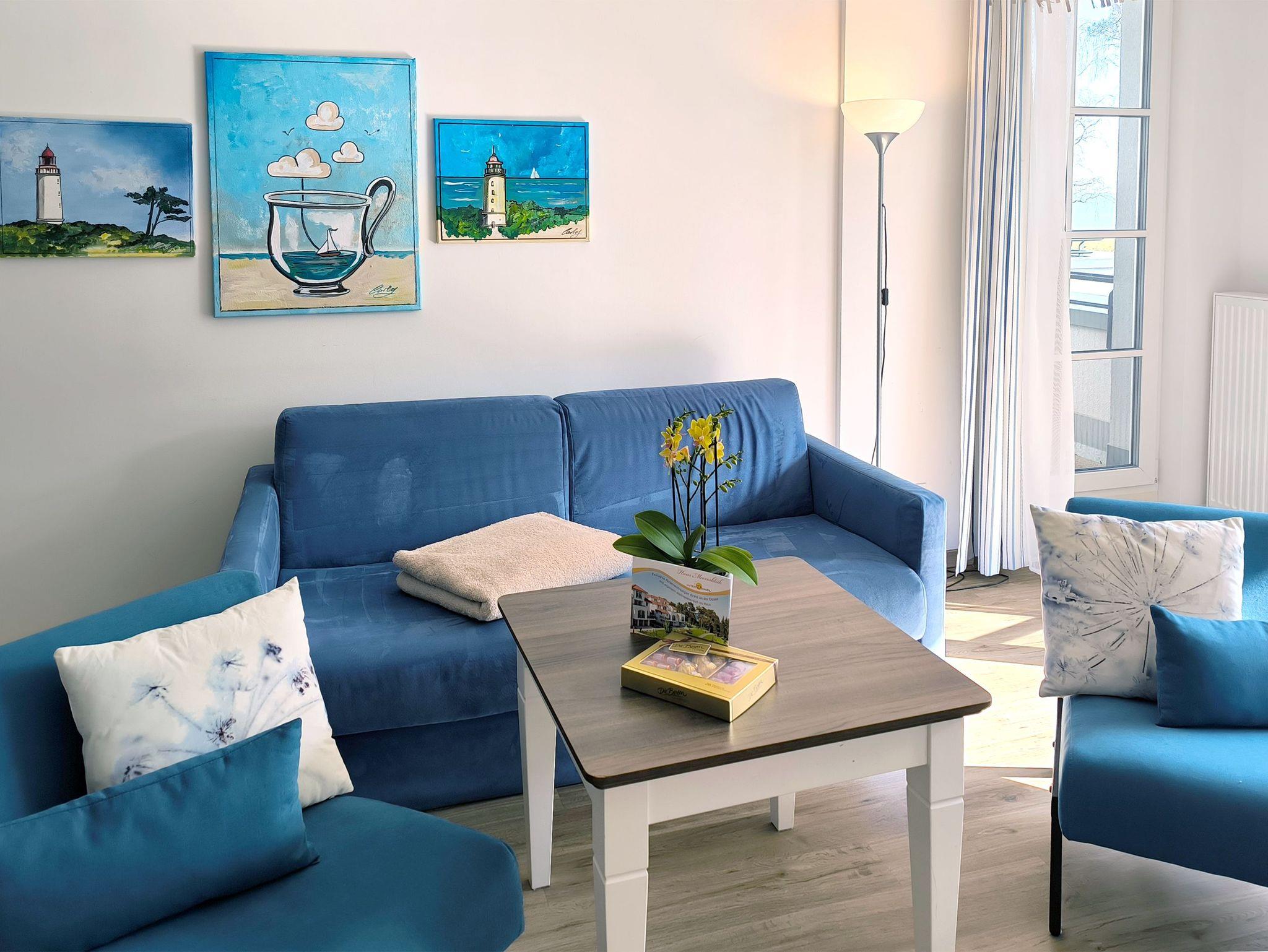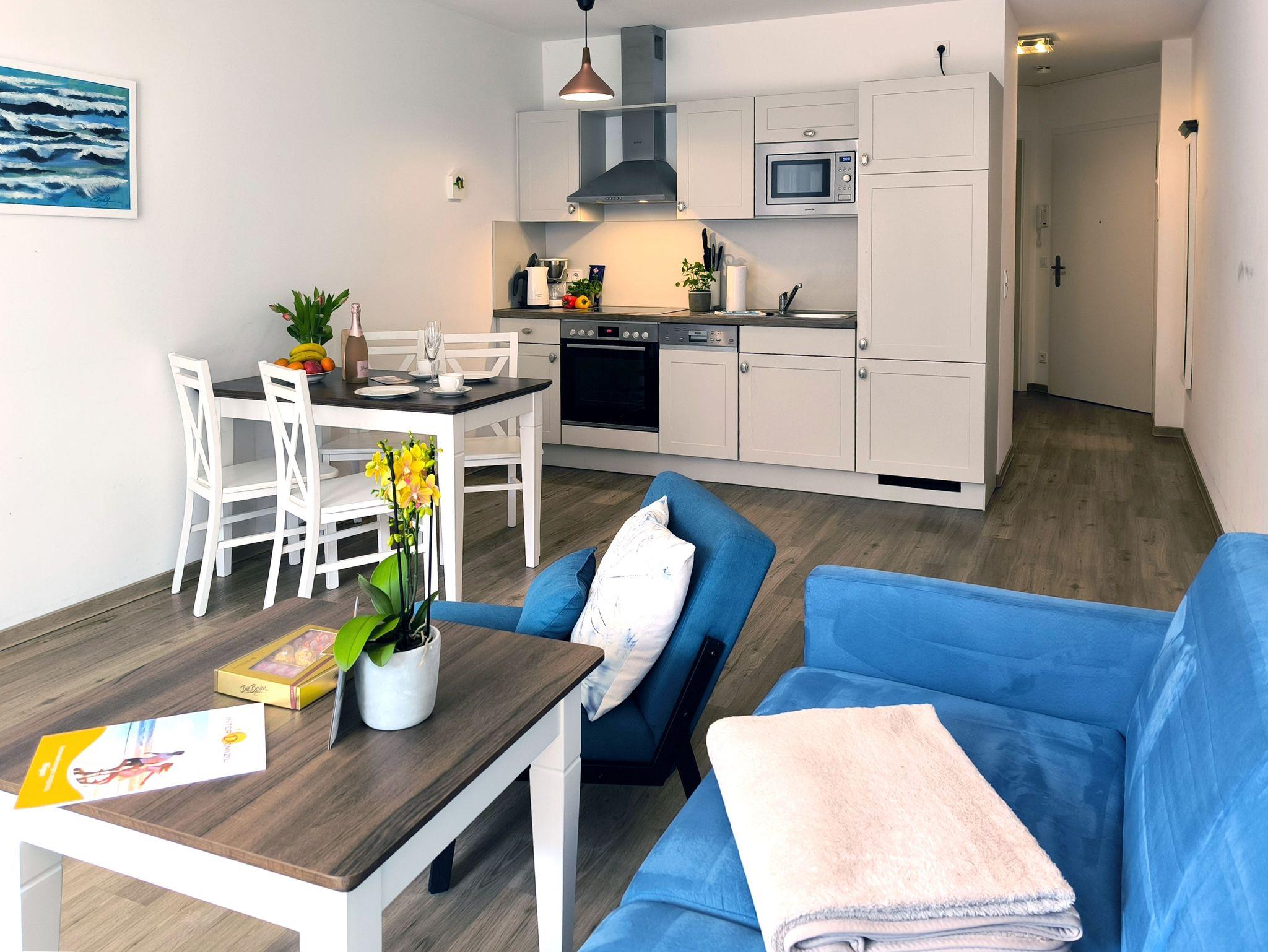 Schöne helle 2 Zimmer Ferienwohnung für bis zu 2 Personen, mit Meerblick vom Wohnzimmer und Balkon aus in der kleinen Residenz Inselparadies, direkt am Meer gelegen. Insgesamt sind es nur 13 Wohneinheiten, alle mit Balkon zum Meer liegen und erst im Jahr 2017 eröffnet wurde . In der unteren Etage befinden sich kleine Geschäfte und das Cafe Zeit. Zu jeder Wohnung gehört ein Tiefgaragenstellplatz.