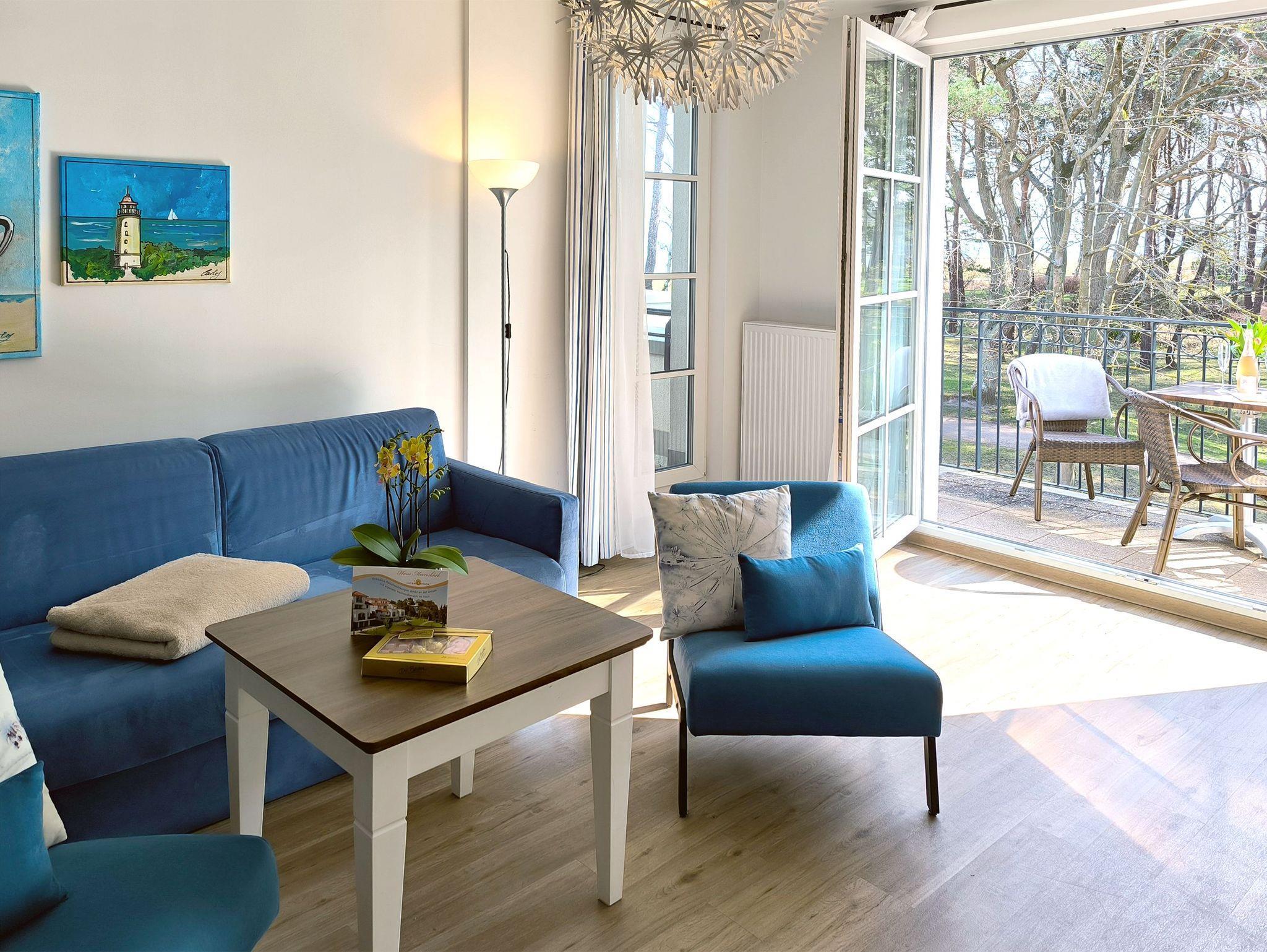 Helle 2-Zimmer-Ferienwohnung mit Meerblick und Balkon in Baabe, direkt am Strand und mit Tiefgaragenstellplatz.