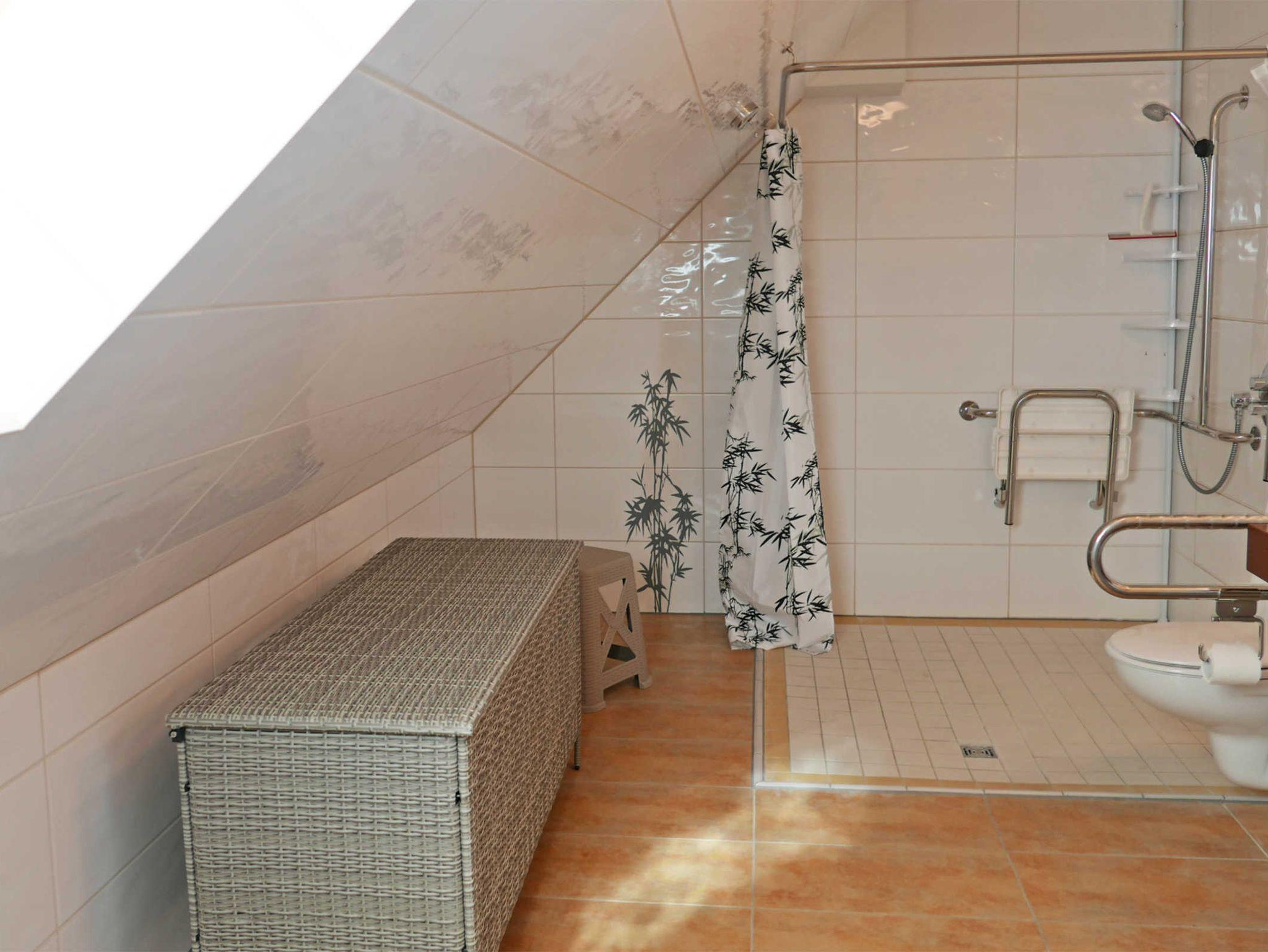 Es gibt zwei vollwertige Bäder mit jeweils rollstuhlgerechten Duschen, WC’s und unterfahrbaren Waschtischen. Auch die Türen sind mit 1mtr. lichte Breite für Rollstühle geeignet. Alles ist auf einer Ebene.