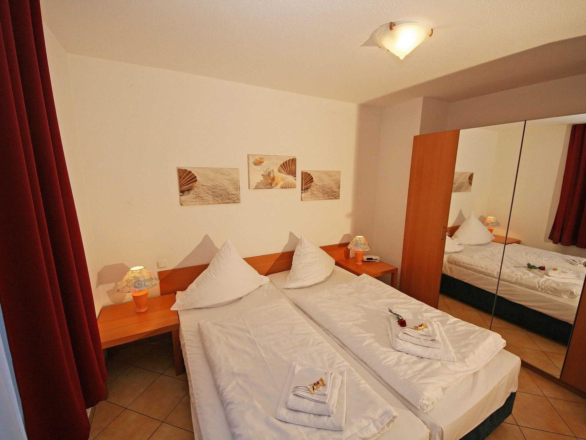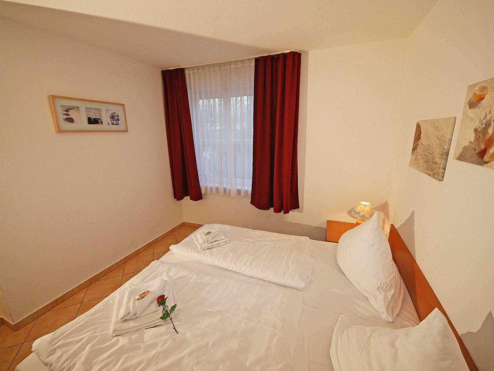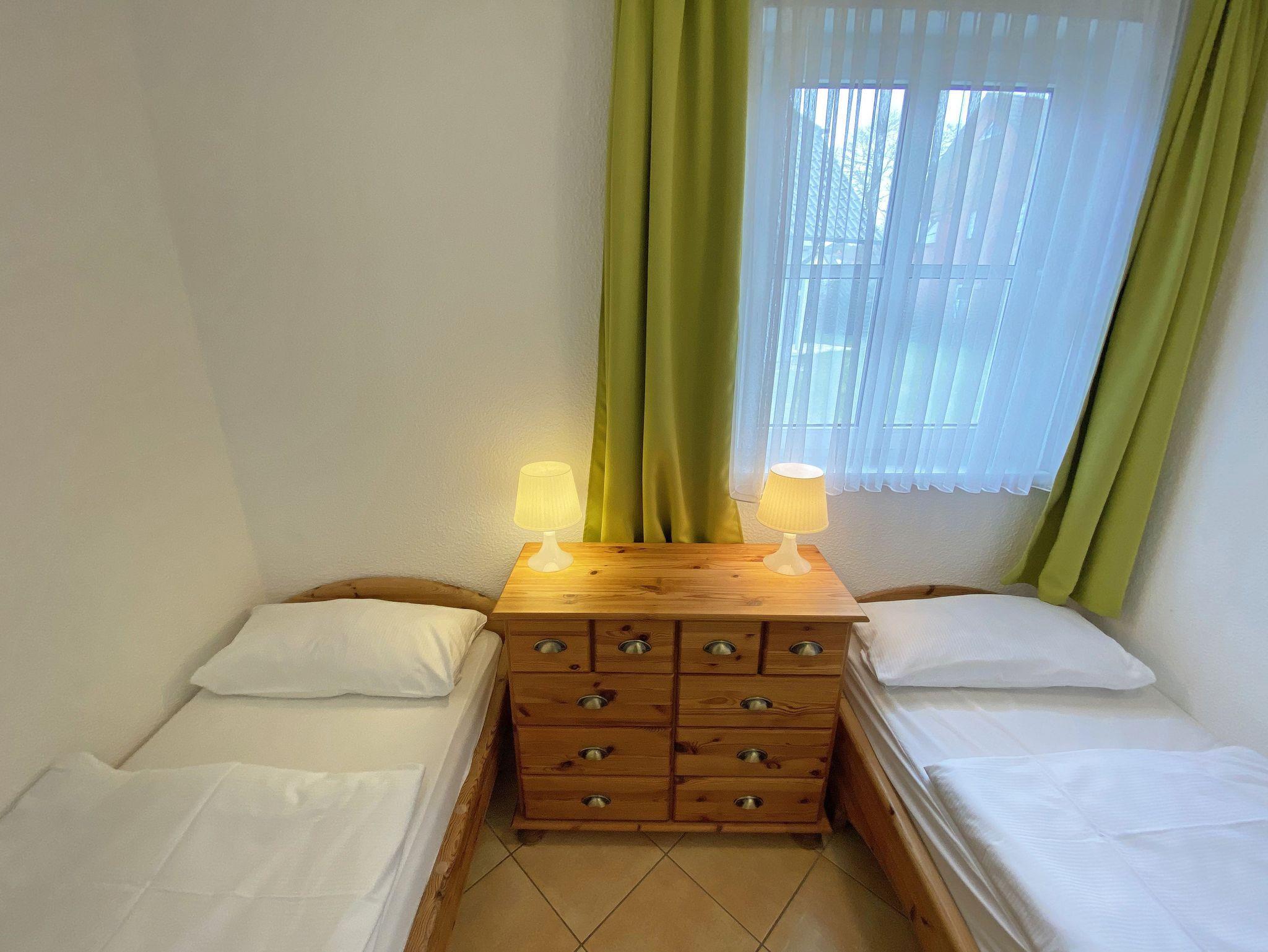 Die gemütliche und komfortable 3-Raum-Nichtraucherwohnung mit ca. 55qm Wohnfläche befindet sich im Erdgeschoss und bietet ausreichend Platz für 2 Erw. + 2 Kinder bis 17 Jahre. Die im Rügener Stil behaglich eingerichtete Ferienwohnung bietet einen großzügigen Wohn- Essbereich mit Zugang auf die teilweise überdachte Terrasse. Die kleine aber komplett eingerichtete Küchenzeile mit Geschirrspüler, Backofen, 4 Herdplatten, Kaffeemaschine, Toaster, Wasserkocher sowie diverse Küchenutensilien lassen keine Wünsche offen und grenzen an den Wohnbereich. Im Wohn- Essbereich erwartet Sie ein Esstisch mit 4 Stühlen, eine gemütliche Couch mit einem Sideboard sowie einen LCD Sat-TV in HD-Qualität für eine hohe Programmvielfalt, CD und DVD-Player sowie ein Radio mit USB-Anschluss und SD-Kartenleser. Vom Wohnbereich aus gelangen Sie auf die teilweise überdachte, im Bäderstil gehaltene und bestuhlte Terrasse (Richtung Süden) mit 2 zusätzlichen Sonnenliegen. Das 1. Schlafzimmer verfügt über 1 Doppelbett (2x90x200 cm) mit Nachtischkonsolen und einen viertürigen Kleiderschrank. Das Aufstellen eines Kinderreisebettes wäre hier möglich. Das 2. und damit kleinere Schlafzimmer ist mit 2 Einzelbetten (je 80x200cm), und Nachttischablagen ausgestattet. Beide Schlafzimmer sind abdunkelbar. Das geflieste Tageslicht-Bad bietet Ihnen eine Dusche, WC, Fön und einen Waschtisch. Auch im Urlaub brauchen Sie in der Wohnung nicht auf einen Internetanschluss (WLAN) verzichten. Dieser ist für Sie inklusive!!! In einem Gemeinschaftsraum können Sie eine Waschmaschine gegen eine Extragebühr nutzen (in den Monaten: November bis Ende März nicht im Betrieb). Ein Parkplatz Nr. 02 befindet sich vor dem Haus Rügenwelle und ist für Sie inklusive. Ihre mitgebrachten oder geliehenen Fahrräder können Sie auf dem Grundstück anschließen. Auf Wunsch kann auch 1x Kinderreisebett (mit Matratze, ohne Bett Inlett) / 1x Hochstuhl gestellt werden. 2 kleine Haustiere können gegen eine Gebühr dazu gebucht werden. Die Erstausstattung eines Wäschepaketes (komplette Bettwäsche, 1 Duschhandtuch, 2 kleine Handtücher) können Sie bis 14 Tage vor Anreise gegen einen Aufpreis dazu buchen oder durch eigene ergänzen. Ab 2 gebuchten Paketen erhalten Sie einmalig 1 Geschirrhandtuch und 1 Duschvorleger hinzu.