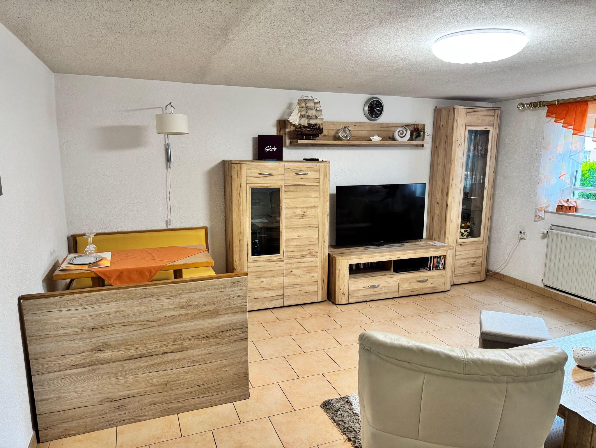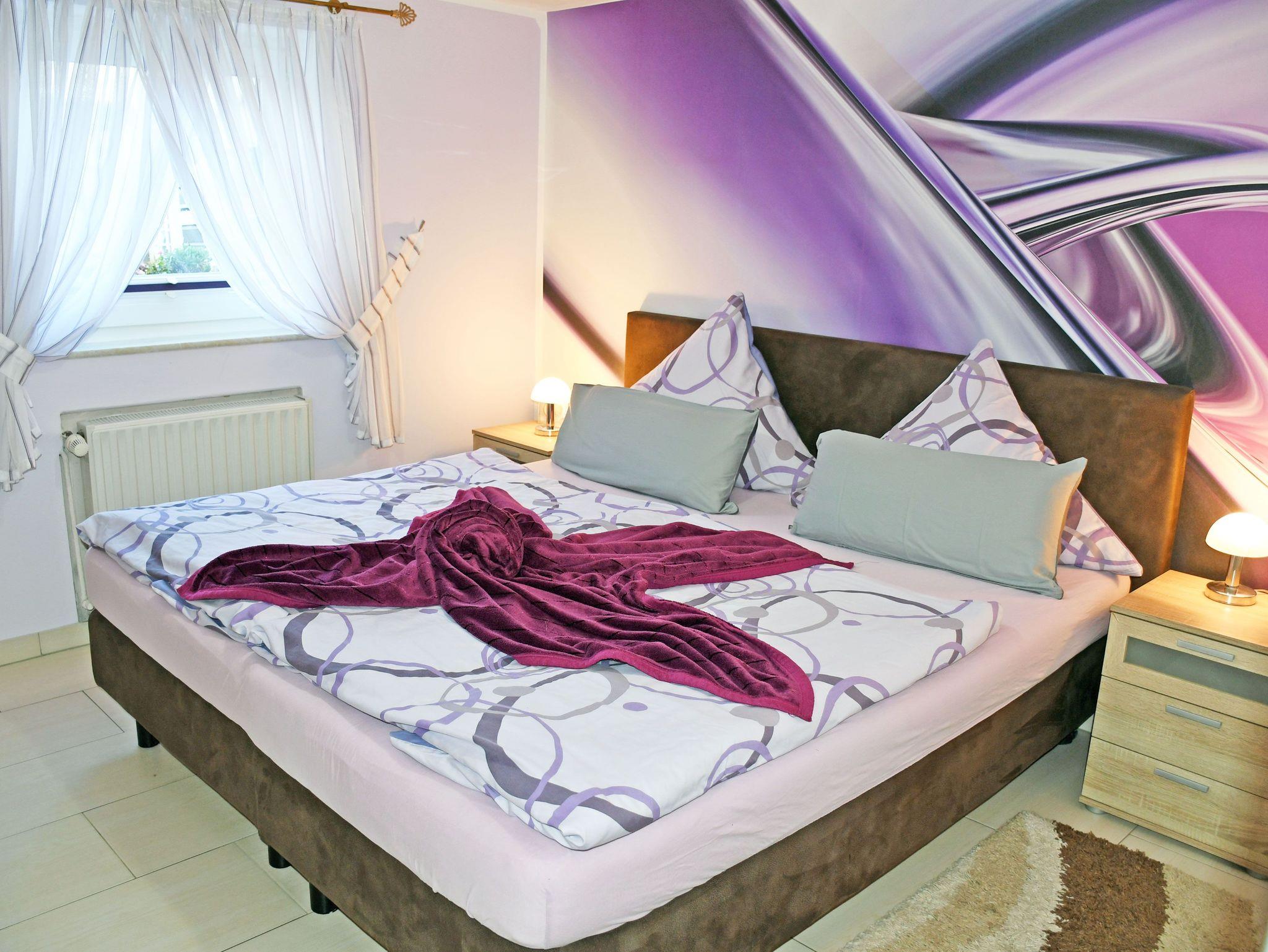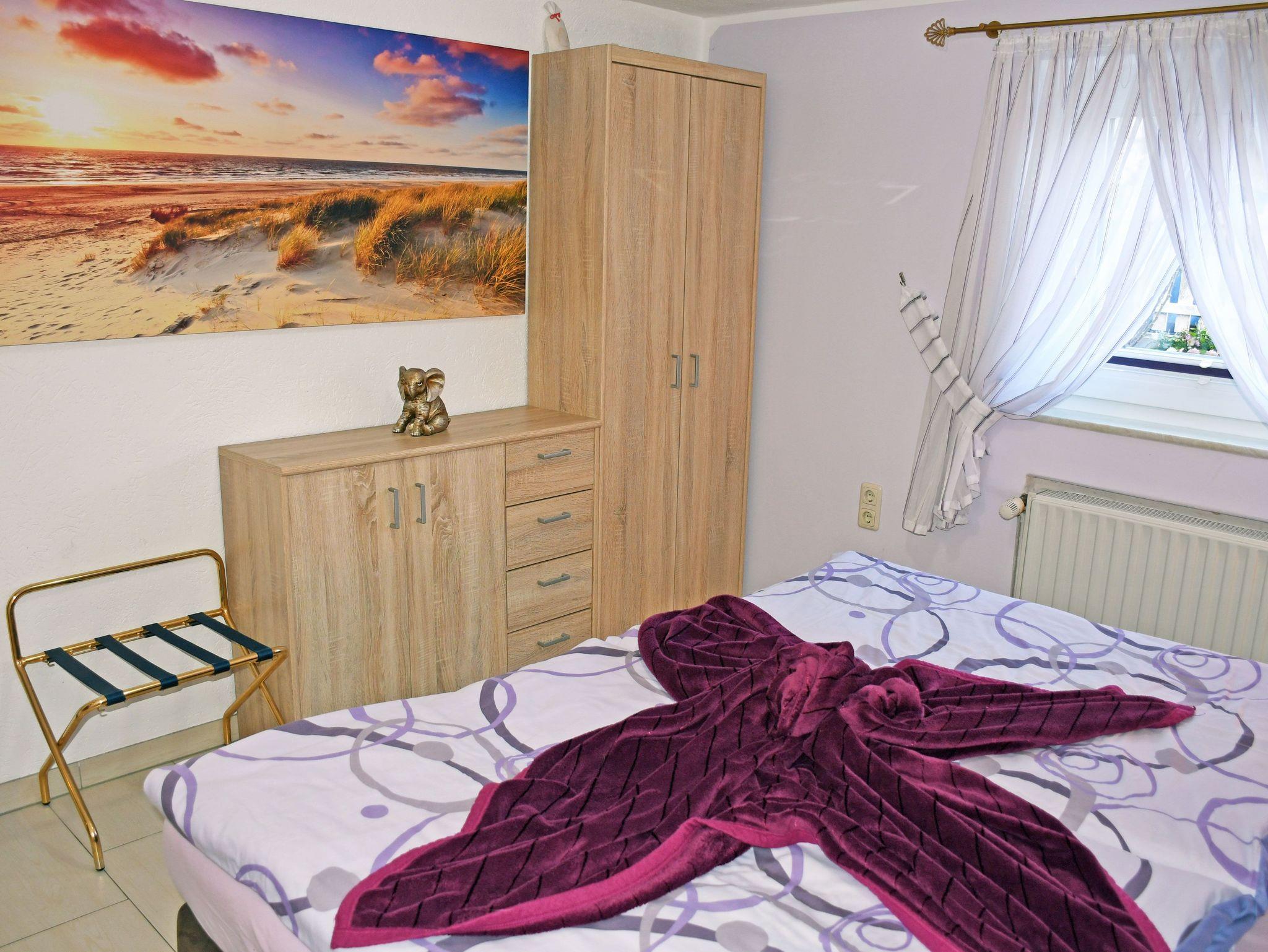 Das Schlafzimmer ist mit einem bequemen Doppelbett (Boxspringbetten) mit Nachttischen und Leselampen sowie einem Kleiderschrank ausgestattet. Für einen 3. und 4. Gast kann bei Bedarf eine Aufbettung auf der Couch im Wohnbereich bereitgestellt werden. Ein kleines Kinderreisebett und ein Hochstuhl können auf Wunsch kostenlos zur Verfügung gestellt werden. Bei Ihrer Anreise liegen frische Handtücher bereit und die Betten sind selbstverständlich bereits mit Bettwäsche bezogen. Das moderne Bad ist mit Dusche, WC und Waschtisch ausgestattet. Zur Ferienwohnung gehören auch eine Sitzgelegenheit im Garten, eine Grillmöglichkeit, Spielmöglichkeiten für Kinder und ein großer, parkähnlicher Gartenbereich.