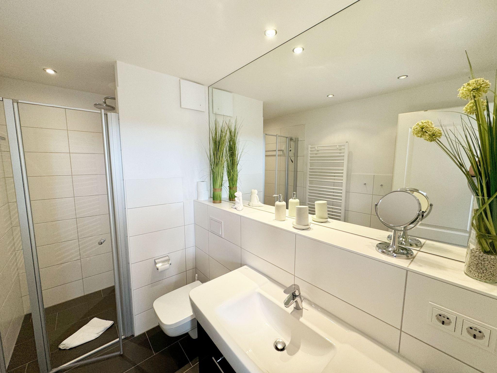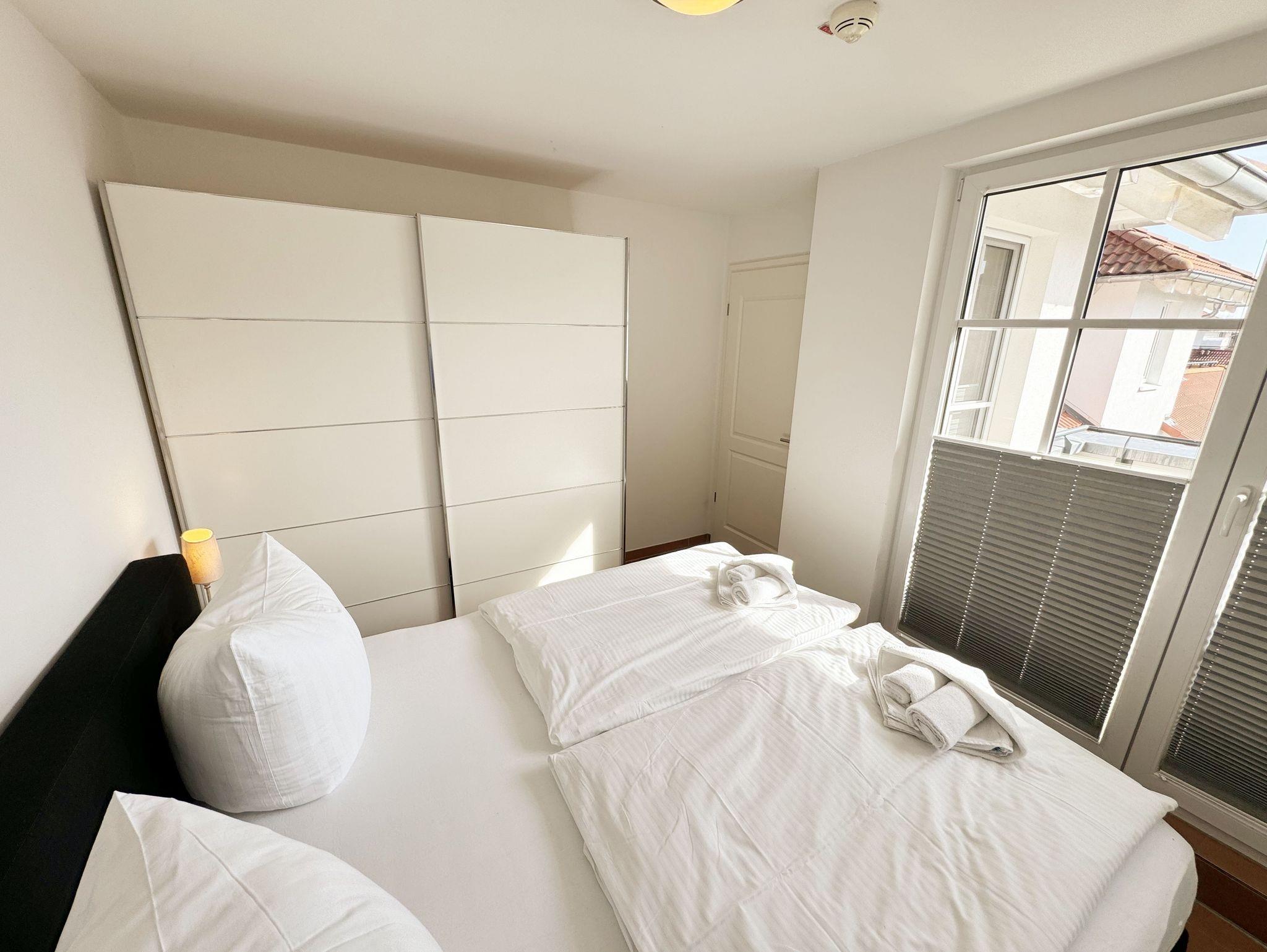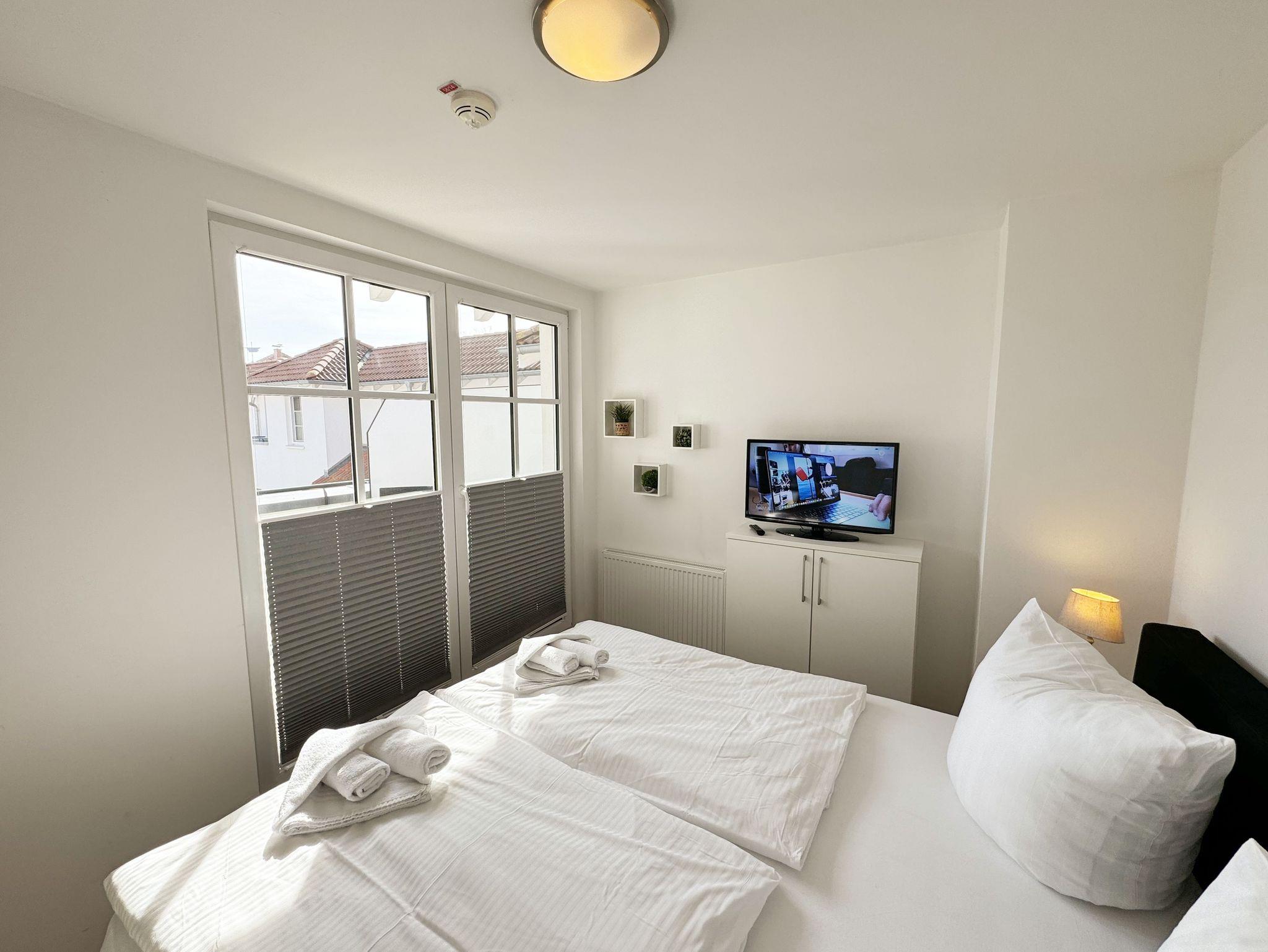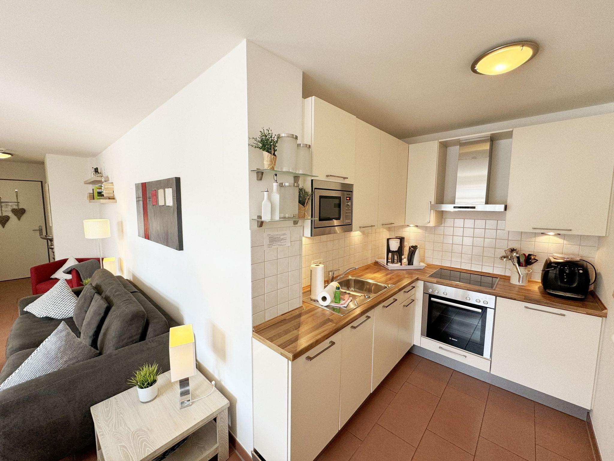 Unser geräumiges ca. 54 qm großes Appartement Nordlicht befindet sich in der 3. Etage und ist für 2 bis 4 Personen geeignet. Von der Tiefgarage aus erreichen Sie ganz bequem mit dem Fahrstuhl Ihre Ferienwohnung. Sie finden hier einen kombinierten Wohn- und Essbereich mit offener Küchenzeile. Diese ist voll ausgestattet mit Ceranfeld, Backofen, Spülmaschine, Kühl/Gefrierkombination, Mikrowelle, einen Kaffeevollautomaten sowie weitere diverse praktische Küchenutensilien. Der Lichtdurchflutete und offene Wohnbereich mit seinen großen Fensterfronten bietet Ihnen eine gemütliche Couch (Liegefläche 1,60 m x 2,00 m) die sich mit wenigen Handgriffen zur Schlafstätte für die 3. und 4. Person umfunktionieren lässt. Dazu gehören 2 passende Sessel, ein Esstisch mit 4 Stühlen, ein großes Sideboard mit Smart-TV, DVD-Player und einer Musikanlage mit iPhone-Dockingstation. Ein Internetanschluss (WLAN/LAN) steht Ihnen inklusive zur Verfügung. Im Schlafzimmer finden Sie ein hochwertiges Boxspringbett (Liegefläche 1,80m x 2,00m) zwei Nachttischkonsolen, einen großen Schwebetürenkleiderschrank, Ganzkörperspiegel sowie einen LCD-Kabel-TV. Vom Wohn- und Schlafbereich haben Sie Zugang zur geräumigen Dachterrasse, die in Richtung Süden liegt und mit komfortablen Gartenmöbeln für 4 Personen ausgestattet ist. Im Badezimmer finden Sie eine ebenerdige Klarglasdusche, einen Waschtisch, Handtuchtrockner, Wand- und Kosmetikspiegel, einen Haartrockner und ein WC. Zusätzlich befinden sich im Abstellraum der Wohnung ein Bügelbrett, ein Bügeleisen und diverse weitere Utensilien. 1x Kinderreisebett (ohne Matratze und Bett Inlett) sowie 1x Hochstuhl stehen Ihnen kostenfrei zur Verfügung. Waschmaschine und Trockner stehen Ihnen im Keller des Hauses gegen eine Gebühr zu Verfügung. Mit dem Fahrstuhl des Hauses A gelangen sie in das Untergeschoss der Meeresblickanlage, wo Sie ein großzügiger und heller Wellnessbereich erwartet. Hier können sie in einem Pool kleine Bahnen schwimmen, in 2 Saunen Ihren Kreislauf in Schwung bringen, in einem dazugehörigen Ruheraum Ihren Körper wieder beruhigen, in einer Schneckendusche sowie weiteren Duschen das kühle Nass genießen und auf einer Außenterrasse mit Außendusche die frische Luft einatmen. Ein eigener Strandkorb ist für Sie saisonbedingt und wetterabhängig von Mai bis September am Meer reserviert. Ein PKW-Stellplatz (Nr.53, Einfahrtshöhe 2,00m) ist für Sie in der Tiefgarage reserviert. Haustiere sind in dieser Wohnung nicht erlaubt. Die Erstausstattung eines Wäschepaketes (komplette Bettwäsche, 1 Duschhandtuch, 2 kleine Handtücher) können Sie bis 14 Tage vor Anreise gegen einen Aufpreis dazu buchen oder durch eigene ergänzen. Ab 2 gebuchten Paketen erhalten Sie einmalig 1 Geschirrhandtuch und 1 Duschvorleger hinzu.
