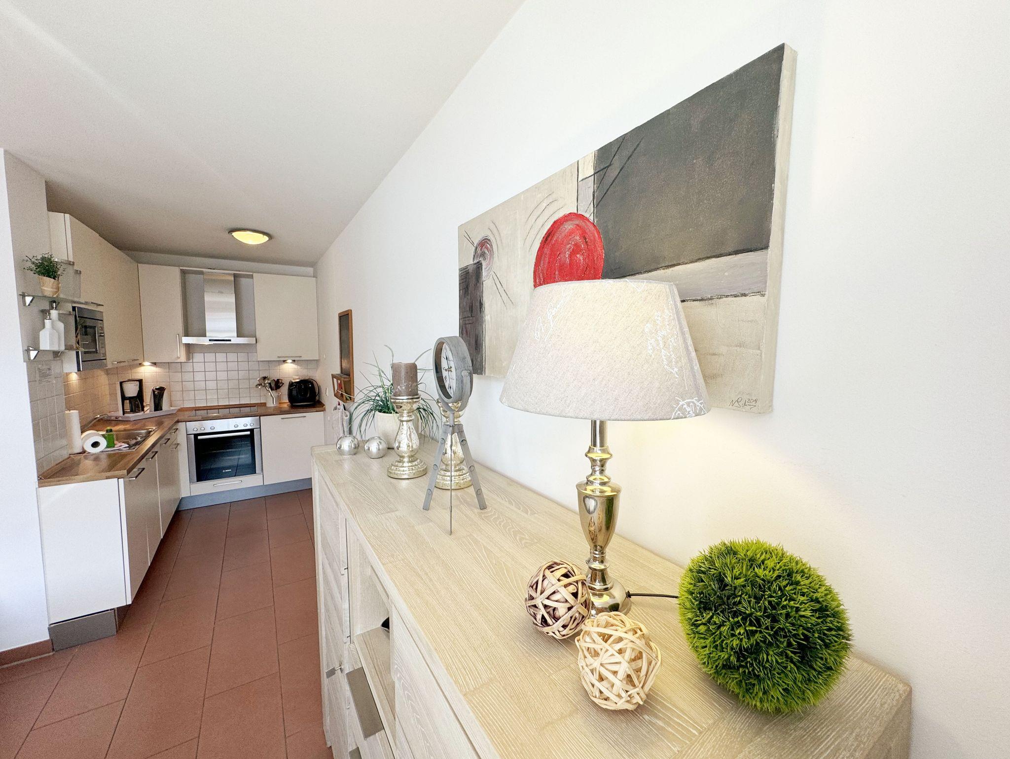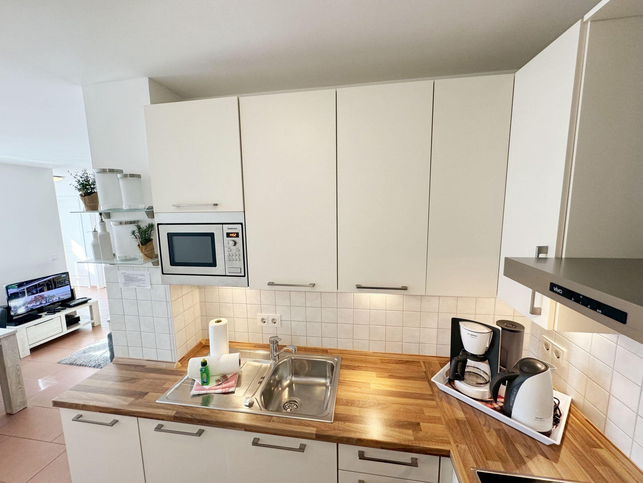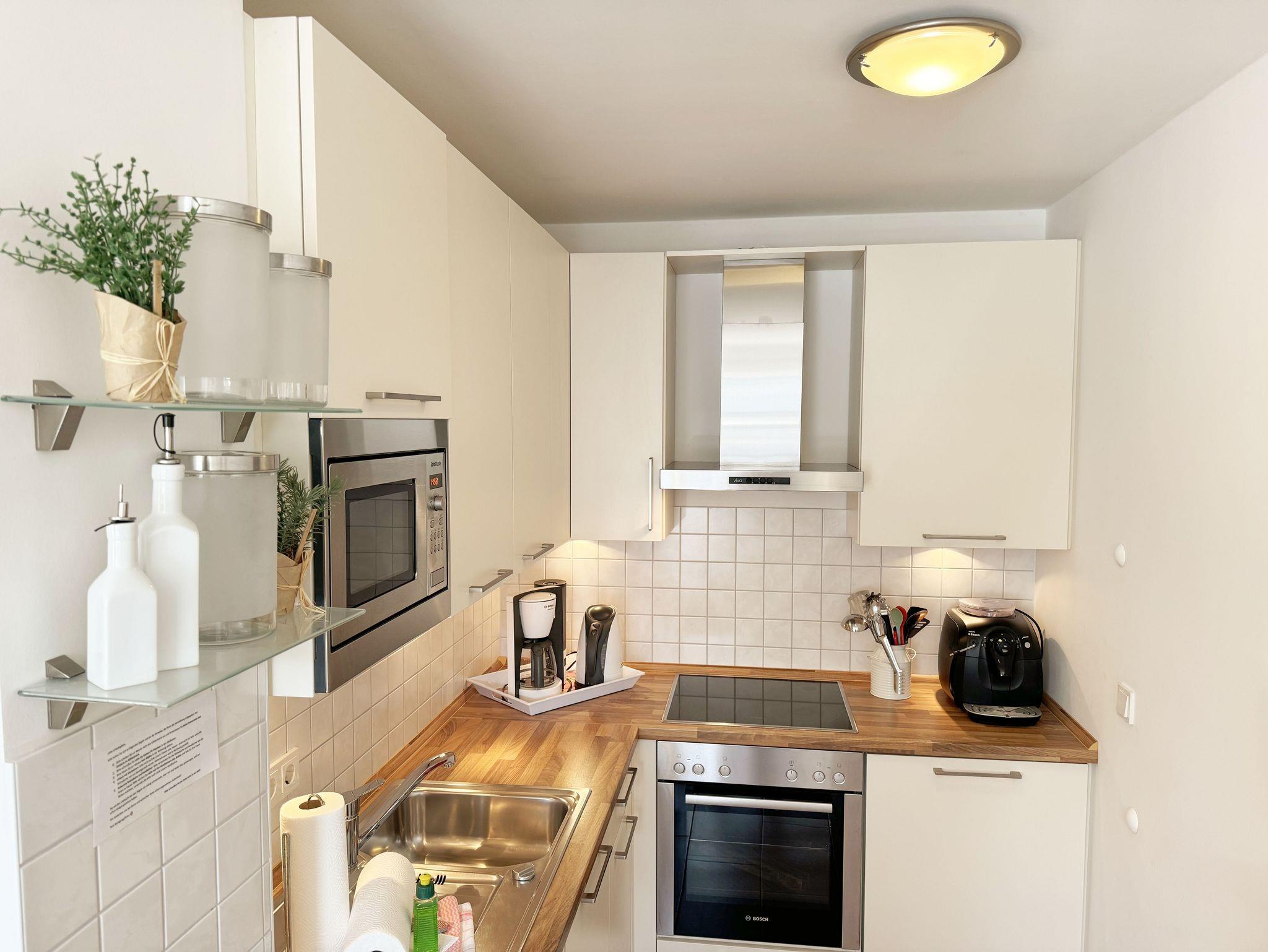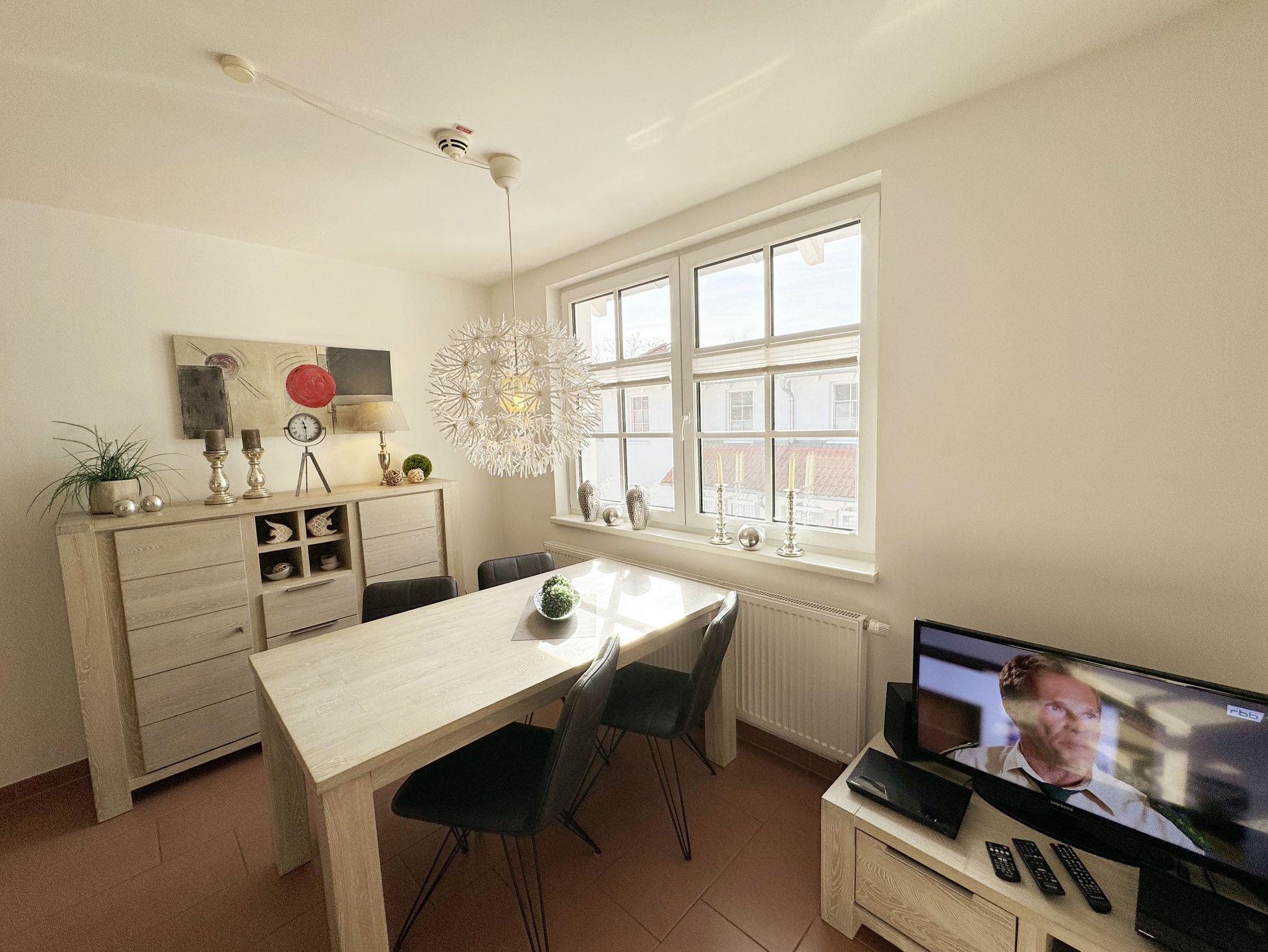 Unser geräumiges ca. 54 qm großes Appartement Nordlicht befindet sich in der 3. Etage und ist für 2 bis 4 Personen geeignet. Von der Tiefgarage aus erreichen Sie ganz bequem mit dem Fahrstuhl Ihre Ferienwohnung. Sie finden hier einen kombinierten Wohn- und Essbereich mit offener Küchenzeile. Diese ist voll ausgestattet mit Ceranfeld, Backofen, Spülmaschine, Kühl/Gefrierkombination, Mikrowelle, einen Kaffeevollautomaten sowie weitere diverse praktische Küchenutensilien. Der Lichtdurchflutete und offene Wohnbereich mit seinen großen Fensterfronten bietet Ihnen eine gemütliche Couch (Liegefläche 1,60 m x 2,00 m) die sich mit wenigen Handgriffen zur Schlafstätte für die 3. und 4. Person umfunktionieren lässt. Dazu gehören 2 passende Sessel, ein Esstisch mit 4 Stühlen, ein großes Sideboard mit Smart-TV, DVD-Player und einer Musikanlage mit iPhone-Dockingstation. Ein Internetanschluss (WLAN/LAN) steht Ihnen inklusive zur Verfügung. Im Schlafzimmer finden Sie ein hochwertiges Boxspringbett (Liegefläche 1,80m x 2,00m) zwei Nachttischkonsolen, einen großen Schwebetürenkleiderschrank, Ganzkörperspiegel sowie einen LCD-Kabel-TV. Vom Wohn- und Schlafbereich haben Sie Zugang zur geräumigen Dachterrasse, die in Richtung Süden liegt und mit komfortablen Gartenmöbeln für 4 Personen ausgestattet ist. Im Badezimmer finden Sie eine ebenerdige Klarglasdusche, einen Waschtisch, Handtuchtrockner, Wand- und Kosmetikspiegel, einen Haartrockner und ein WC. Zusätzlich befinden sich im Abstellraum der Wohnung ein Bügelbrett, ein Bügeleisen und diverse weitere Utensilien. 1x Kinderreisebett (ohne Matratze und Bett Inlett) sowie 1x Hochstuhl stehen Ihnen kostenfrei zur Verfügung. Waschmaschine und Trockner stehen Ihnen im Keller des Hauses gegen eine Gebühr zu Verfügung. Mit dem Fahrstuhl des Hauses A gelangen sie in das Untergeschoss der Meeresblickanlage, wo Sie ein großzügiger und heller Wellnessbereich erwartet. Hier können sie in einem Pool kleine Bahnen schwimmen, in 2 Saunen Ihren Kreislauf in Schwung bringen, in einem dazugehörigen Ruheraum Ihren Körper wieder beruhigen, in einer Schneckendusche sowie weiteren Duschen das kühle Nass genießen und auf einer Außenterrasse mit Außendusche die frische Luft einatmen. Ein eigener Strandkorb ist für Sie saisonbedingt und wetterabhängig von Mai bis September am Meer reserviert. Ein PKW-Stellplatz (Nr.53, Einfahrtshöhe 2,00m) ist für Sie in der Tiefgarage reserviert. Haustiere sind in dieser Wohnung nicht erlaubt. Die Erstausstattung eines Wäschepaketes (komplette Bettwäsche, 1 Duschhandtuch, 2 kleine Handtücher) können Sie bis 14 Tage vor Anreise gegen einen Aufpreis dazu buchen oder durch eigene ergänzen. Ab 2 gebuchten Paketen erhalten Sie einmalig 1 Geschirrhandtuch und 1 Duschvorleger hinzu.