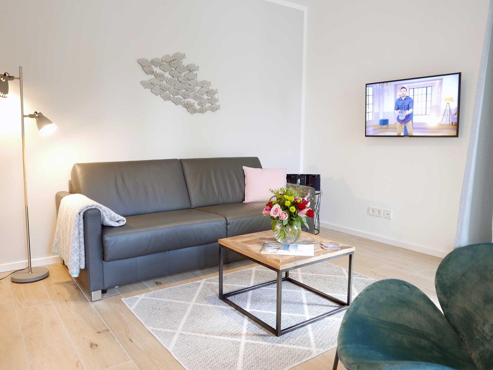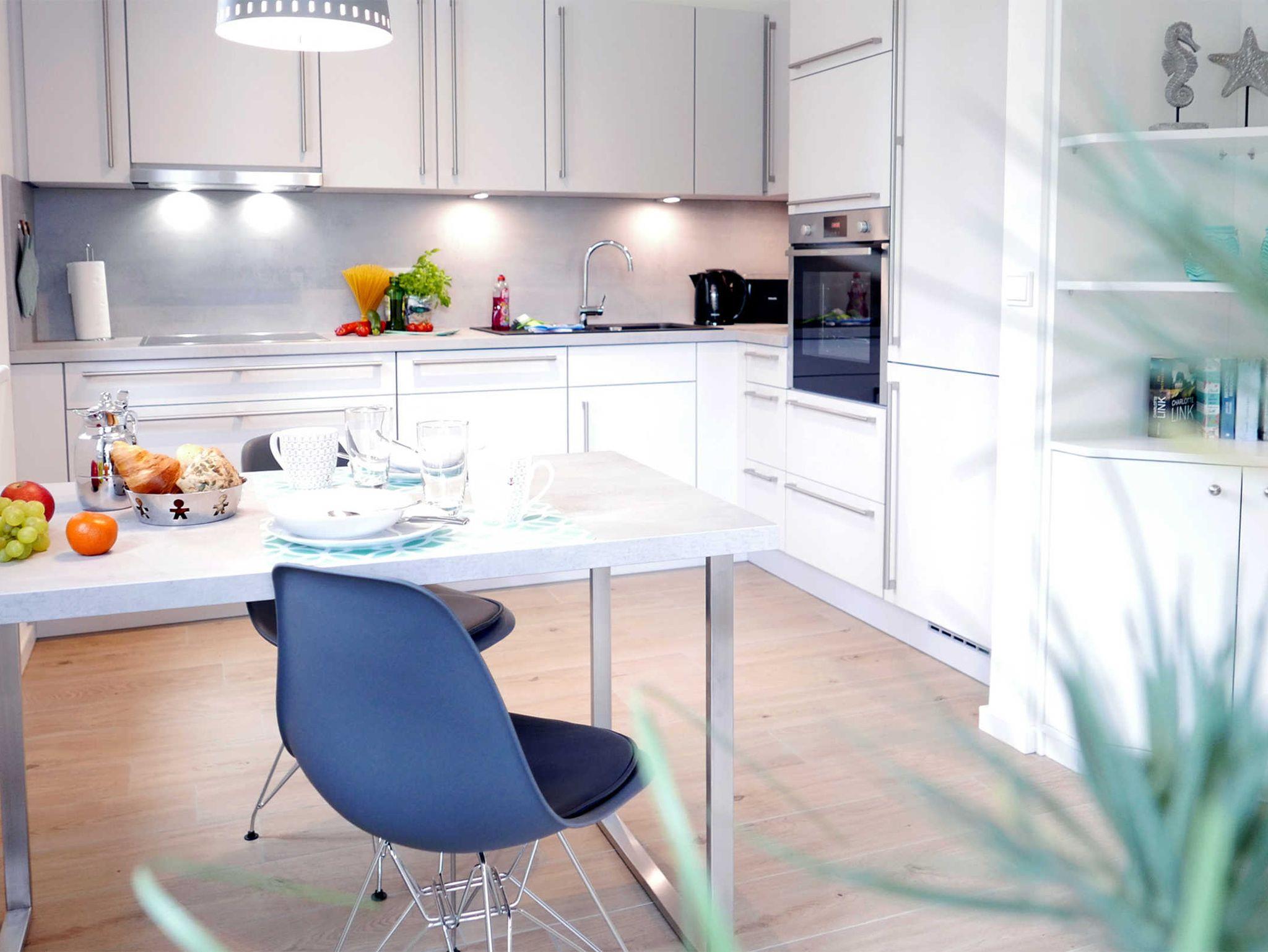Moderne allergikerfreundliche 2 Zimmerwohnung mit extra Gäste-WC für 2 Personen. In den Wohnraum integriert befindet sich eine offene Küche mit Markengeräten, ein Esstisch mit 2 Stühlen sowie ein bequemes Ledersofa mit Couchtisch, ein 40 Zoll Smart TV und eine Stereoanlage (Radio/CD/Bluetooth/USB). Vom Wohnbereich gelangen Sie auf den überdachten Südwest-Balkon mit einem Tisch und 2 Stühlen.