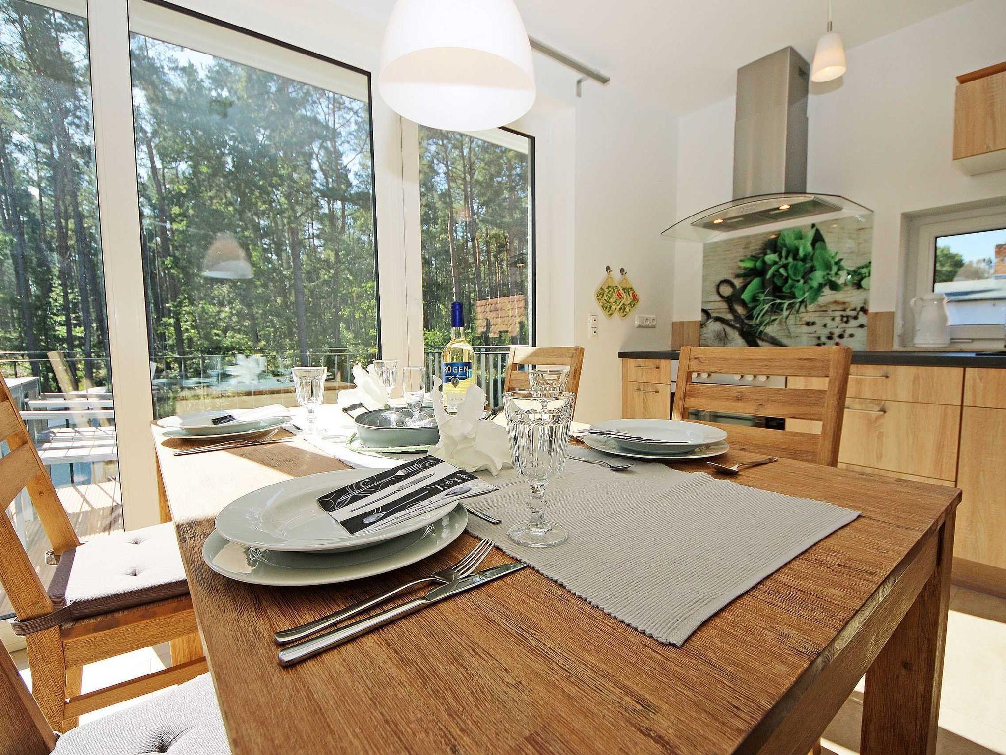 Die gebaute, modern eingerichtete Ferienwohnung hat eine Größe von ca. 65 qm und ist mit ausgewählten Stilelementen versehen. Sie bietet Platz für 2 bis 4 Erwachsene und 1 Kleinkind bis 3 Jahre im Kinderreisebett. Die Allergikerfreundliche Nichtraucherwohnung befindet sich im Obergeschoss. Zu der Wohnung gehört ein bestuhlter und mit Sonnenschirm versehener Balkon mit Blick in den Küstenwald. Ein Grillplatz befindet sich im Gartenbereich. Der Wohnbereich ist mit einer gemütlichen Eckcouch (Leder), Couchtisch; Leselampe sowie Sideboard ausgestattet. Zu den Unterhaltungsmöglichkeiten in den Abendstunden oder bei schlechtem Wetter gehören ein Smart-TV, Blu-Ray-Player sowie eine Hi-Fi Kompaktanlage mit CD- und USB-Anschluss. Auch auf einen Internetanschluss (WLAN) brauchen Sie nicht verzichten. Dieser ist inklusive. Ein Kaminofen für wohlige Wärme rundet die Gemütlichkeit ab. Kaminholz ist nicht inklusive. Die komplett ausgestattete Küchenzeile mit Ceranfeld, Backofen, Geschirrspüler, Kühlschrank mit Eisfach, Mikrowelle, Kaffeemaschine, Wasserkocher, Toaster, div. Küchenutensilien wird durch den Essplatz am Panoramafenster komplettiert. Eines der 2 Schlafräume ist mit einem Doppelbett (1,80m x 2,00m), Nachttischablagen und einem geräumigen Kleiderschrank ausgestattet. Das zweite Schlafzimmer hat zwei Einzelbetten (0,90m x 2,00m), Nachttischablagen und einen Kleiderschrank sowie einen LCD-TV. Die Schlafräume sind mit einem modernen Vinylbelag versehen und können für einen angenehmen Schlaf abgedunkelt werden, zudem sind sie mit Insektenschutzgitter versehen. In allen anderen Räumlichkeiten sind Fliesen verlegt worden. Für eine angenehme Wärme sorgt die im ganzen Haus verlegte Fußbodenheizung. Das Tageslichtbad wird durch eine flache Duschwanne, einen Waschtisch, ein WC, Fön und einem beheizten Handtuchhalter abgerundet. Das Gäste-WC wurde zusätzlich mit einem beheizten Handtuchtrockner ausgestattet. Für unsere kleinen Gäste ist 1x Hochstuhl inklusive. Haustiere sind nicht erlaubt. Ein PKW-Stellplatz befindet sich auf dem Grundstück. Mitgebrachte oder geliehene Fahrräder können Sie im hauseigenen Abstellraum unterbringen. Die Erstausstattung eines Wäschepaketes (komplette Bettwäsche, 1 Duschhandtuch, 1 kleines Handtuch) können Sie bis 14 Tage vor Anreise gegen einen Aufpreis dazu buchen oder durch eigene ergänzen. Ab 2 gebuchten Paketen erhalten Sie einmalig 1 Geschirrhandtuch und 1 Duschvorleger hinzu.