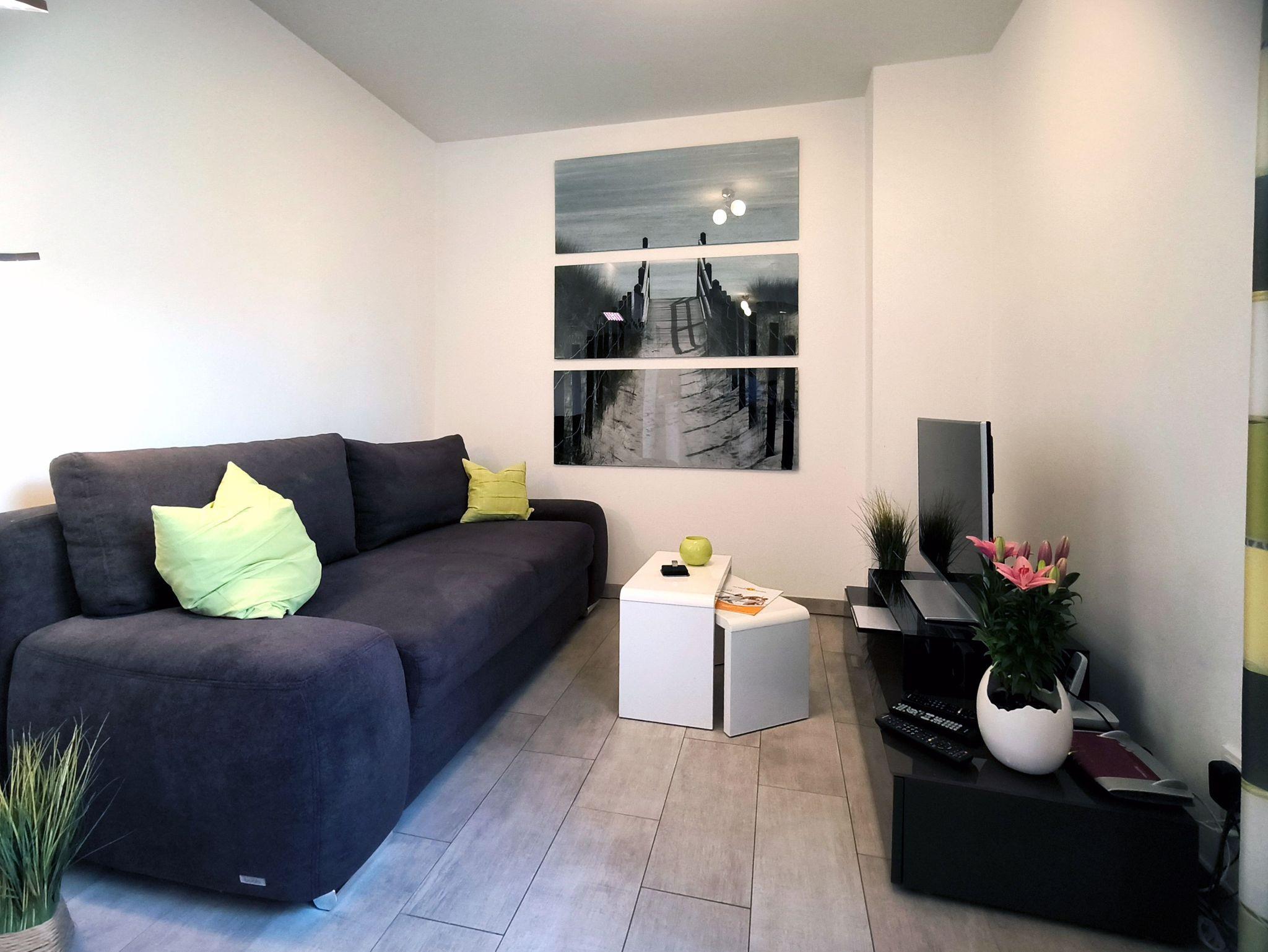 Vom Balkon aus ein Blick ins Grüne, der Strand in zwei Minuten erreichbar - die Ferienwohnung Am Strand ist eine schmucke Unterkunft im 1. Obergeschoss der Residenz Haus Meeresblick. Im Schlafzimmer mit einem extra Fernseher finden zwei Personen im Doppelbett Platz. Zwei weitere Gäste können das Schlafsofa im Wohn-/Essbereich nutzen. Die dort integrierte Küchenzeile ist modern ausgestattet mit einem Zwei-Plattenherd (Ceranfeld), einem Kühlschrank, einem Backofen, einer Mikrowelle, einer Geschirrspülmaschine, einem Toaster und Wasserkocher sowie einer Kaffeemaschine.