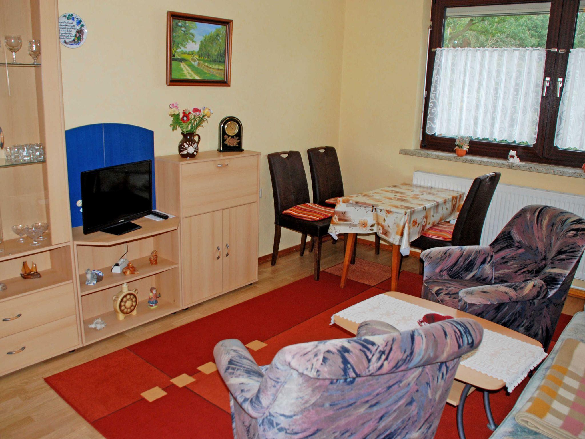 Diese Ferienwohnung ist ca. 40 qm groß, hat Platz für maximal 3 Erwachsene und wurde liebevoll eingerichtet. Über einen separaten Eingang gelangt man in die Wohnung mit einem kleinen Vorflur mit Garderobe. Im Wohnzimmer befinden sich eine bequeme Sitzcouch mit Tisch und Sesseln, ein Esstisch mit Stühlen, ein modernes Flachbild-TV-Gerät.