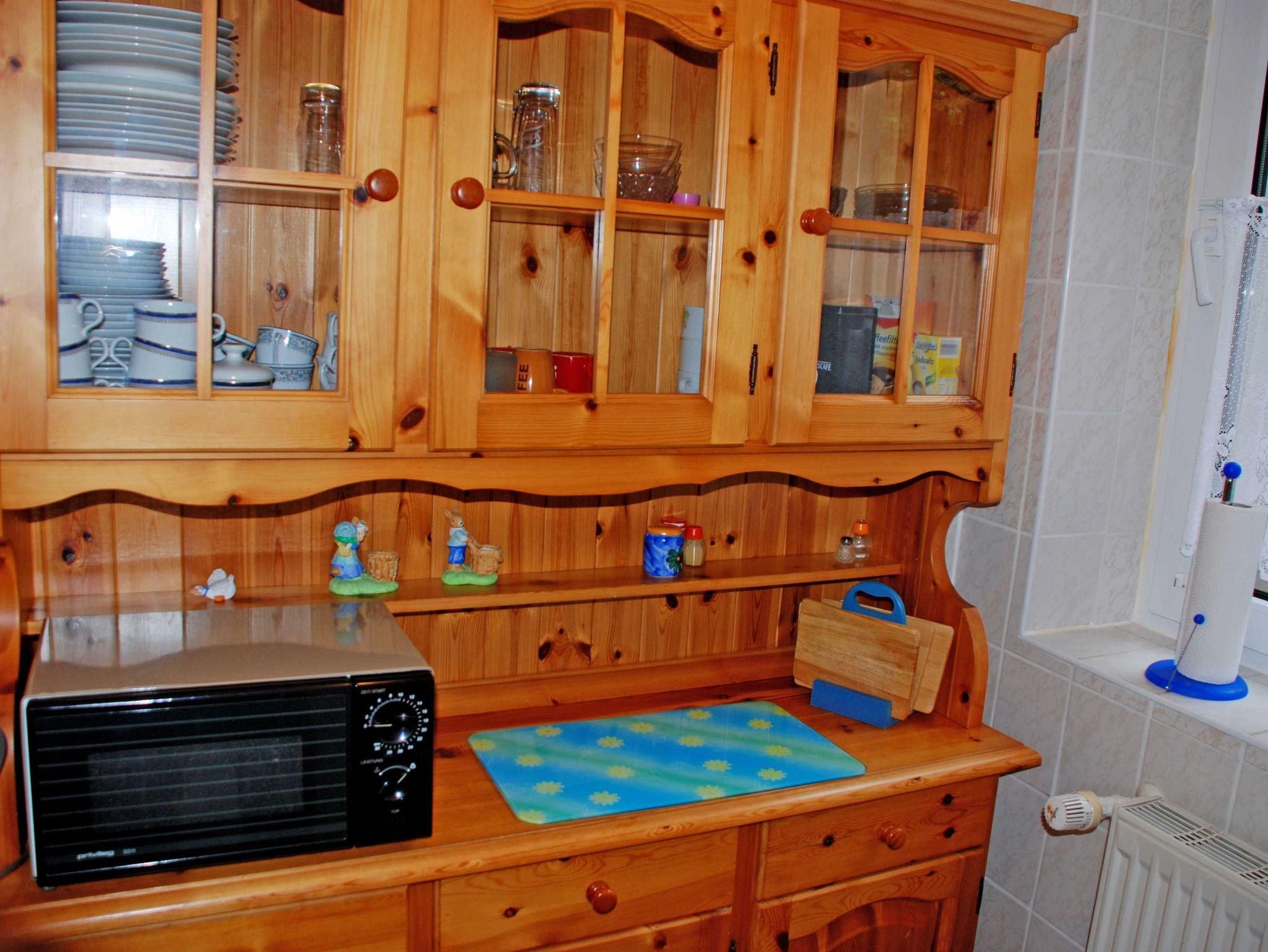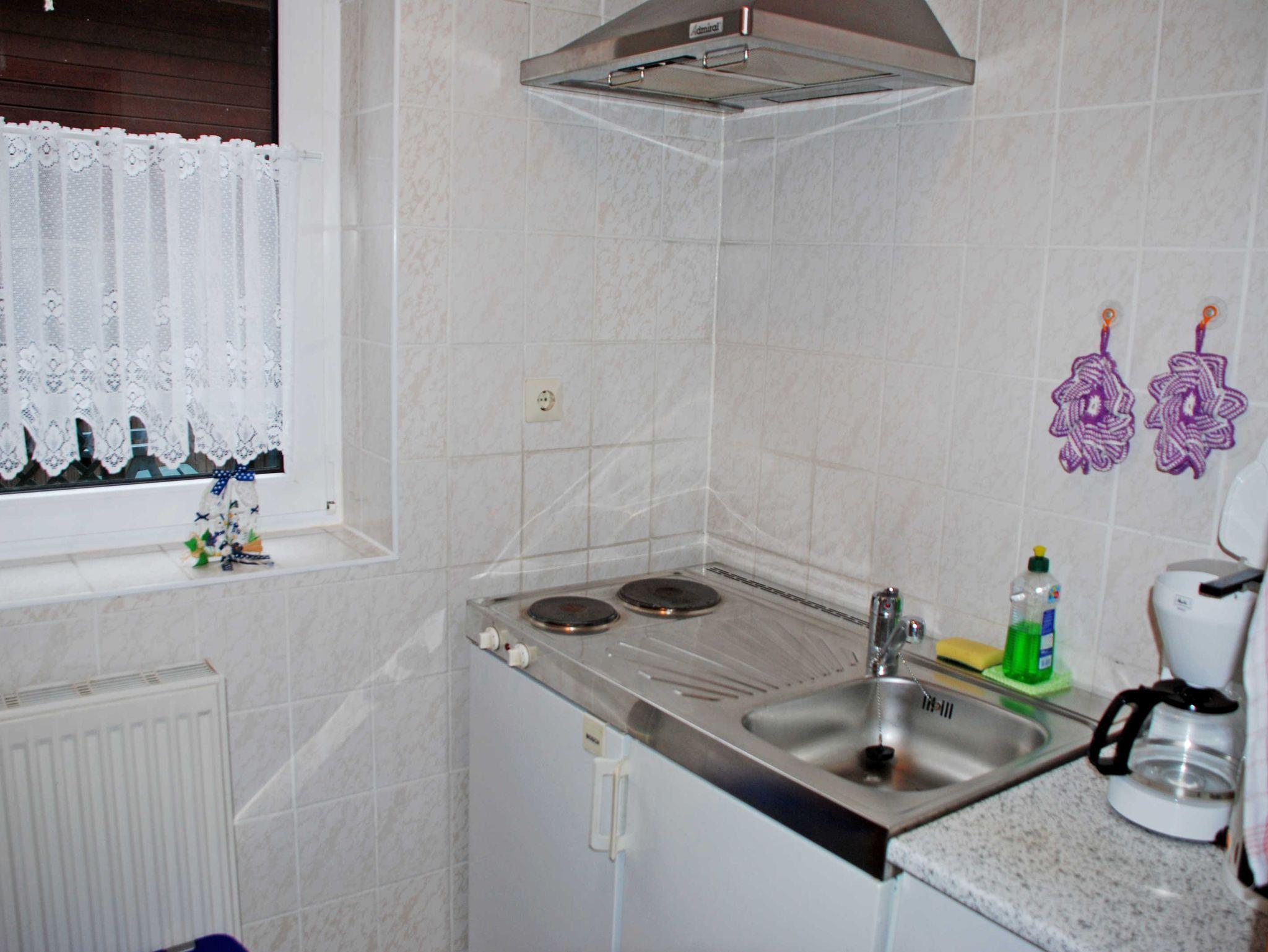 Die kleine separate Küche ist mit einem Herd, Abzugshaube, Mikrowelle, Wasserkocher, Kaffeemaschine, Toaster und Kühlschrank komplett ausgestattet.