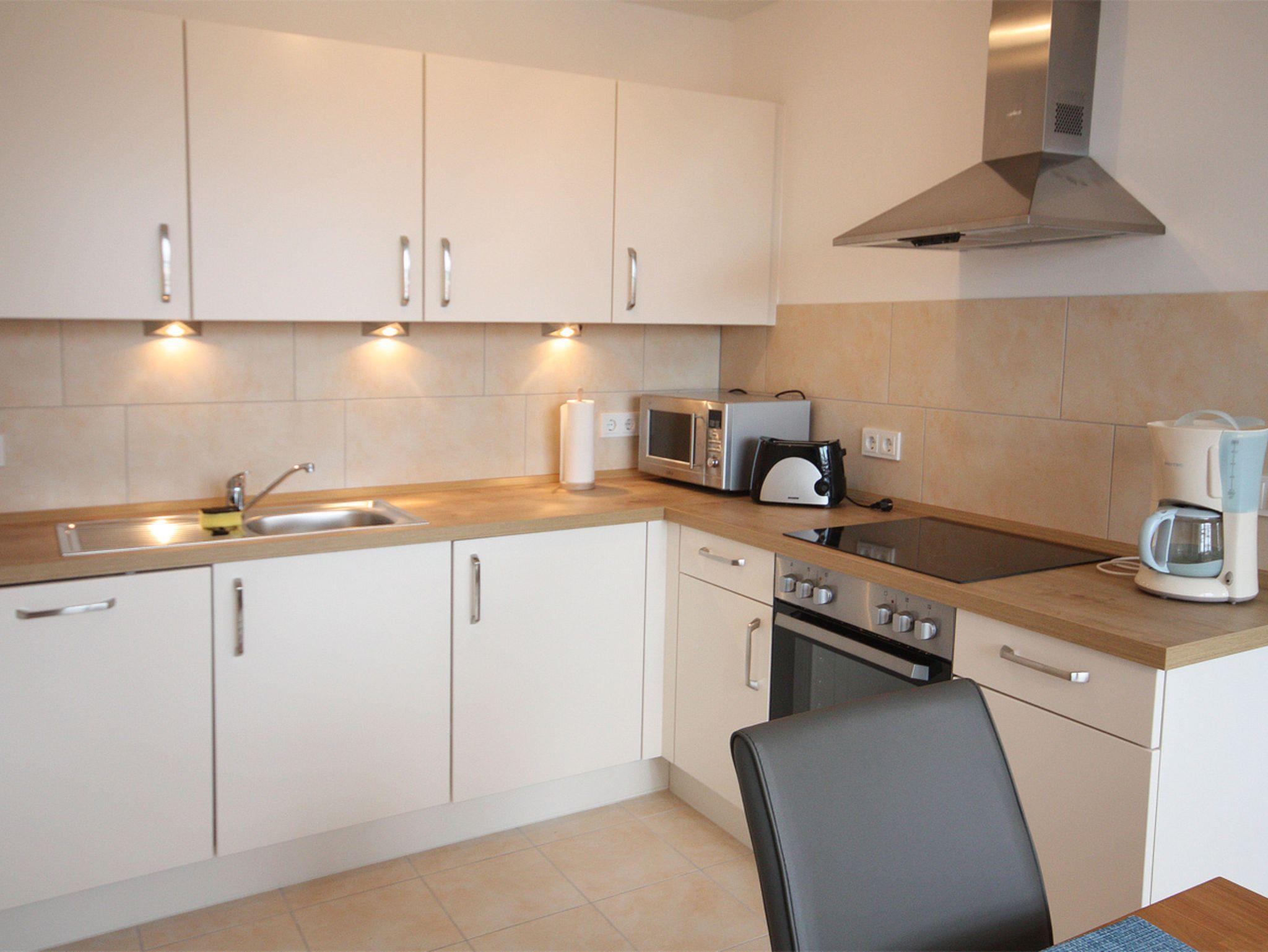 Die Küchenzeile ist für vier Personen eingerichtet und hat einen Vierplattenherd mit Backofen, einen Kühlschrank mit Gefrierfach, eine Mikrowelle, eine Spülmaschine sowie einen Toaster und eine Kaffeemaschine. Auf dem Balkon (mit eingeschränktem Meerblick) sind vier Sitzplätze vorhanden.