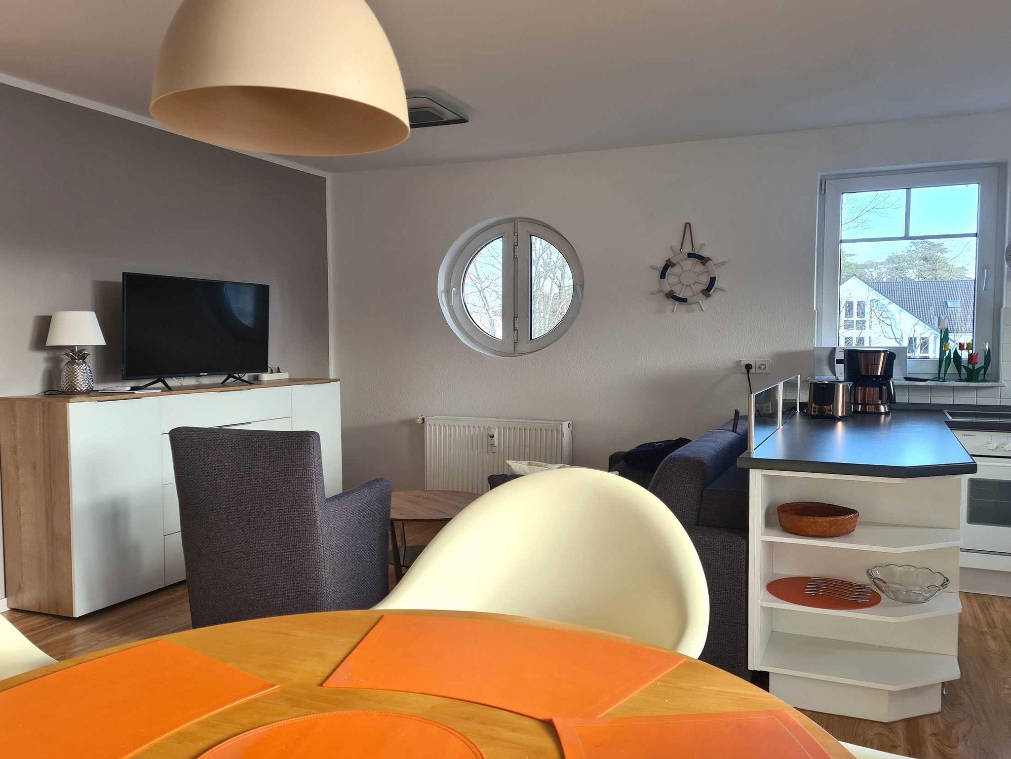 Der Wohnbereich ist mit einer gemütlichen Schlafcouch und einem Flachbild TV ausgestattet. Die offene Wohnküche mit Essbereich ist mit einem 4 Felder Ceranherd, Spülmaschine, Mikrowelle, Kühlschrank mit Gefrierfach, Kaffeemaschone, Toaster und reichlich Küchenutensilien ausgestattet .