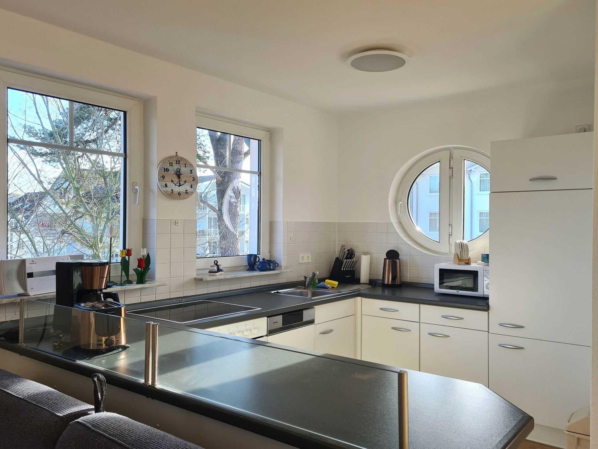 • KÜCHE: offene Küche mit Essbereich, 4-Felder Ceranherd, Spülmaschine, Kühlschrank mit Gefrierfach, Mikrowelle, Toaster, Wasserkocher, Kaffeemaschine, reichlich Besteck, Geschirr und Küchenutensilien