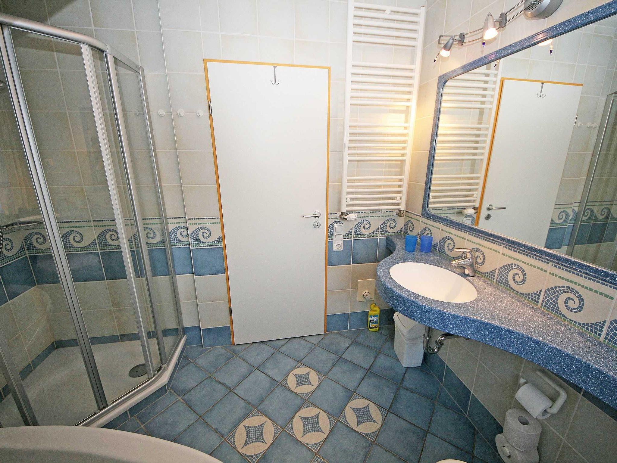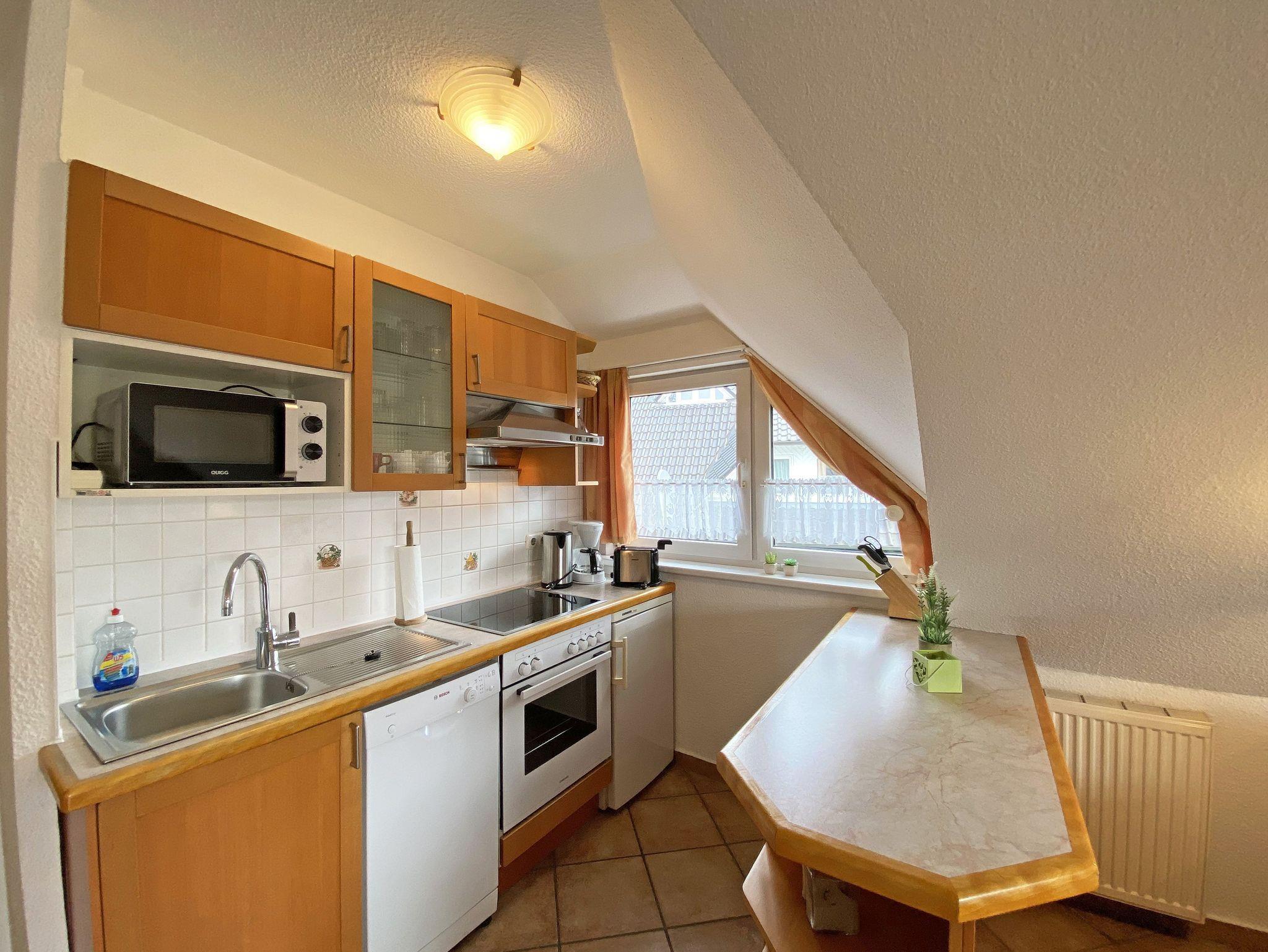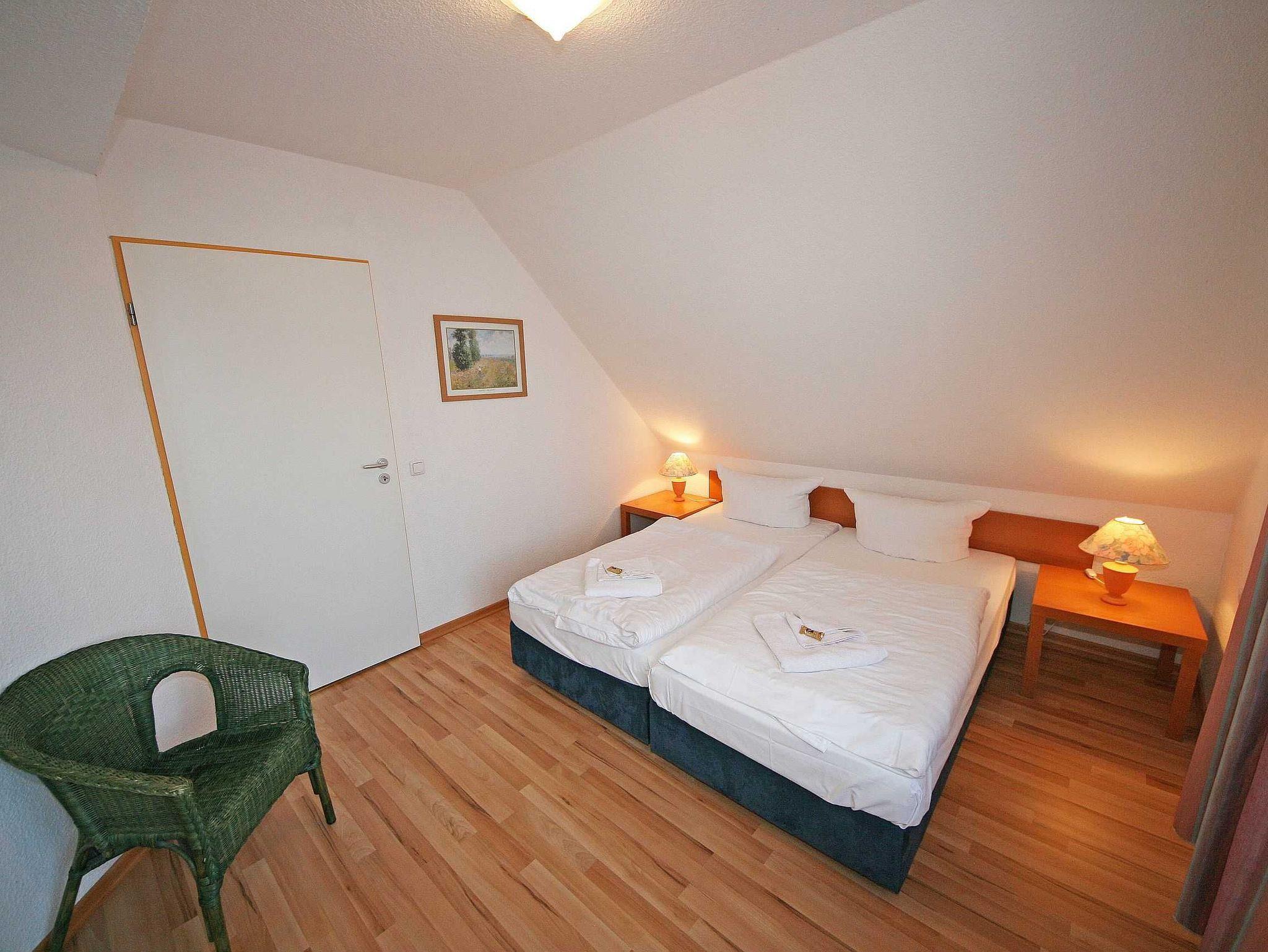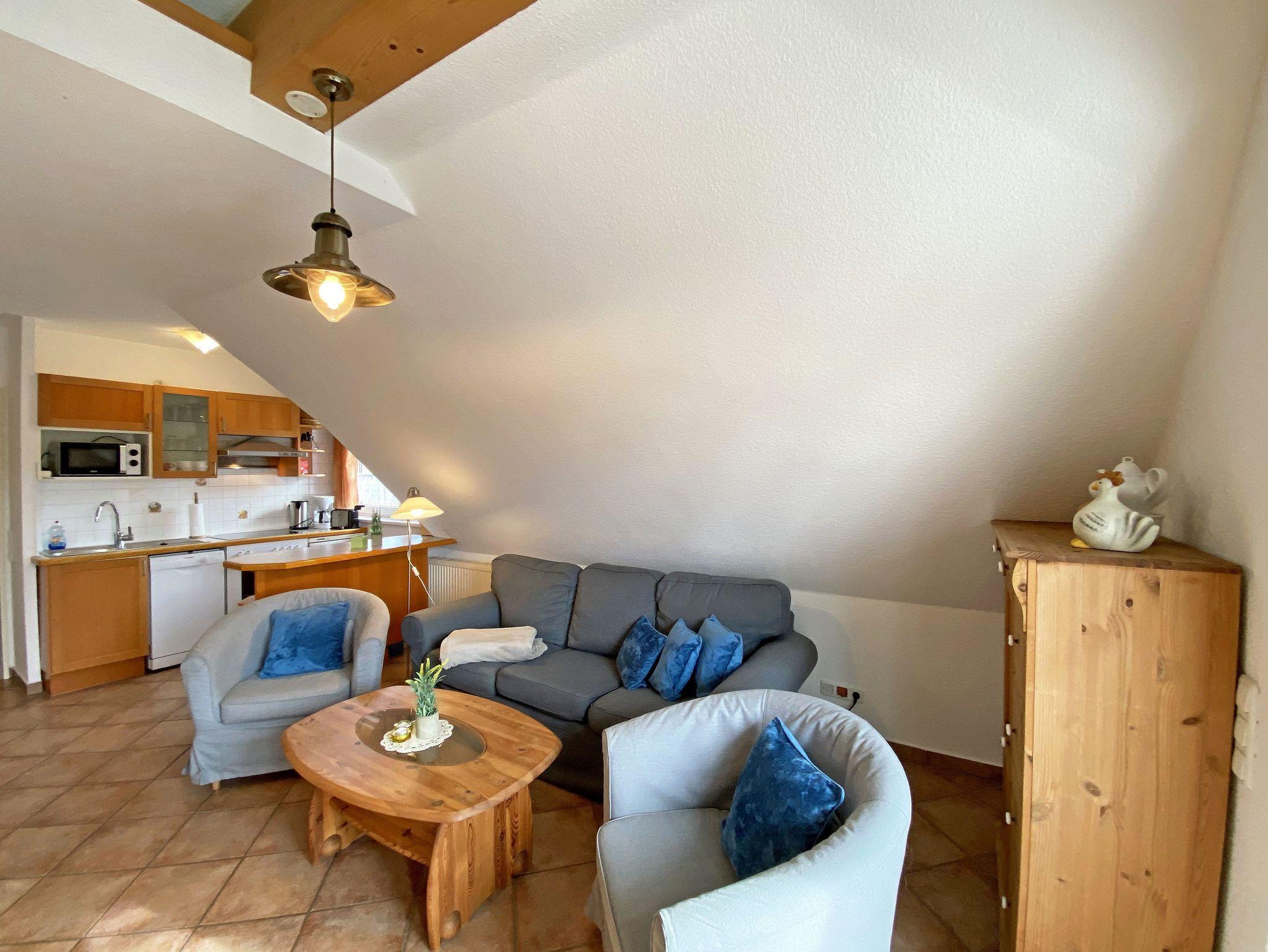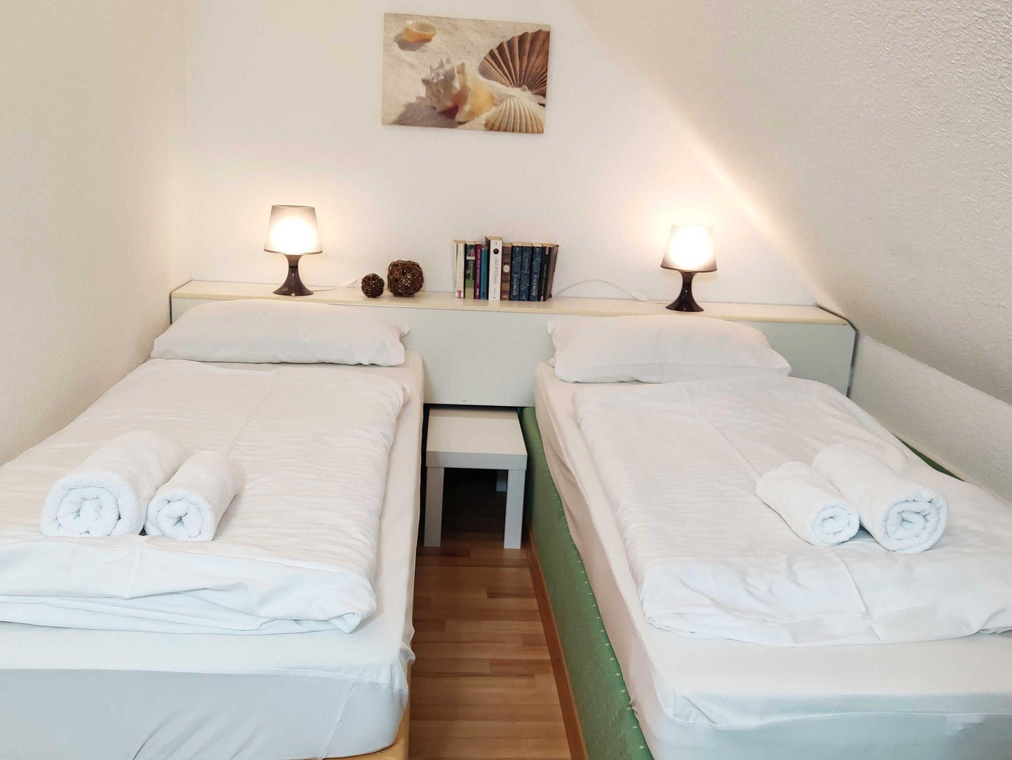 Die gemütliche und komfortable 3-Raum-Nichtraucherwohnung ist eine Maisonette mit ca. 65qm Wohnfläche und befindet sich in der 1. Etage. Sie bietet ausreichend Platz für 5 Erw. + 1 Kleinkind bis 3 Jahre im Kinderreisebett. Die im Rügener Stil behaglich eingerichtete Ferienwohnung bietet einen großzügigen Wohn- Essbereich die über eine komplett eingerichtete Küchenzeile mit Geschirrspüler, Backofen, 4 Herdplatten, Kaffeemaschine, Toaster, Wasserkocher sowie diverse Küchenutensilien verfügt. Angrenzend zum Wohnbereich haben Sie einen Esstisch mit Bestuhlung sowie eine Couch mit Couchtisch, einem Sideboard mit LCD Sat-TV in HD-Qualität für eine hohe Programmvielfalt, CD & DVD-Player mit Radio USB-Anschluss und SD-Kartenleser. Für gemütliche Abende sorgt der Kamin. Vom Wohnbereich gelangen Sie auf den überdachten im Bäderstil gehaltenen und bestuhlten Balkon (Richtung Süden). Das 1. Schlafzimmer befindet sich auf einer Ebene wie der Wohnbereich und verfügt über 1 Doppelbett (2x90x200 cm) mit Nachtischkonsolen und einen viertürigen Kleiderschrank. Durch die Großzügigkeit des Raumes, könnte man auch ein Kinderreisebett mit aufstellen. Das 2. Schlafzimmer im Dachgeschoss erreichen Sie durch eine Treppe im Wohnbereich, wo Sie 2 Einzelbetten (je 0,80m x 2,00m) welche Sie zusammenzustellen können, 1 Einzelbett (0,80m x 2,00m), ein Wandschrank sowie ein Schreibtisch. Beide Schlafzimmer sind abdunkelbar. Das geflieste Tageslicht-Bad bietet Ihnen eine Dusche, WC, Fön, einen Waschtisch sowie eine Badewanne. Auch im Urlaub brauchen Sie in der Wohnung nicht auf einen Internetanschluss (WLAN) verzichten. Dieser ist für Sie inklusive!!! In einem Gemeinschaftsraum können Sie eine Waschmaschine gegen eine Extragebühr nutzen (in den Monaten: November bis Ende März nicht im Betrieb). Ein Parkplatz Nr. 04 befindet sich vor dem Haus Rügenwelle und ist für Sie inklusive. Ihre mitgebrachten oder geliehenen Fahrräder können Sie auf dem Grundstück anschließen. Auf Wunsch kann auch 1x Kinderreisebett (mit Matratze, ohne Bett Inlett) / 1x Hochstuhl gestellt werden. 2 kleine Haustiere können gegen eine Gebühr dazu gebucht werden. Die Erstausstattung eines Wäschepaketes (komplette Bettwäsche, 1 Duschhandtuch, 2 kleine Handtücher) können Sie bis 14 Tage vor Anreise gegen einen Aufpreis dazu buchen oder durch eigene ergänzen. Ab 2 gebuchten Paketen erhalten Sie einmalig 1 Geschirrhandtuch und 1 Duschvorleger hinzu.