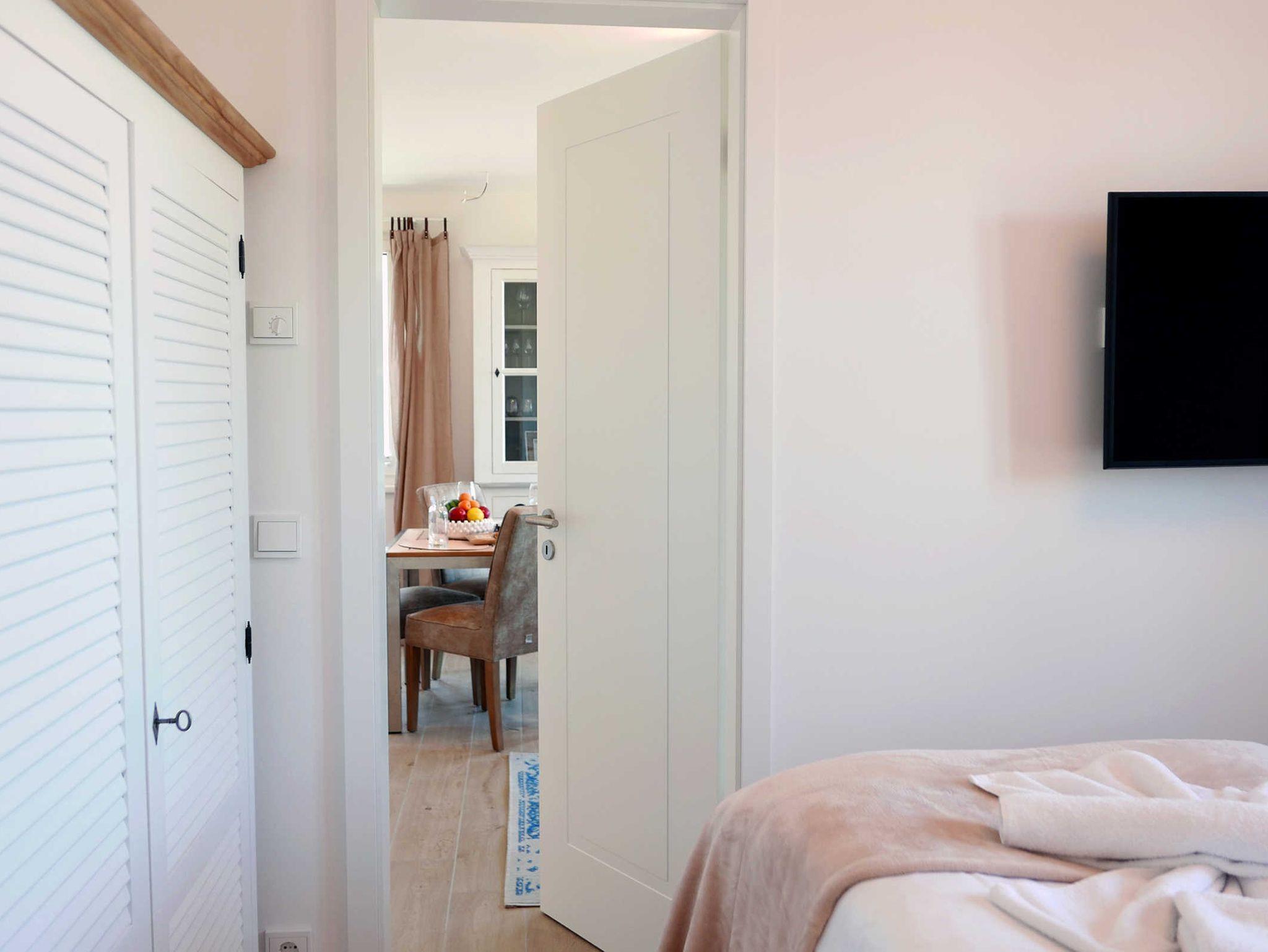 In dem Schlafzimmer befindet sich ein 180 x 200 cm großes Boxspringbett, ein Flachbildfernseher und ausreichend Stauraum in Form von Schränken.
