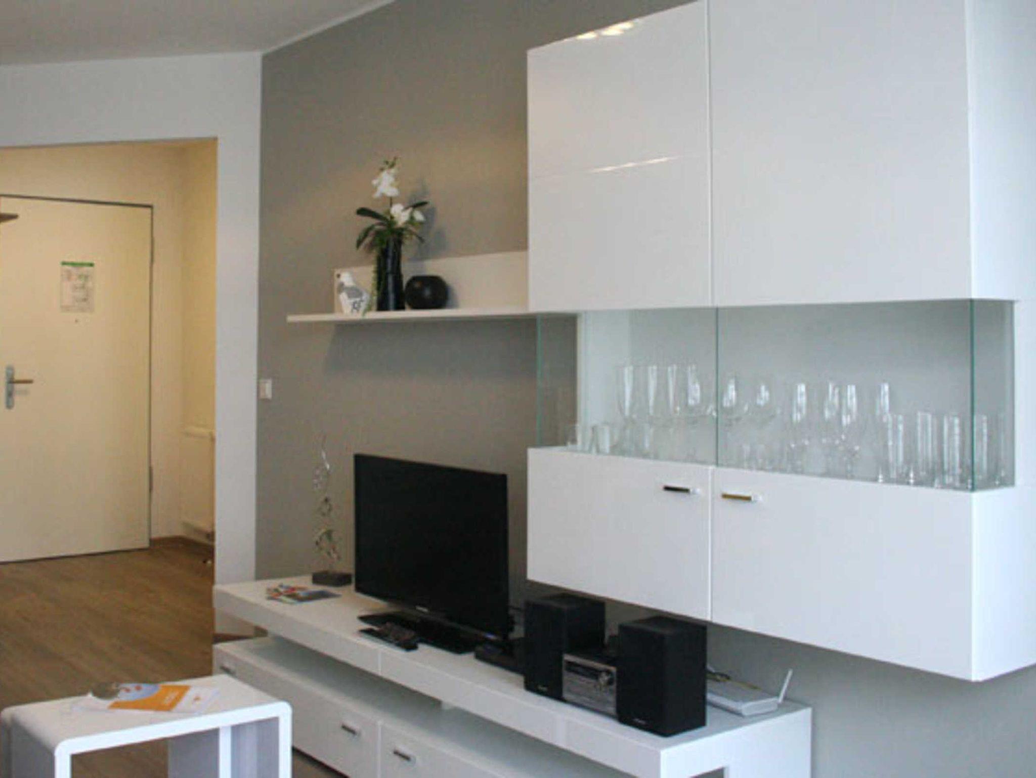 Die Wohnung verfügt über einen kombinierten Wohn- und Essbereich mit Fernseher, Schlafsofa und Esstisch für 4 Personen. Die harmonisch integrierte Küchenzeile ist mit einer Geschirrspülmaschine und einer Mikrowelle ausgestattet.