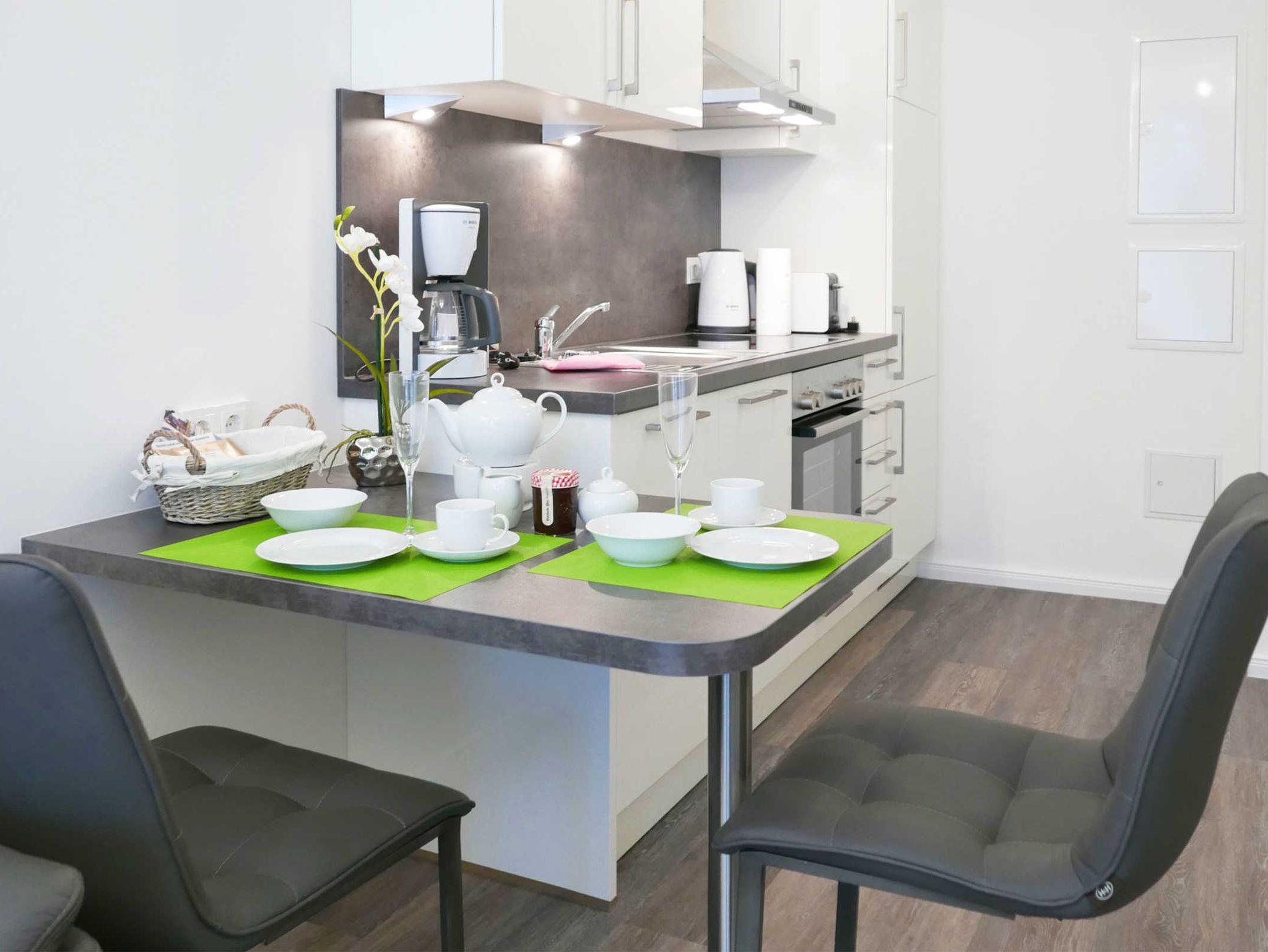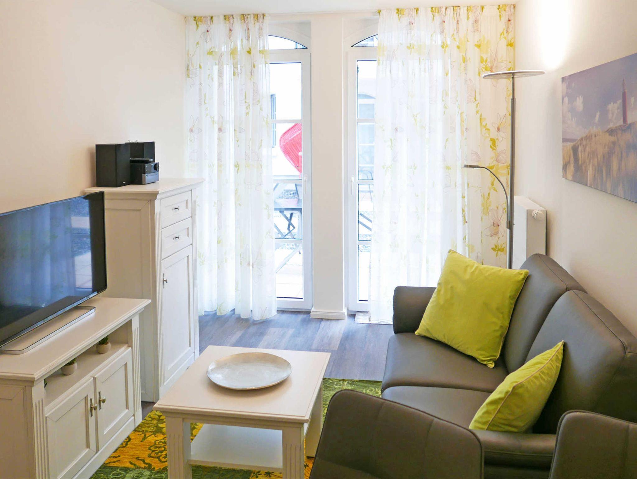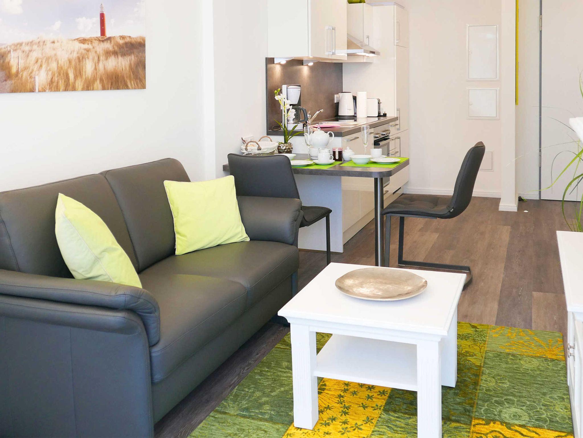 Der Wohn-/Essbereich verfügt über eine moderne Küchenzeile, einem Essplatz sowie einem gemütlichen Sofabereich und Zugang zu der Terrasse. Zwei Flachbildfernseher sind ebenfalls vorhanden. Grüne Farbakzente sorgen für eine freundliche Atmosphäre. Genießen sie den Blick ins Freie von der schönen kleinen Terrasse.