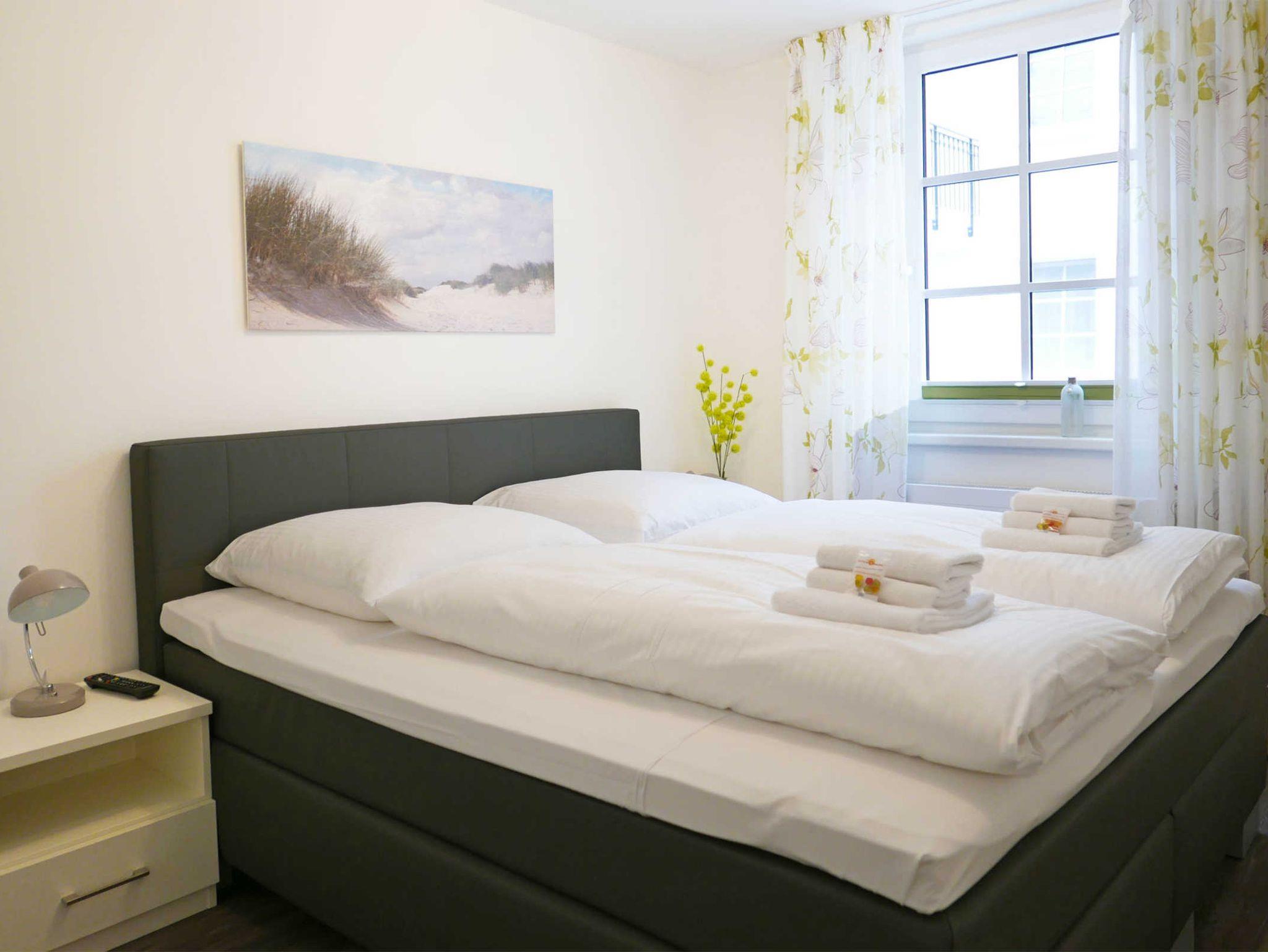 Das Schlafzimmer ist mit einem hochwertigen Boxspringbett (180 x 200 cm) ausgestattet.