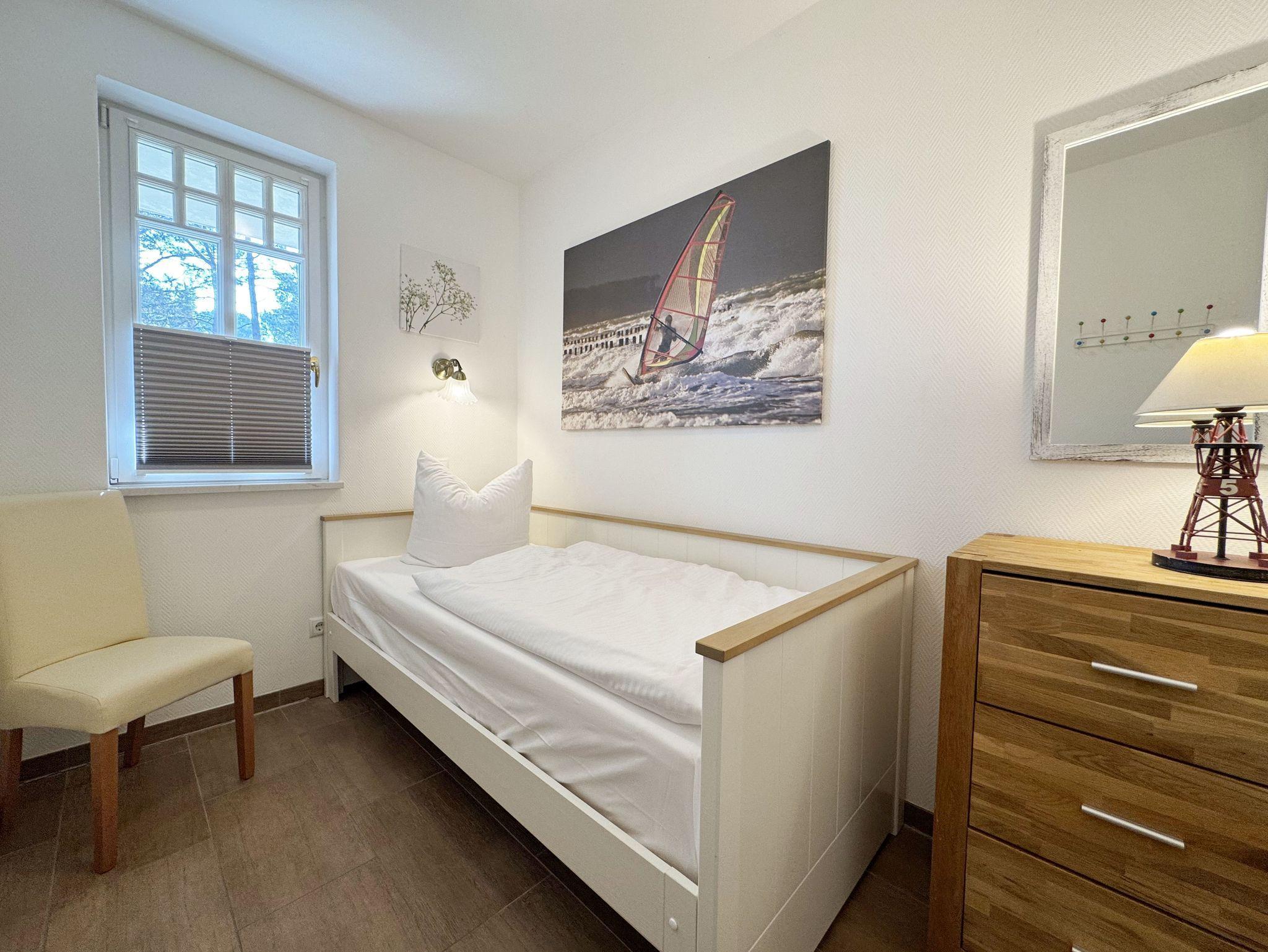 Die modern eingerichtete Nichtraucherferienwohnung 02 im Haus Strandkiefer befindet sich im Erdgeschoss. Sie bietet Ihnen mit ca. 56 m² ausreichend Platz für 2 bis 4 Personen + 1 Kleinkind bis 3 Jahre im Kinderreisebett. Vom Flur mit Garderobe gelangen sie in alle Räumlichkeiten. Der helle Wohn-/Essbereich besticht mit seinen bodentiefen Holzfenstern. Der Wohnbereich wurde mit einer Couch, einem Couchtisch, einem Sessel, einem TV-Board mit einem Smart-TV, einem WLAN-Zugang und einem Blu-Ray-Player ausgestattet. Abgerundet wird der Raum durch einen Kamin, der Ihnen gerade in der kälteren Jahreszeit, zusätzlich zur Fußbodenheizung, eine wohlige Wärme beschert. Die angrenzende Küchenzeile lässt keine Wünsche offen, so dass Sie mit einem Geschirrspüler, einem Backofen (selbstreinigend), einem Kühlschrank mit Gefrierfach, einem Cerankochfeld, einer Mikrowelle, einer Kaffeemaschine, einem Toaster, einem Wasserkocher, einem Mixer sowie diversen Küchenutensilien jede Mahlzeit zubereiten können. Zusätzlich finden Sie hier auch eine Waschmaschine mit Trocknerfunktion. Durch den Essplatz am Fenster wird der Bereich komplettiert. Ihre bestuhlte Terrasse (Ost) erreichen Sie vom Wohnbereich, von wo Sie auch einen ganz kleinen Blick auf das Meer erhaschen können. Das große Schlafzimmer verfügt über ein Doppelbett (1,80m x 2,00m), verstellbare Lattenroste, Nachttischablagen mit Beleuchtung, einem großen Kleiderschrank, Verdunklungsplissees sowie einem Flachbild-TV. Das kleine Schlafzimmer verfügt über ein Tandembett (0,90m x 2,00m) welches zusätzlich über eine Ausziehfunktion für die 4. Person verfügt sowie einer Kommode. Das innenliegende Badezimmer ist mit einer Dusche (flacher Einstieg), einem WC, einem Waschtisch, einem Kosmetikspiegel, einem Fön und einer Badewanne ausgestattet. Ein Wäscheständer sowie Reinigungsutensilien runden die Ausstattung ab. Ihre mitgebrachten oder geliehenen Fahrräder können Sie im kleinen abschließbaren Fahrradschuppen unterbringen. Dieser befindet sich direkt an Ihrem Carport (Nr.02) welches auch gleichzeitig Ihr Stellplatz für Ihren PKW ist. 2 Haustiere sind gegen eine Gebühr gern gesehene Gäste. Die Erstausstattung eines Wäschepaketes (komplette Bettwäsche, 1 Duschhandtuch, 1 kleines Handtuch) können Sie bis 14 Tage vor Anreise gegen einen Aufpreis dazu buchen oder durch eigenes Ergänzen. Ab 2 gebuchten Paketen erhalten Sie einmalig 1 Geschirrhandtuch und 1 Duschvorleger hinzu.