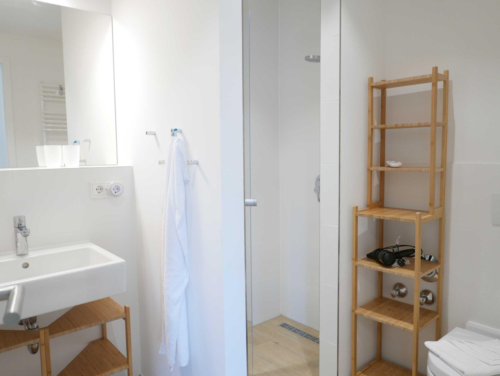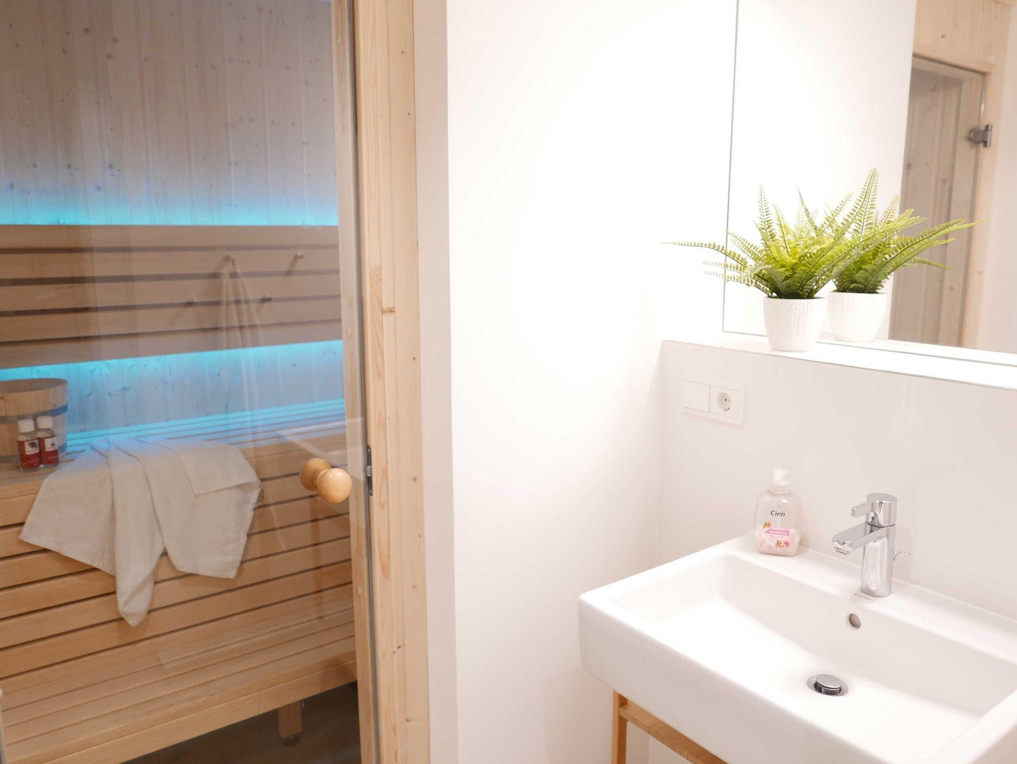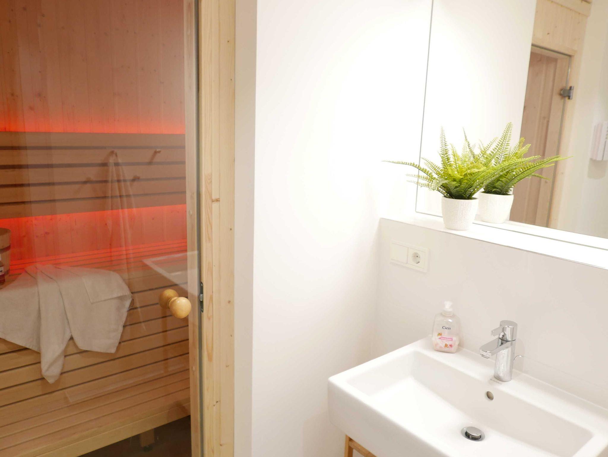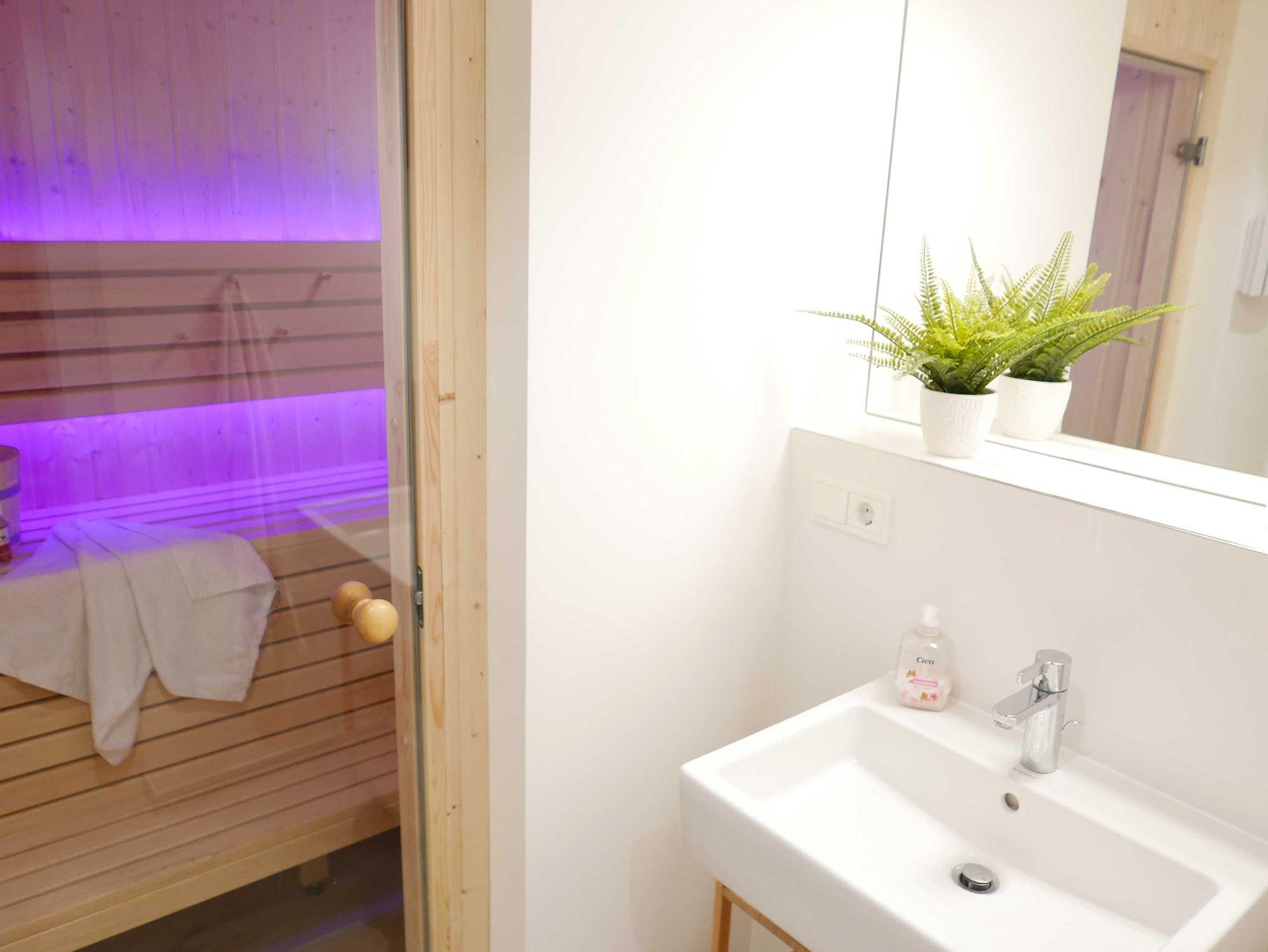 Über das Duschbadezimmer mit Handtuchheizkörper gelangt man in die Sauna.