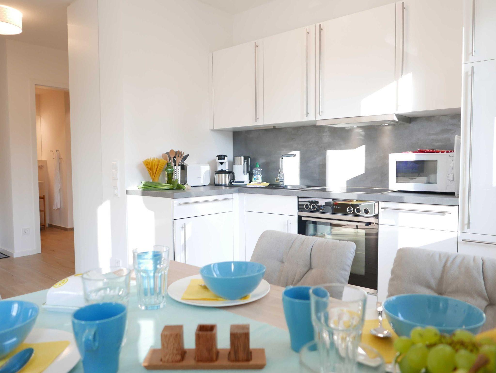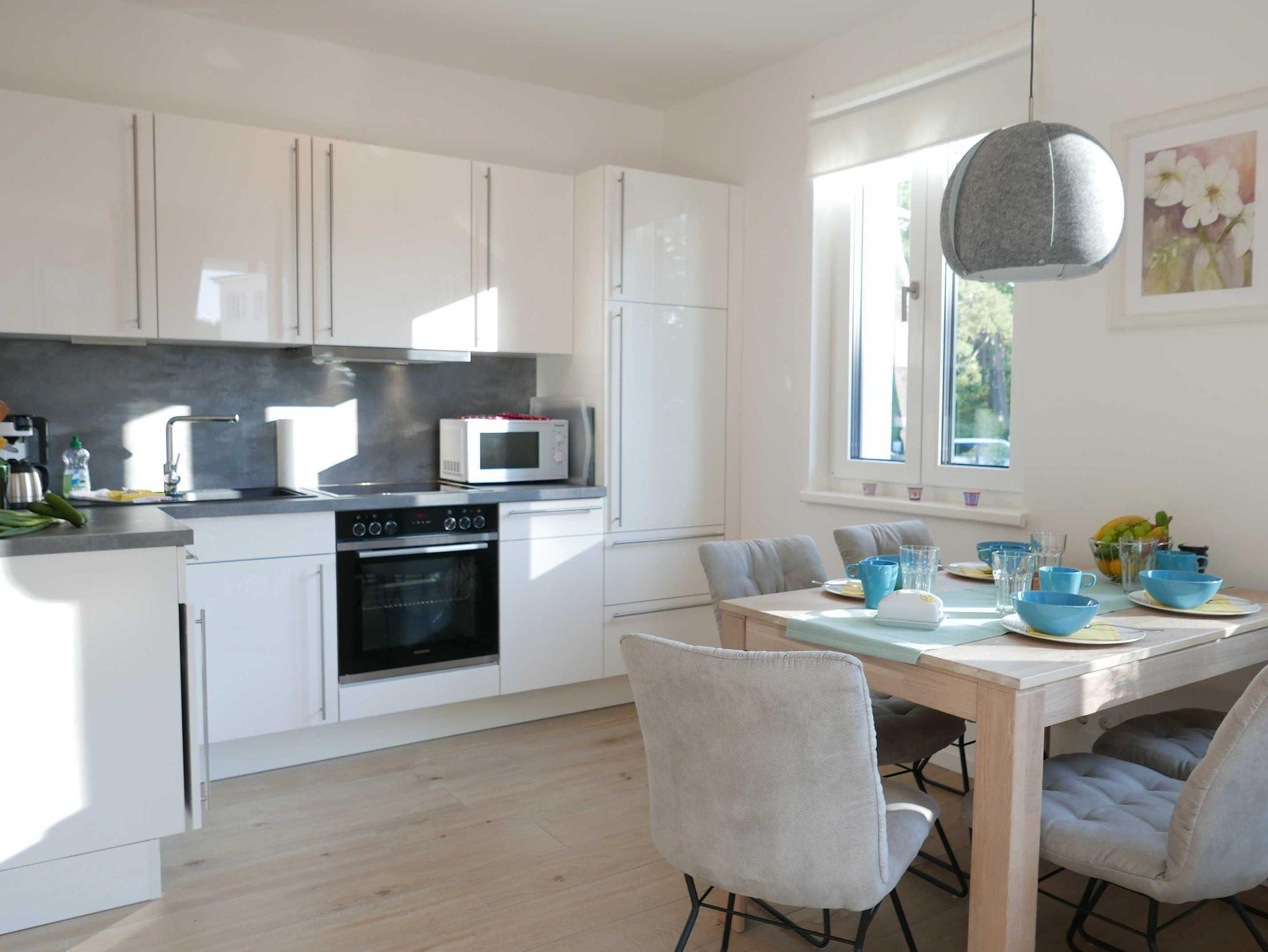 Die Küchenzeile ist ausgestattet mit 4-Platten-Ceranfeld, Kühlschrank mit Gefrierfach, Mikrowelle, Backofen, Geschirrspülmaschine, Toaster, Kaffeemaschine Senseo Switch (Pad und Filterkaffeemaschine), sowie Wasserkocher.