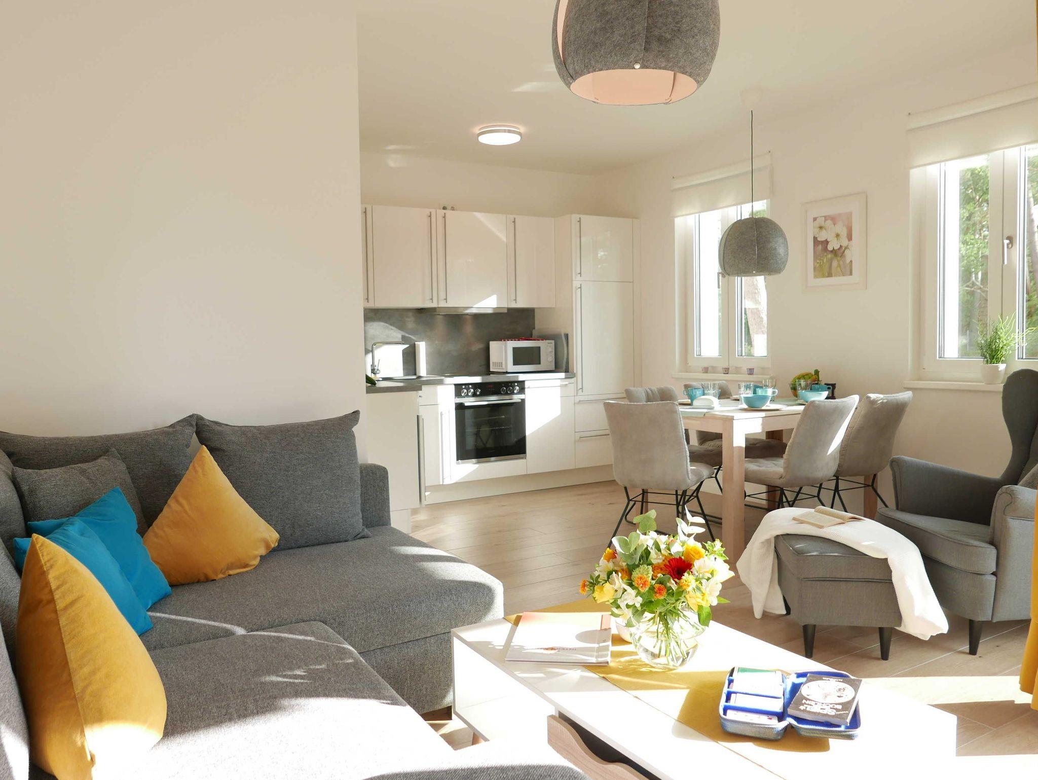 Luxus pur mit eigener Sauna in der Wohnung. Meerblick dazu. Freuen Sie sich auf erholsame Tage in dieser exklusiven 2-Zimmer-Ferienwohnung, die sowohl mit seitlichem Meerblick als auch mit einer privaten Farblichtsauna auftrumpft. In dem wohligen Wohnzimmer mit dimmbaren Lichtschaltern und integrierter Küchenzeile befindet sich neben einem gemütlichen Esstisch auch ein großes Schlafsofa für 2 Personen (ausgezogen mit den Maßen 150 x 200 cm).